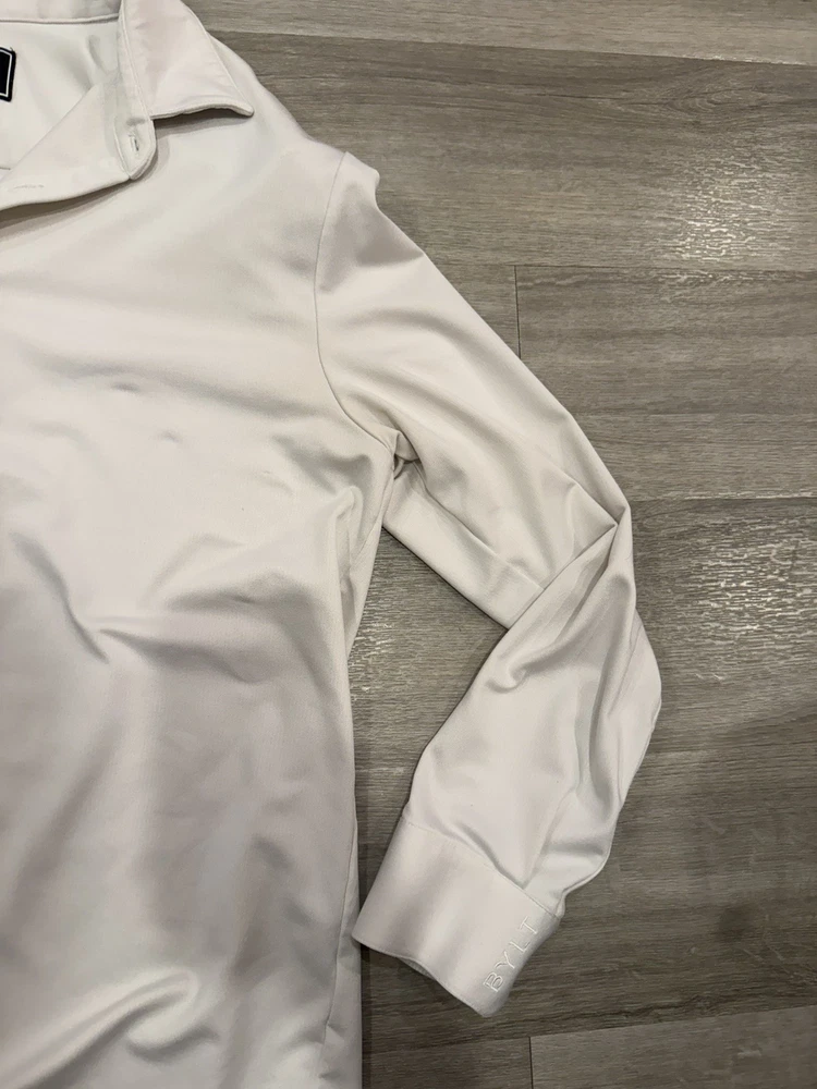 BYLT Basics Premium Executive Stretch Long Sleeve Button Down Shirt in a clean white colorway. Designed for modern professionals, this shirt delivers a polished, tailored look with performance stretch fabric that keeps you comfortable all day. The Executive Stretch fabric offers lightweight breathability, moisture-wicking properties, and a smooth, wrinkle-resistant finish. Ideal for office wear, business casual, formal settings, or date nights. Designed to look sharp whether worn tucked or untucked. Features: • Premium Executive Stretch fabric • 4-way stretch for comfort and mobility • Moisture & sweat-wicking • Stay-cool breathable technology • Wrinkle-resistant / easy care • Executive Fit (tailored, modern silhouette) • Can be worn tucked or untucked • Button-down long sleeve design ⸻ Condition: Pre-owned in very good condition. No holes or stains observed. Light natural wear with minor marks consistent with normal use. Please review all photos for exact condition and color tone. ⸻ Item Specifics: • Brand: BYLT Basics • Style: Executive Stretch Long Sleeve Button Down • Size: Men’s Large • Fit: Executive Fit / True to Size • Color: White • Sleeve Length: Long Sleeve • Fabric Type: Stretch Performance Fabric • Material: 91% Polyester, 9% Spandex • Occasion: Work, Business, Formal, Office, Date Night • Pattern: Solid • Closure: Button • Care: Machine Wash Cold, Tumble Dry Low ⸻ BYLT Basics shirt, executive fit shirt, mens white button down, stretch dress shirt men, wrinkle free dress shirt, business casual mens shirt, office wear men, formal shirt men, premium basics shirt, modern fit button down