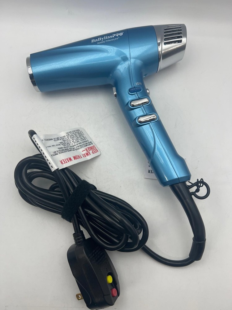 Condition: Open Box Grade A, All Attachments Included, Functions Properly. Get smooth, frizz-free hair at home with the BaBylissPRO Nano Titanium Dual Ionic Hair Dryer BNT9100. This professional tool blends advanced technology and simple controls. Enjoy fast, salon-quality hair styling with less effort. The nano titanium element pushes heat evenly across your hair. This means fewer hot spots and less risk of damage. Your hair looks healthy and has extra shine. The dual ionic technology can be turned on for less frizz and quick drying. Turn it off to get more volume and more texture. This flexibility lets you create many different styles, no matter your hair type. The BNT9100 is strong but also very comfortable to use. It feels light in your hand and is carefully shaped so your wrist does not ache, even after long drying sessions. The handle has a digital panel with three precise heat and three speed settings. Use the true cold shot button to lock in your look, keeping styles fresh all day. The controls allow for total customization, from gentle heat for fine hair to powerful airflow for thick or curly types. This nano titanium hair dryer comes with a 9-foot cord. Move easily and style hair from different angles. The box includes helpful attachments. There are two nozzles with cool tips for focused drying. Use the straightening pic to smooth out curls. The diffuser lifts and shapes waves and curls. Find your perfect style, whether you want hair that is straight, full, or bouncy. BaBylissPRO tools are trusted by professional stylists. The brushless motor in the BNT9100 runs quietly and lasts longer than old designs. It stands up to daily use and resists overheating, making it a smart investment. If you want to learn more about nano titanium, see the Wikipedia page on titanium dioxide. This blow dryer helps protect your hair. Nano technology lessens heat damage and keeps your hair's natural bounce. With its digital controls and included attachments, you get the freedom to try new looks at home—without fear of damaging your hair. Bring salon-level styling into your daily routine. The BaBylissPRO Nano Titanium Dual Ionic Hair Dryer BNT9100 delivers performance, ease of use, and options you can trust. Its innovative details give you confidence and control every time you style. For a complete range of beauty and styling products, browse our personal-care collection.