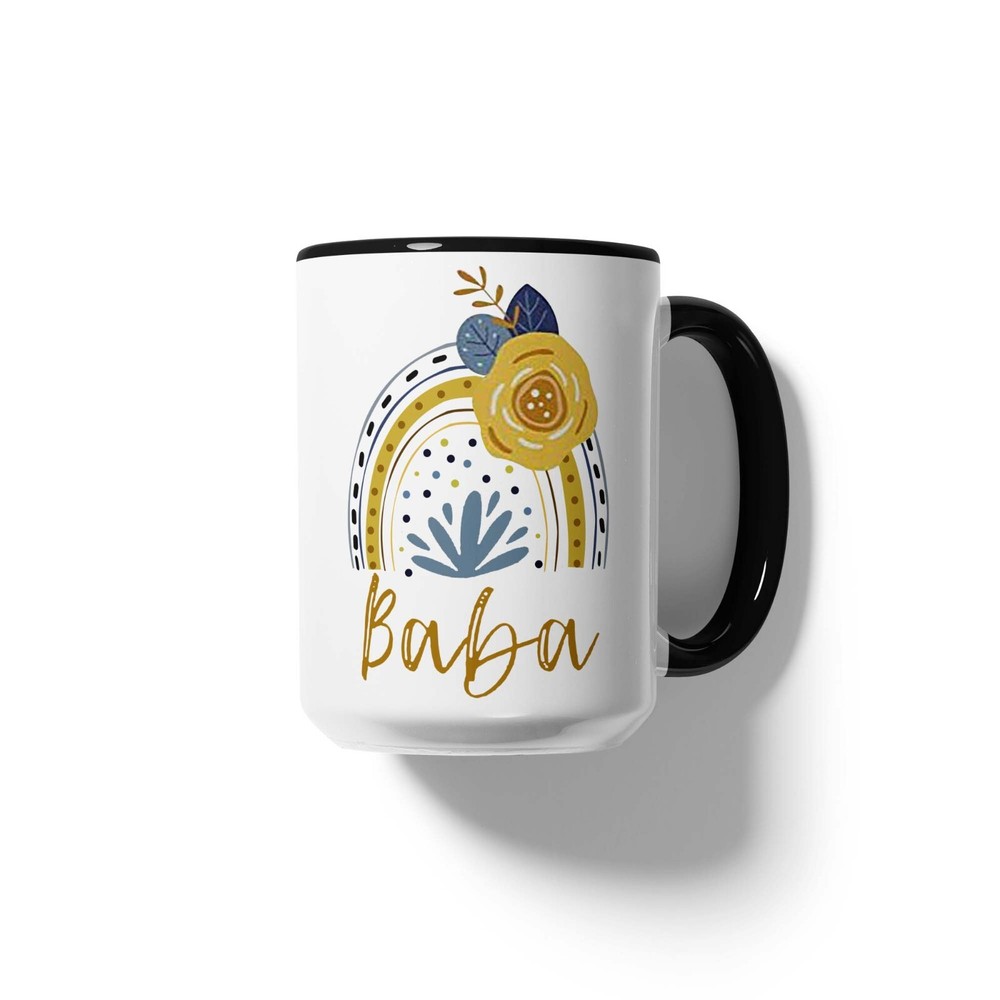 The Baba Rainbow Mug is a novelty coffee mug with a unique design featuring a rainbow pattern, making it a perfect gift idea for Ukrainian grandmas. Crafted from ceramic and with a capacity of 11oz, this white mug stands at 3.75 inches tall and 3.14 inches wide. Proudly made in the United States, this special mug is ideal for enjoying a cup of coffee or tea while celebrating a new pregnancy or baby reveal.