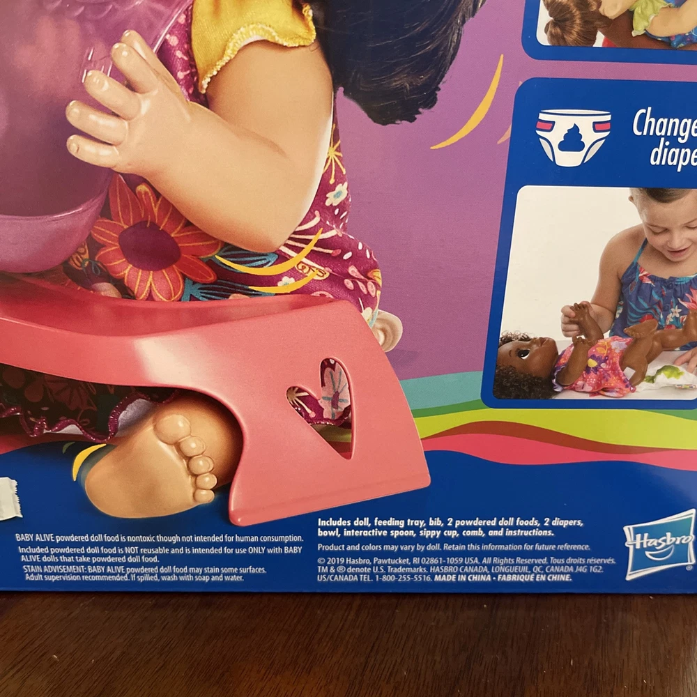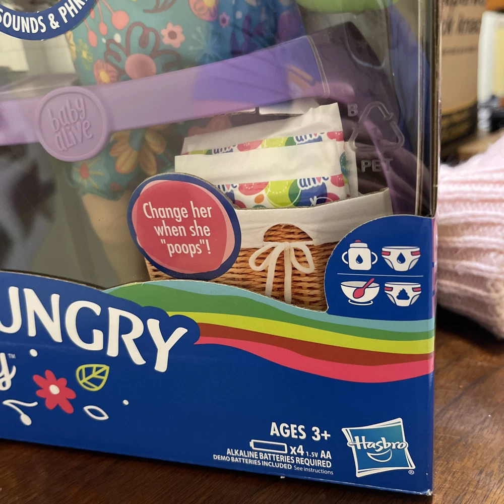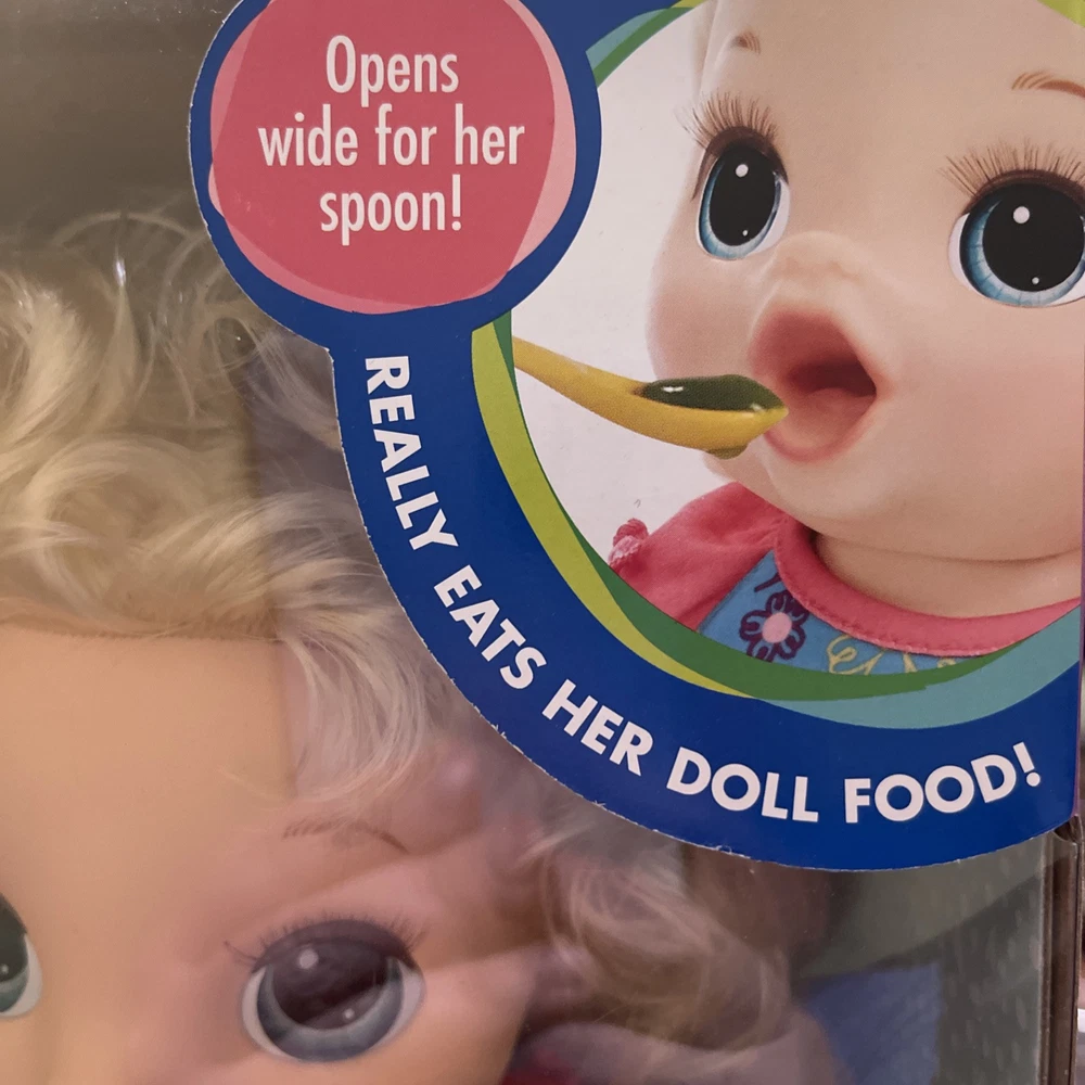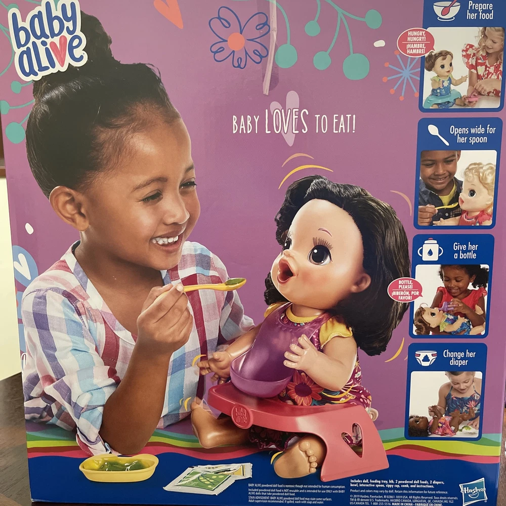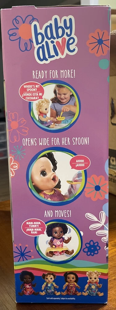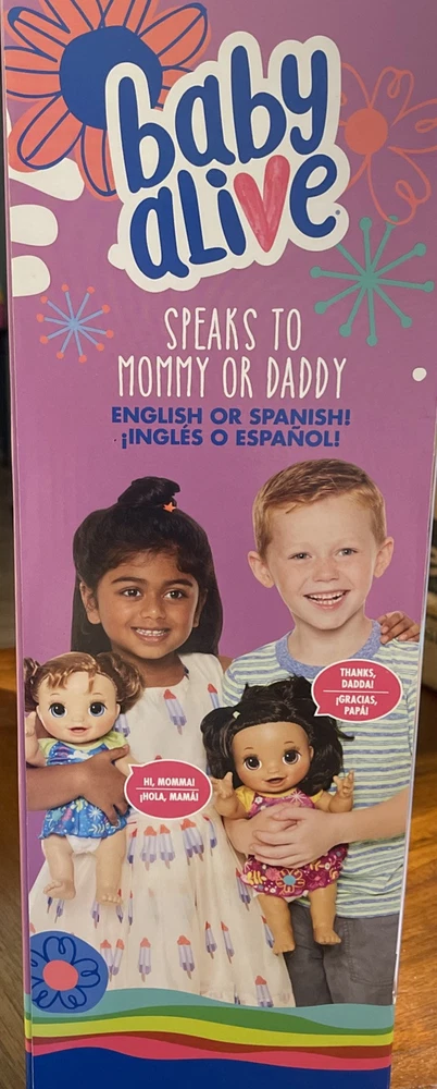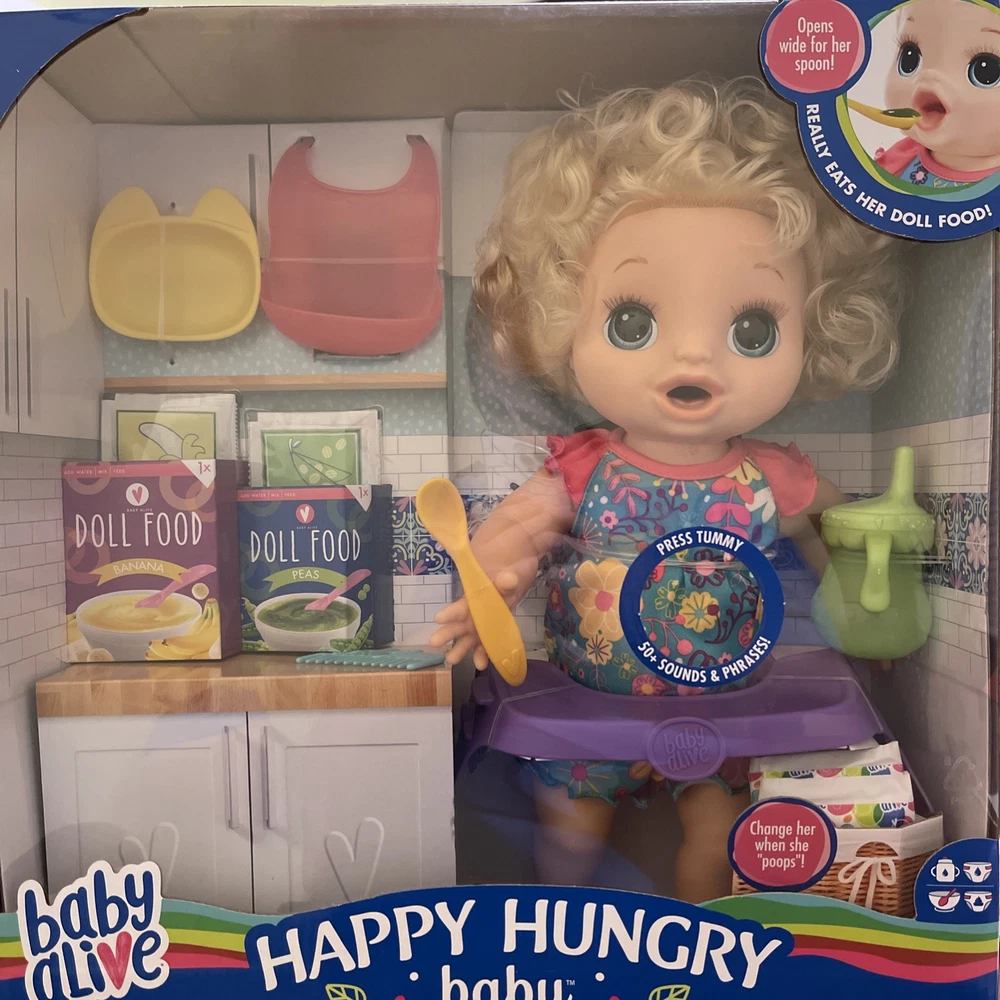 The product is a Baby Alive Happy Hungry Baby doll with blonde hair, designed to cater to young children who enjoy playing with baby dolls. This particular doll is bilingual, featuring English and Spanish phrases, adding an educational element to playtime. The doll is themed around babies and is perfect for children who enjoy caring for and nurturing baby dolls. It comes with interactive features that allow kids to feed the doll and engage in pretend play scenarios, making it an engaging toy for young children.