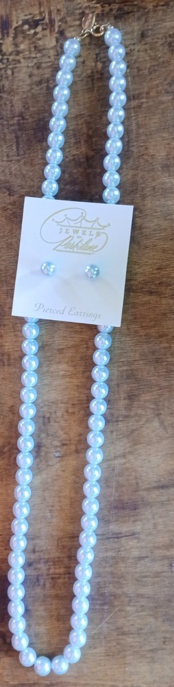 The Baby Blue Pearl Princess Necklace/Earrings Set by Jewels by Parklane is a beautiful and timeless piece of jewelry. This handcrafted set includes a pair of stud earrings and a necklace, both featuring light blue faux pearls set in a gold tone metal. The set is signed by the brand and has a vintage feel, making it perfect for any occasion. The pearls are round in shape, adding to the overall elegance and beauty of the accessories. Made in the United States, this jewelry set exudes a sense of princess-like charm and sophistication.