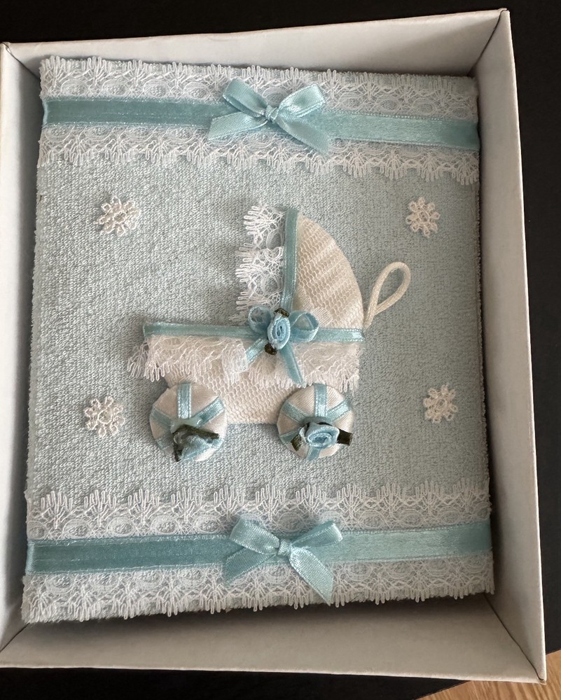 Brand new Baby Boy Photo Album with blue lace, ribbon, and stroller design. Comes in original box. Album has never been used. Box shows minor storage wear, but album inside is clean and untouched. • Holds up to 100 photos • Fits 3.5x5” or 4x6” pictures • PVC-free and photo safe • Cute vintage baby shower or newborn keepsake