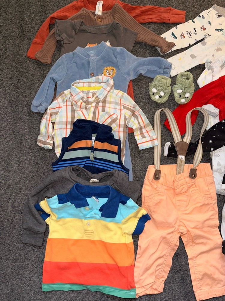 Newborn - 1 0-3 month - 7 3 - 6 m - 3 6-9 m - 1 12m - 2 Shoes size 2 Total 14 outfits and 2 shoes This lot of 16 pieces of baby boy clothes includes a variety of sizes from 0-3 months to 12 months, with a mix of bodysuits and shoes in size 2. The outfits are perfect for casual occasions and feature a round neck and snap closure. The clothing is made from a blended fabric and available in multicolor, with a cute animal and classic theme. Ideal for all seasons, this assortment of one-piece outfits is from assorted brands and is a great addition to any little boy's wardrobe.