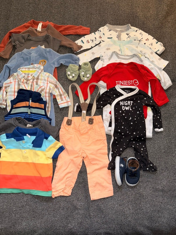 Baby Boys Clothes Lot of 16 Pieces Size 0-3, 3-6, 6-9, 12m, Shoes Size 2