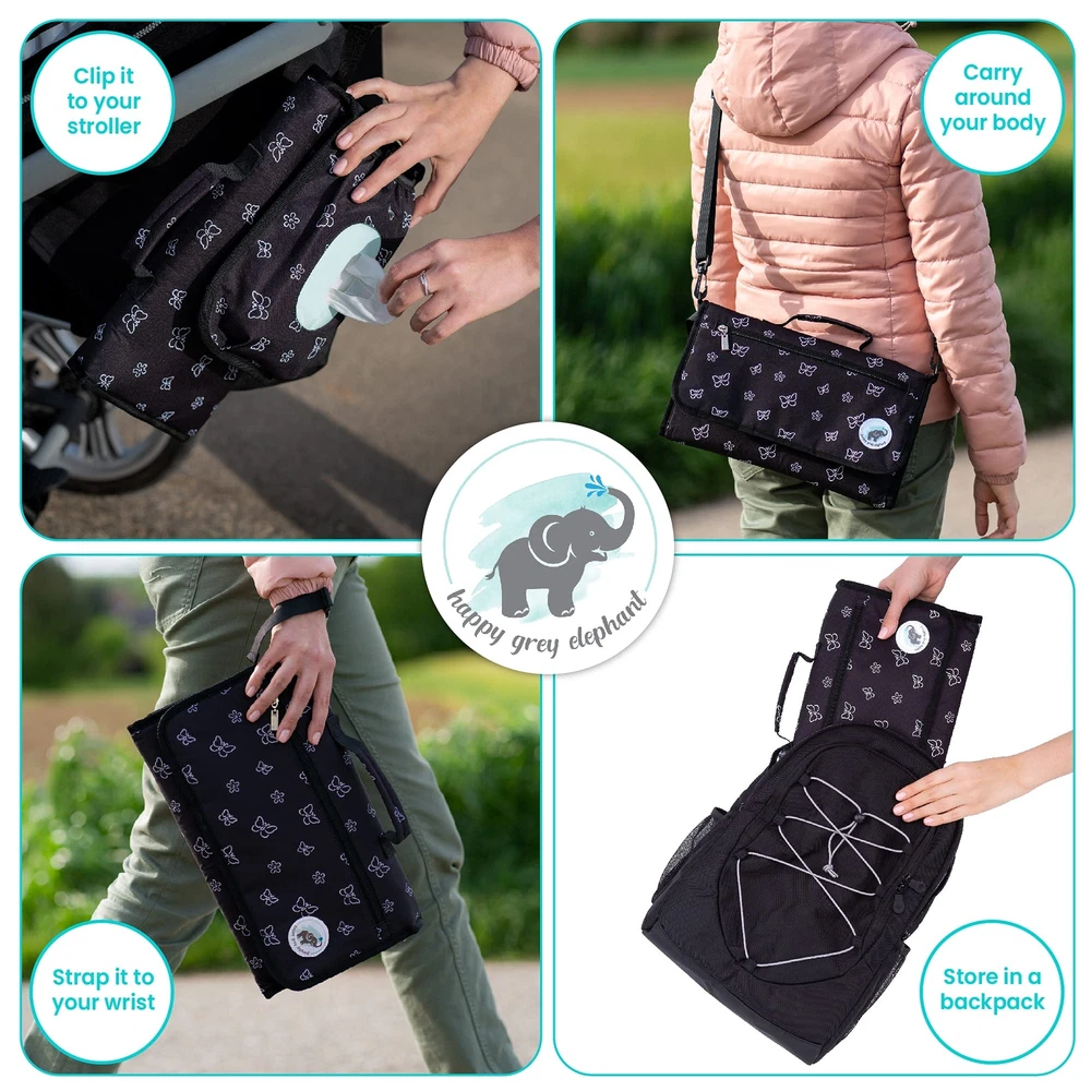 PORTABLE ALL IN CHANGING PAD It doesn’t matter if you are in the park, on a road trip or just at home – the changing pad from makes diaper changing easy, clean and convenient in any location EASY TO CARRY - Use the attachable shoulder strap to carry the bag or use the side strap to attach the clutch to your wrist or clip it to your stroller. FIND SPACE FOR EVERYTHING YOU NEED - The large wipe pocket holds up to 100 at a time and has a large opening for easy access. The Diaper pocket fits a minimum of 5 diapers and the zip pocket in the front can be used to creams, baby items, your keys or cell . SAFE CLOSING AND HAND OPENING - The extra large hook and loop in the front s a save closing, even when the bag is full. You can open the bag with hand whilst holding your baby at the same time. ACCESSABLE WIPE POCKET - Sometimes you need a wipe from the bag fast. This is no porblem with the accessable inside or out wipe pocket. PADDED PILLOW AND WATERPROOF PAD - The padded pillow ensures that your babys head is comfortable while changing. The waterproof changing pad is easily san It'sed with a wipe, insuring it is hygienic and clean for the next time. PERFECT BABY SHOWER GIFT - The gender neutral changing pad is perfect for your own baby registry must have list or as a baby shower gift. Change your baby’s diaper anytime and anywhere with the portable changing pad from . The Portable Diaper Changing pad is protected with a 30 DAY MONEY BACK so you can make sure you get the best portable changing pad around. ADD TO YOUR CART TODAY CONVENIENT PORTABLE DESIGN - The compact and lightweight design of the travel changing pad makes it easier to carry and change nappies at any time. For convenience, the mat includes a long, adjustable shoulder, wrist or stroller strap and a built-in carrying handle. COMFORT AT ITS FINEST - We made the baby changing pad liner to give your baby the topmost comfort during changing times. The portable changing station has a built-in pillow to support your baby's head and an insulated padded surface to wriggle on. MULTI-FUNCTIONAL BABY ESSENTIALS ORGANIZER - This portable diaper changing pad gives ample storage pockets to hold an entire 100 pack of , a minimum of 5 diapers, and the zipped pocket hold creams and other essentials to keep your things organized. SMART POCKET - These newly designed pockets are on point with their purpose. Whether the portable changing pad for the baby is open or folded, the pocket grants you easy access that you'll never be bothered looking for your again! PRACTICAL BABY SHOWER GIFT - This portable diaper changing pad is perfect as a gift. Ideal not only for home usage but also for short or long travels, and camping to keep your little fresh and dry no matter the place. The adorable design, extra space, and soft padding make this a must-have for parents! SLEEK AND TRENDY STYLE - Its rapid-open buckle and shoulder strap allow you to carry the travel changing pad around or wear it on your wrist like a purse. Its stylish aspect is perfect for mommas out there! It can be attached to your stroller or headrest while you keep your hands holding your little munchkin! THE IDEAL HYGIENE - Your hygiene is our priority. The outside fabric and the unique folded features of the portable diaper changing pad keep your mat dry and stain-free, protecting it from unwanted surface dirt during travel. Its waterproof attribute makes it easy to clean. SAFE CLOSING AND HAND OPENING - The extra large hook and loop in the front guarantees a save closing, even when the bag is full. You can open the bag with hand whilst holding your baby at the same time.
