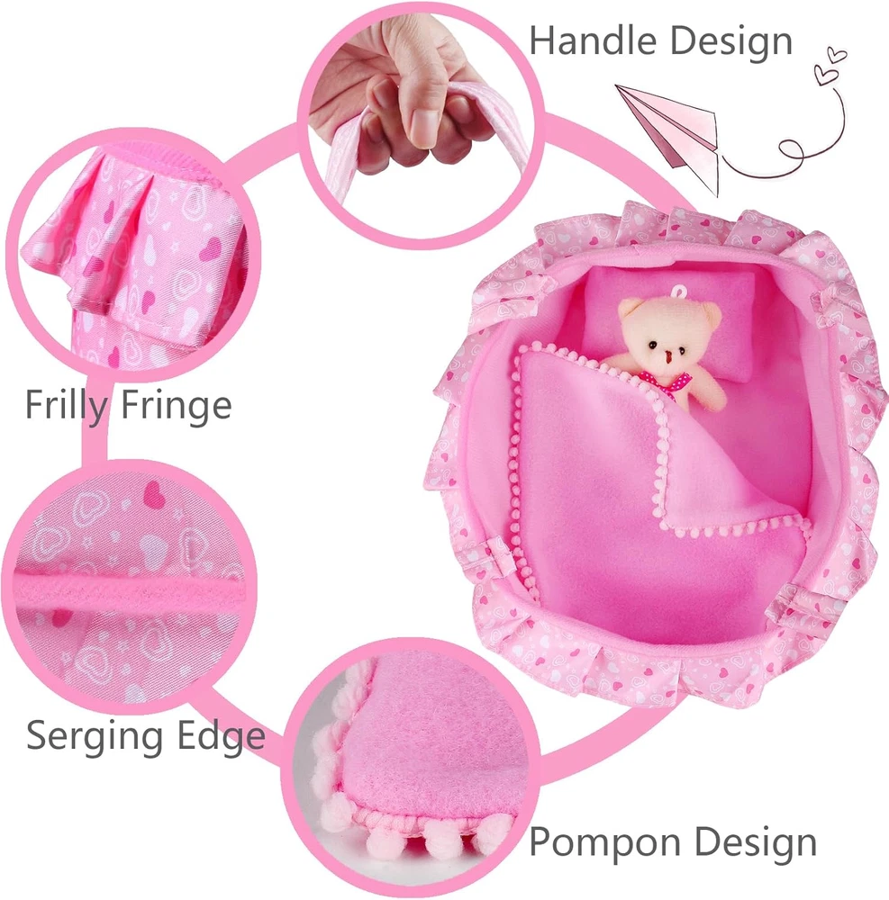 Store New Arrivals Add to Favorite View Feedback Contact Baby Doll Cradle Bassinet Carry Bag with Soft Pillow, Quilt & Bear for 8-12 Inch Dolls Baby Doll Cradle Bassinet Carry Bag with Soft Pillow, Quilt & Bear for 8-12 Inch Dolls Product Description Baby Doll Cradle Bassinet Playset – Portable Doll Bed with Accessories Introduce your little one to the world of imaginative play with this Baby Doll Cradle Bassinet . Designed for 8-12 inch dolls , this adorable cradle doubles as a portable doll carrier and cozy doll bed , offering everything needed for pretend play. Complete with a soft pillow , quilt , and a cute bear , this set provides a safe, comfortable space for baby dolls to rest, sleep, and travel. Features Portable & Versatile : This doll cradle bassinet can easily be used as both a bed and carrying bag , perfect for on-the-go play. Complete Accessories : Includes a soft pillow , cozy quilt , and a cute bear , ensuring your baby dolls are comfortable and content. Ideal Size : Fits dolls sized 8 to 12 inches , making it suitable for various types of smaller baby dolls. Encourages Pretend Play : Perfect for young children to engage in imaginative play , teaching them nurturing and caring behaviors. High-Quality Materials : Crafted with soft, child-safe fabrics to ensure a gentle touch for dolls and easy cleaning for parents. Cute & Practical Design : The soft, inviting design makes this set a great addition to any toy collection, while the carrying handle allows for easy portability. Specifications Set Includes : 1 Baby Doll Bassinet, 1 Soft Pillow, 1 Quilt, 1 Bear Doll Compatibility : Fits 8-12 inch dolls Materials : Soft fabric and plush materials for comfort Color : Multi-color (including soft pastel hues) Recommended Age : Suitable for children aged 3+ years Possible FAQs What size dolls does this cradle fit? This cradle is designed for 8-12 inch dolls , such as smaller baby dolls and alive baby dolls . Is the cradle portable? Yes, the cradle functions as a portable doll carrier , complete with a carrying handle for easy transport. What accessories come with the cradle? The set includes a soft pillow , a cozy quilt , and a cute bear , ensuring your dolls have everything they need for comfort. Can this cradle be used for different types of dolls? Yes, this cradle fits smaller dolls ranging from 8 to 12 inches , including many popular baby doll brands. Is this cradle machine washable? The materials are generally easy to clean , and the fabric can be wiped down with a damp cloth for maintenance. What age group is this cradle suitable for? This cradle is recommended for children aged 3 years and up , perfect for those who enjoy pretend play . Does the cradle have a firm or soft base? The cradle has a soft, cushioned base to ensure your baby dolls rest comfortably. Is the cradle collapsible or foldable for storage? While not collapsible, the lightweight design makes it easy to store when not in use. Can the accessories be used with other dolls? Yes, the pillow, quilt , and bear can be used with other 8-12 inch dolls and accessories. Is this cradle suitable for boys or girls? This cradle is suitable for both boys and girls , as it encourages nurturing and creative play for any child. Item Weight 3.52 ounces Product Dimensions 6 x 3 x 0.5 inches Manufacturer recommended age 3 years and up PRODUCT DIMENSIONS : 3.0 inches x 6.0 inches x 0.5 inches. Weight: 3.52 oz About Us Welcome to Perishey, your premier destination for high-quality products at unbeatable prices. Our commitment to excellence ensures that you receive top-notch service and premium items across a variety of categories. Our professional customer support team is always ready to assist you with any inquiries or needs, ensuring a seamless shopping experience. We take pride in serving you and strive to bring a smile to your face with our exceptional service and products. Visit our eBay store to explore our full range of offerings and discover the great deals we have in store for you. Thank you for choosing Laelegencia. Payment policy We have eBay Managed Payments, allowing you to pay with any payment method that eBay accepts. Please ensure that your shipping addresses are accurate. Immediate payment is required before we can send out your package. Shipping policy We are always working hard to ensure your package arrives as soon as possible. Please understand that some factors like weather, high postal traffic, and the performance of shipping companies are outside of our control. In most cases, your package will arrive before due time as it is a high priority for us. If there are any unexpected delays, please let us know and we will take care of it immediately. We have multiple locations in the US; residents of these states will be charged tax according to the state they reside in. Tax information is available at checkout. Returns We are committed to your happiness. That’s why we offer a 30-Day Return Policy on items that you are not completely satisfied with. You have the option for a refund or an exchange of the item. No returns are available on items shipped outside of the USA.