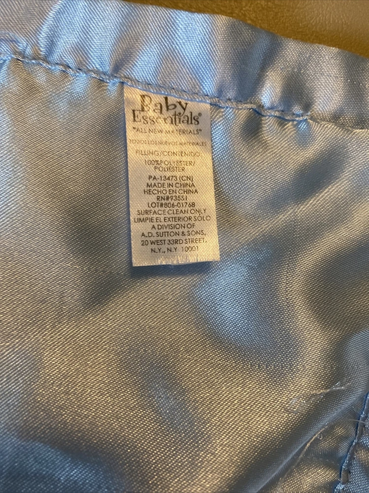 Gender:BoysFeatures:Easy CareType:Security BlanketSize:14"Brand:Baby EssentialsTheme:Dogs & Puppiesgtin13:Does not applyUPC:Does not applyModel:Baby Essentials LoveyMaterial:PolyesterColor:BlueSeller Notes:“No stains or holes...a few pulls on the back satin...overall very good”