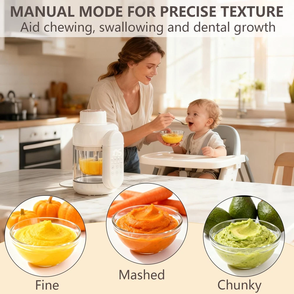 baby food maker 【Convenience and Time Saving】Baby food maker seamlessly integrates steaming, blending, and chopping capabilities, just one step to make vegetable, fruit, fish or meat for your baby. You can use it without much difficulty. 【100% Safe Baby Food Maker】 Baby food steamer comes a durable glass bowl and a glass reservior, it is much safer than Tritan and plastic, you can trust that every meal you prepare is safe and healthy for your baby. 【Durability and Reliability】 Baby food processer is equipped 6 high-quality stainless steel precision blades, and a powerful motor, effortlessly transforms an array of meat, fish, veggie, nuts and fruit into silky purees. 【Preserving Food Nutrition Tech】The all in one design of our baby puree maker, that minimizing nutrient loss furing processing, and protects water-soluble vita-mins B and C by while steaming. Ensures maximum nutrition in every meal. 【Easy to Clean】Food maker has self clean mode, make it easy to clean. Each component of baby blender is easily detachable for swift cleaning, and dishwaher safe, while the included cleaning brush ensures no crevice is left untouched. Non-stick coating ensures no more limescale. 【Saving Time and Money】With a generous 11 oz capacity, Bowl has graduation markings for easy measuring. You can prepare a day's worth of fresh and nutritious meals for your baby, saving you valuable time and effort in the kitchen. 【Gift Giving for Parent】 Ideal for baby showers, Thanksgiving, or Christmas, our baby food blender comes with a recipe book to help create nutritious meals. We provide a 1-year warr-anty, 24/7 customer service, and lifetime technical support. For any concerns, please feel fre-e to contact us. 【Timer】: The auto-timer function is especially helpful, as it lets you set it and walk away while it steams. 【Compact Size】: 10*5*6", so compact that it fits on any countertop. 【Recipe Inspiration】: The included recipe guide provides drink and dish making inspiration.