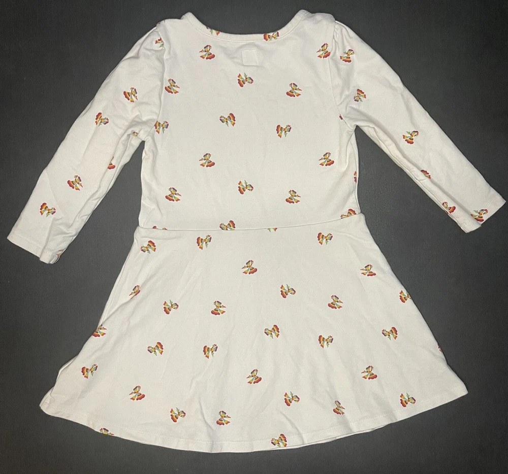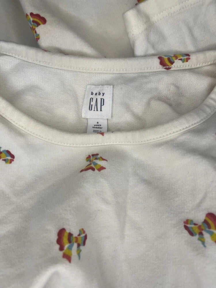 This baby Gap dress is perfect for your little girl's wardrobe. The long-sleeved dress comes in a size 4 and features colorful bows that add a touch of cuteness to the knee-length dress.