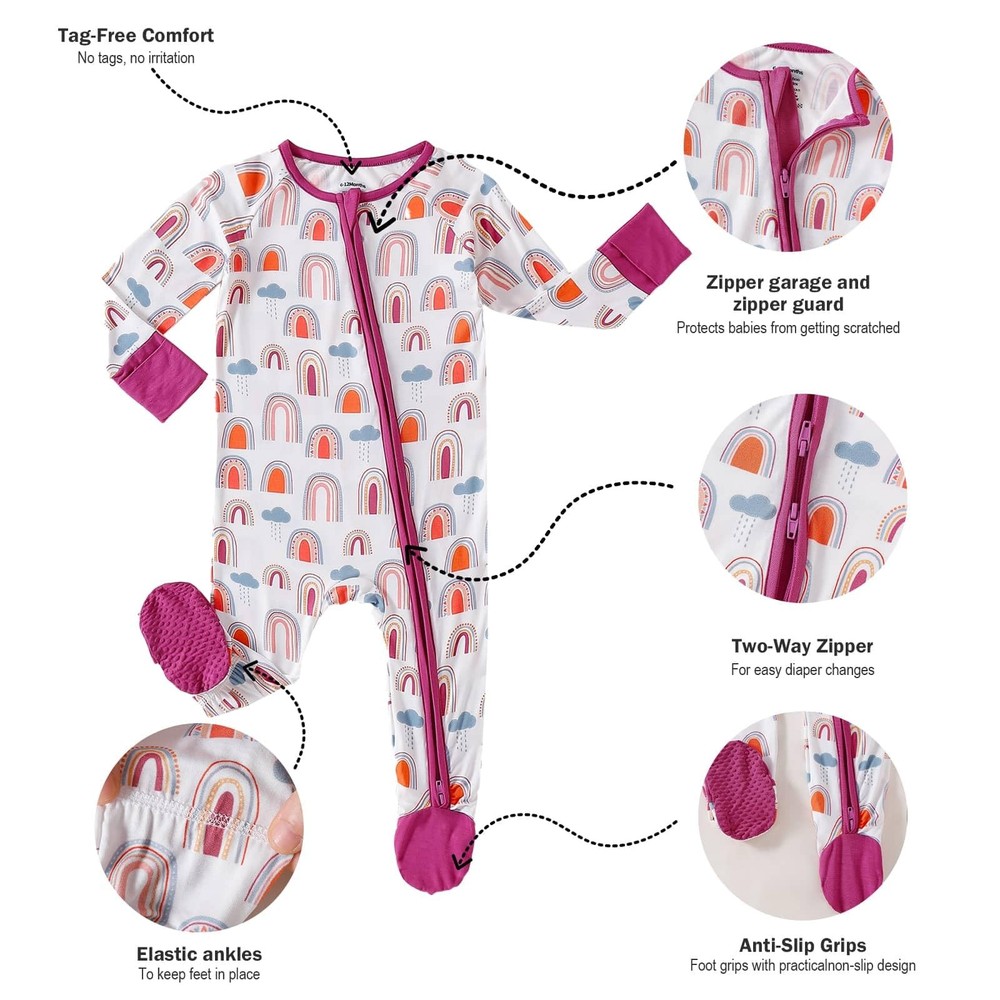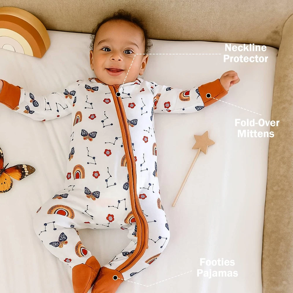 Baby Pajamas: Where Nature Meets Nurture for Your Little ’s Comfort Imagine your baby wrapped in cloud-soft fabric that breathes with their delicate skin—our baby sleepers are designed to deliver unmatched comfort while making parenting simpler. Crafted from natural viscose fiber, these baby onsies are 40% more breathable than cotton, wicking moisture away to keep your newborn cozy without overheating—perfect for baby girl pajamas or baby boy pajamas that adapt to daywear, playtime, or bedtime. Why Parents Love These Baby Sleepers: Gentle on Skin: The hypoallergenic viscose fabric is ideal for sensitive skin, reducing irritation. Smart Design: The double-zipper allows effortless diaper changes, while the chin guard and inner lining prevent scratches. Built-in mitten cuffs protect faces from accidental scratches, and non-slip soles with ankle grips keep the outfit in place as babies kick and explore. All-Day Versatility: Whether it’s long sleeve onsies for boys/girls during outdoor strolls or infant sleepers for naptime, the stretchy fabric moves with your . More Than Just Pajamas: These newborn sleepers blend functionality with charm—playful prints make every photo worth sharing on social media, and the durable fabric withstands countless washes. Give Your Baby the Gift of Comfort: Choose baby pajamas trusted by parents who prioritize safety, ease, and organic materials. Because happy babies start with clothes that care as much as you do. Soothe your baby's delicate skin with ultra-soft baby pajamas that breathe naturally, preventing irritation while keeping them cozy all day long Move freely without restrictions – our baby sleepers stretch gently with your baby’s every wiggle and kick, ensuring unrestricted comfort for playtime and naps Change diapers in seconds thanks to the convenient 2-way zipper design, while built-in zipper guards and a protective chin cover keep your newborn safe from scratches Protect your little from head to toe with anti-scratch mittens, non-slip footie grips, and elastic ankle for a secure fit—no more slipping or accidental face scratches The perfect gift for new parents – these unisex baby pajamas fit infants 0-24 months, making them ideal for birthdays, holidays, and everyday snuggles in any season