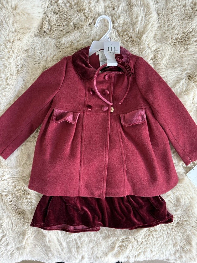 Elegant girls’ set by Haute Hippie Style. Includes: • Burgundy wool-blend coat with velvet collar, velvet buttons, and decorative bow • Burgundy velvet dress • Ivory cable-knit sweater with embroidered floral detail • Matching velvet headband Size / Age: 3–4 years Condition: New with tags Perfect for holidays, family events, photos, or special occasions.