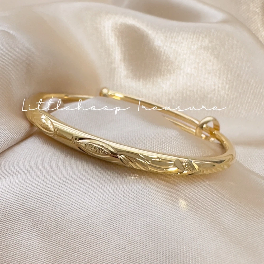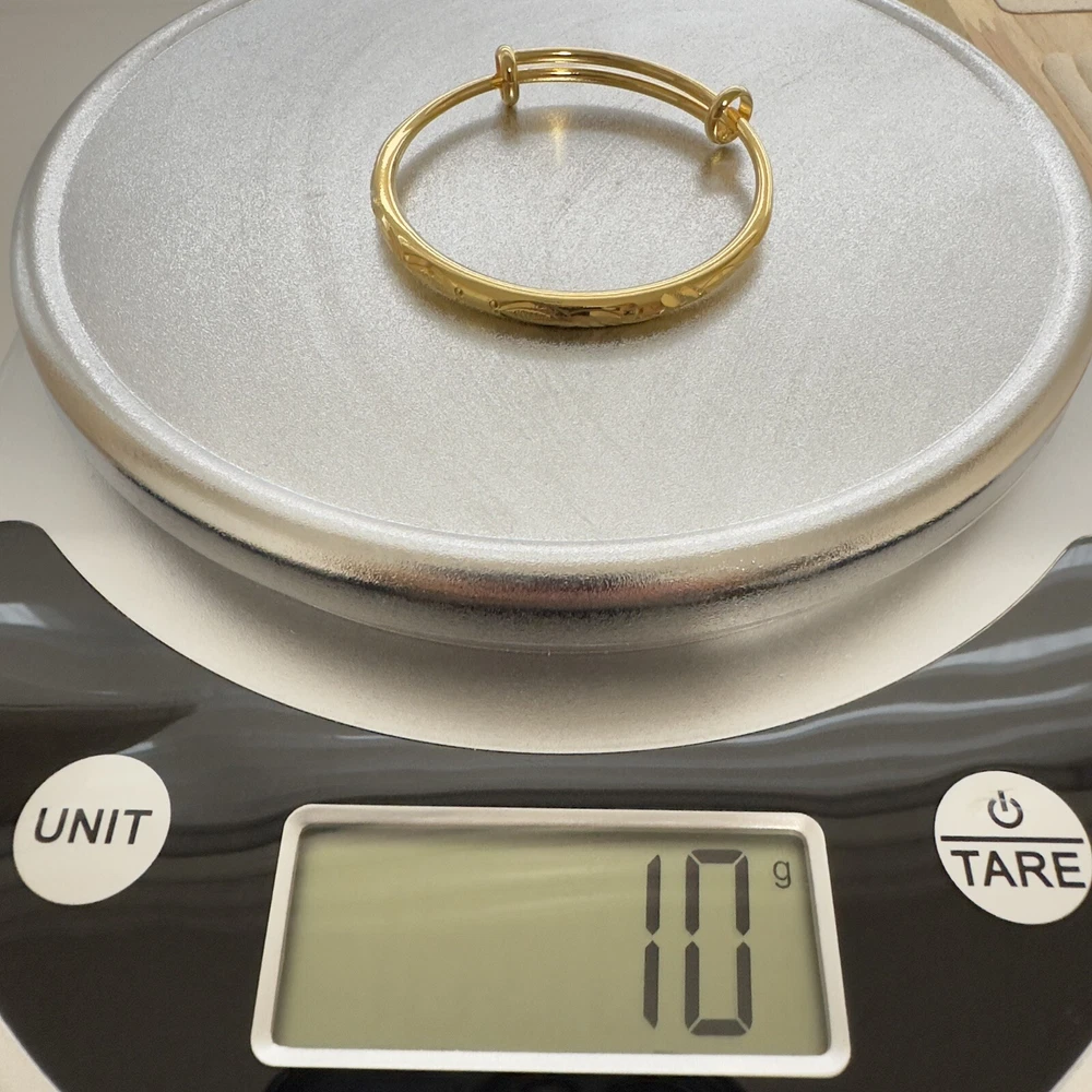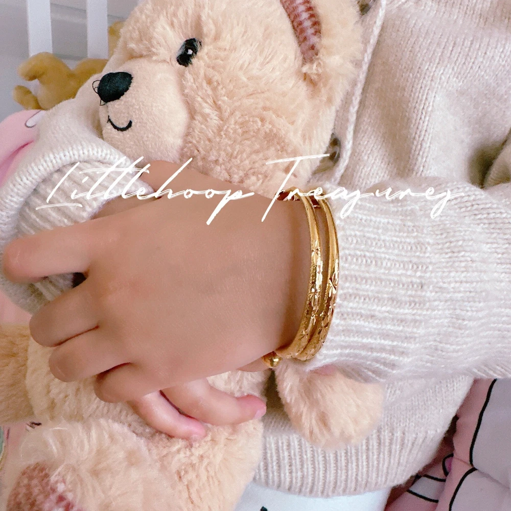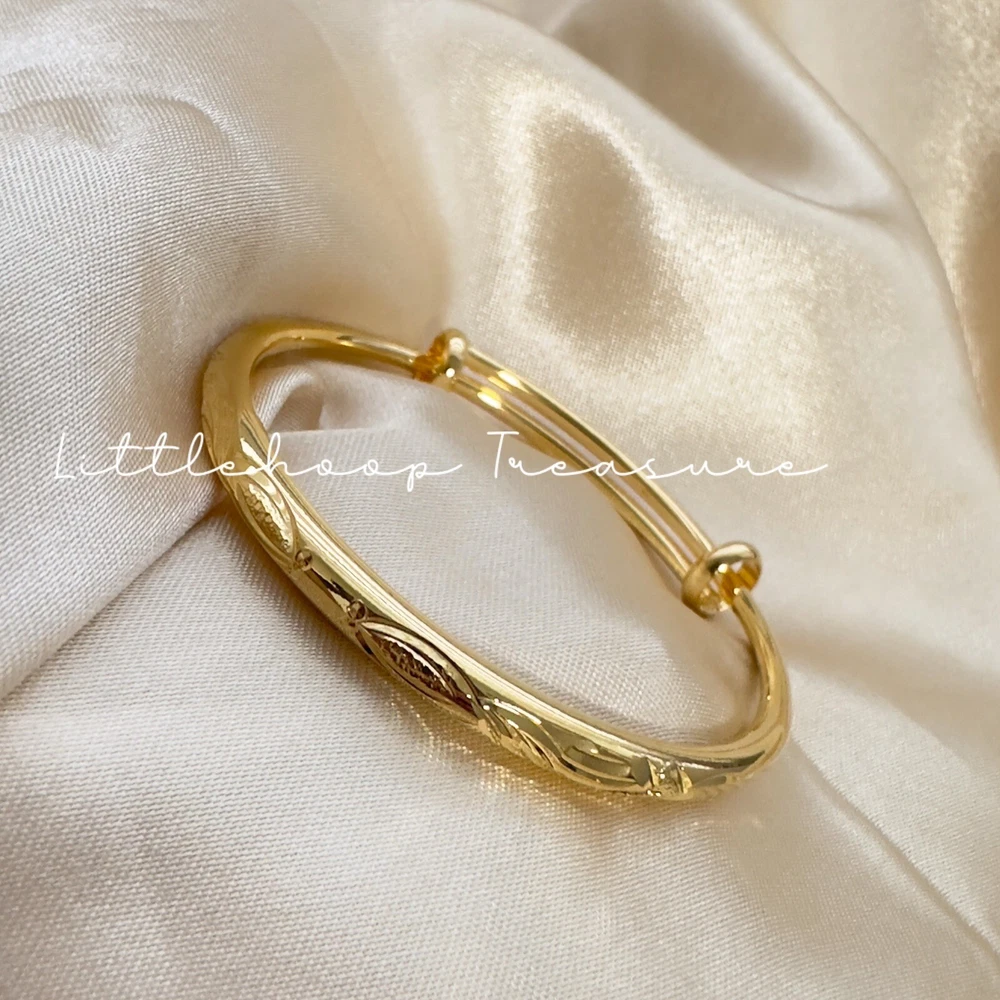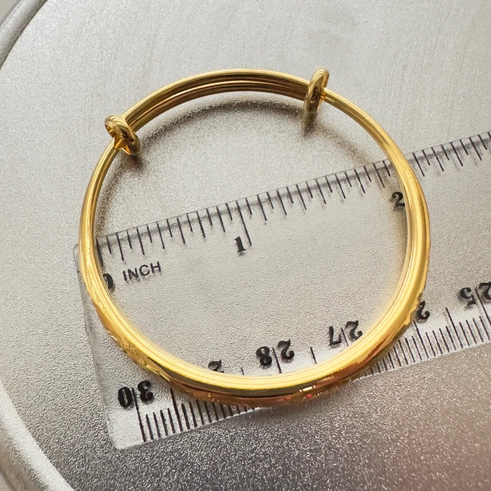 Make a statement with these stunning Kids Gold Filled Bangles. These bangles are perfect for any occasion and will add a touch of elegance to your child's outfit. The bangles are made of high-quality 22k Gold Filled They are also sizable to ensure a perfect fit. Size: This Bangle Expands from 4.5 Inches to 6 Inches around (adjustable) perfect size for 1 year old - 5 year old This will come in Box and bag they are perfect for gifting. Is This Piece Made Of Solid Gold? No. The item is Gold Filled , used to describe a specific form of gold plating, does not, as the term implies, mean that the item is filled with gold. It refers to Jewellery made of base metal (commonly brass or copper) covered by sheets of gold bonded to the base by a mechanical process. Gold Filled is much more valuable and tarnish resistant than spray plated. It does not flake off, rub off or change colour and is extremely long lasting if taken care of. Gold Filled Jewellery is an economical alternative to solid gold jewellery. If you have any questions please do not hesitate to ask. We have so many kids jewelry / different design of beacelets. please feel free to take a look in our shop. THANK YOU JEWELRY CARE: As with all pieces that are not real gold, it is advised that you take proper jewelry care by not exposing to any harsh chemicals. This quality is excellent & can at least more than a year as long as there is proper care.