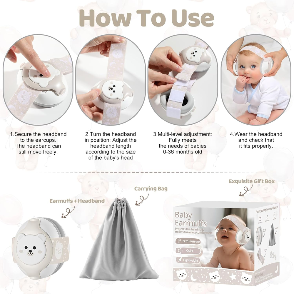 ABS+PVC+PU Imported 【Baby Ear Protection】Our baby headphones are designed to protect the hearing of babies aged 0-36 months. Loud sounds are very harmful to babies, and long-term noise stimulation can cause hearing damage. Our baby earmuffs noise reduction rating is 25dB can help protect the baby's delicate hearing and improve sleep 【No Pressure On Fontanel】The fontanels of babies under 18 months have not yet closed and their heads are very fragile. YomauiYee baby headphones are specially designed for this age group, with a soft headband that fits tightly and without any added pressure while minimizing noise. Provides optimal comfort and protection. Let your baby sleep like an angel even during the loudest outdoor events 【Safe Materials】Our baby ear muffs are made of professional noise-cancelling sponges, thickened solid cup design, ear pads covered with soft PU,and the shell is made of ABS material.YomauiYee baby noise cancelling headphones are CE and CPC certified and are free of silicone and BPA without fear of allergic reactions or irritation. Provide ideal hearing protection for your baby's ears 【Adjustable Headband】Our soundproof earmuffs come with a three-position adjustable anti-slip elastic headband, which not only effectively prevents the earmuffs from slipping into the eyes when using the earmuffs, but also easily adjusts the headband to fit any size head, ensuring that it stays in place during various activities.This infant headphones allows your baby to wear it for extended periods of time, providing an easy, safe and stable experience 【Go Where You Go】Baby noise cancelling headphones adopt a foldable design and are equipped with a storage bag,its compact size and portable design allow it to easily fit into a travel bag and take with you, which is especially convenient for parents who go out. Whether you are flying, traveling, or attending concerts, sporting events and fireworks shows,these baby earmuffs will provide your baby with maximum peace and comfort 【Baby Travel Essentials】YomauiYee baby earmuffs are a three-in-one newborn product that combines noise reduction/protection/sleep, meeting the specific needs of newborn parents and providing a comprehensive solution for baby travel.Baby headphones, adjustable headband,storage bag come in a beautiful box,making them an ideal gift option for newborn babies or parents Product Description Baby earmuffs are specially designed to protect the most vulnerable heads and unclosed fontanelles of babies under 18 months. The soft headband puts no pressure on the depression of the head and has an adjustable and lightweight fit, allowing your baby to fully enjoy a quiet environment. Baby ear muffs are easy to install and use.The anti-slip headband is elastic, soft & comfortable, effectively prevents slipping into the eyes when using earmuffs,and can be adjusted to fit different head sizes.Designed to protect babies aged 0-36 months during critical early development stages Baby headphones are made of multiple layers of noise-reducing foam and soft padding for good sealing. Soft and large ear pads combine with the unique ergonomic design, covering baby's ears perfectly, and reducing loud noises to 25dB,allowing the baby to wear it for a long time without any pressure. Baby Travel Essentials: Earmuffs feature a foldable design for easy storage and portability.Easily fits in travel bags allowing them to be ready when you need them most.Ideal for concerts,football games,cinemas,theme parks,outdoor events,firework shows,church or even airplane,train and subway trips!