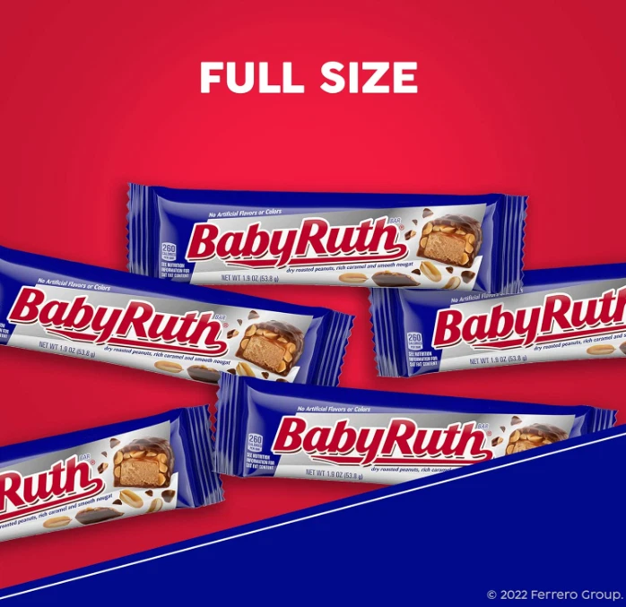 Indulge in the rich taste of Nestle's Baby Ruth Milk Chocolate Candy Bars. Each bar weighs 1.9 ounces and comes in a box of 24, perfect for parties and snacking. The chocolate sweet and assortment are made in the United States and have a shelf life of 60+ days. These candy bars are ideal for any occasion and can be found in the pantry aisle of your favorite store. Each serving size is one bar, containing 260 calories, and the packaging is a convenient box. This product is not modified and has a regional cuisine of American. Enjoy the delicious taste without worrying about the condition of the candy bars.