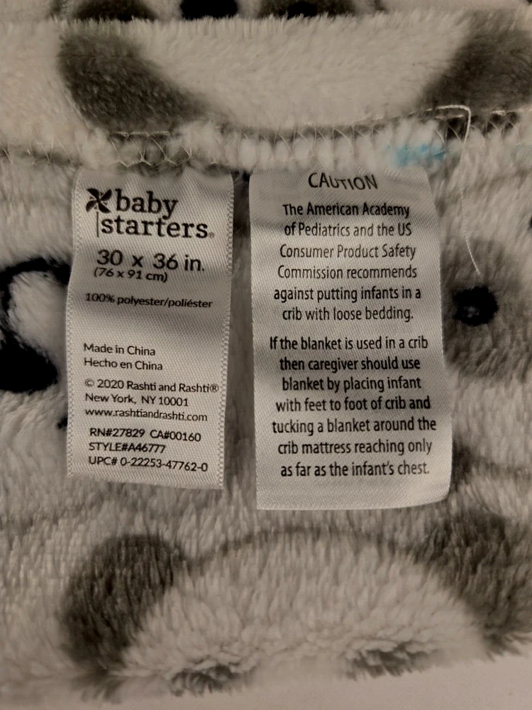 gtin13: Does not apply Size: 36" x 30" Seller Notes: “This blanket is in great condition. There are no flaws, stains, tears.” UPC: Does not apply Personalized: No Material: Fleece Personalize: No Theme: Bear Features: Easy Care Type: Lovey Color: White, Gray, Black, Blue Country/Region of Manufacture: China Character Family: Animals Brand: Baby Starters Gender: Unisex