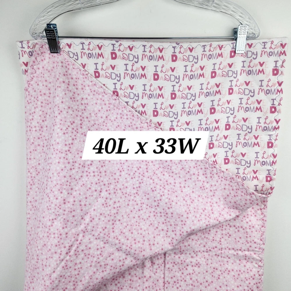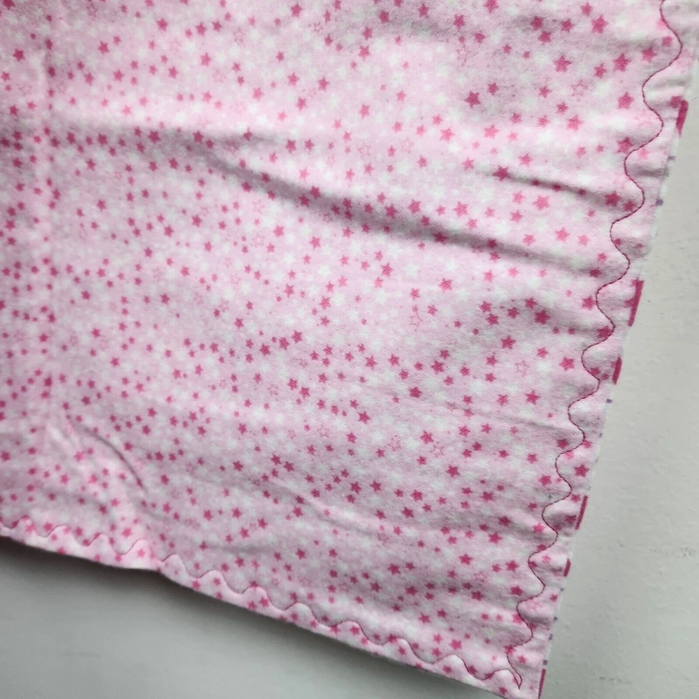 This beautiful pink blanket is perfect for your little girl's crib. Handmade with love, this multi-purpose blanket is versatile and can be used for snuggling, playing, or even as a throw on a chair or couch. Measuring 44x33, it is just the right size for your little one to cuddle up with. The soft flannel material ensures your baby's comfort, and the reversible design gives you two different looks to choose from. With a cute baby theme, this blanket is perfect for a baby shower gift or for your own little girl's nursery. Don't miss out on this adorable addition to your baby's bedding collection.