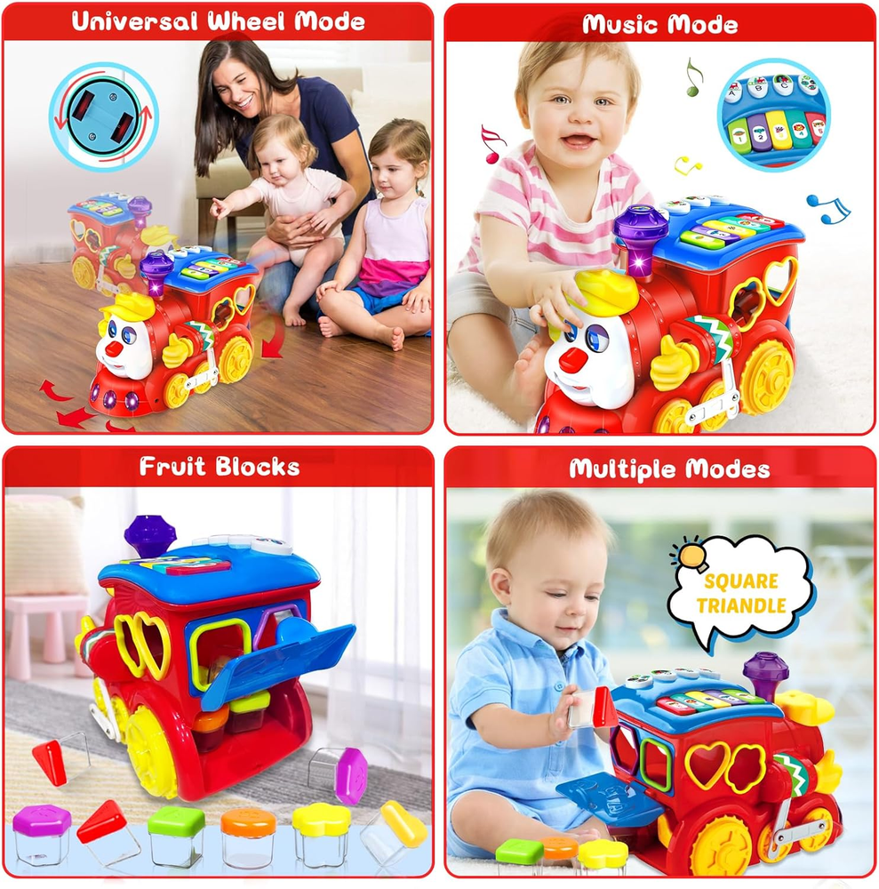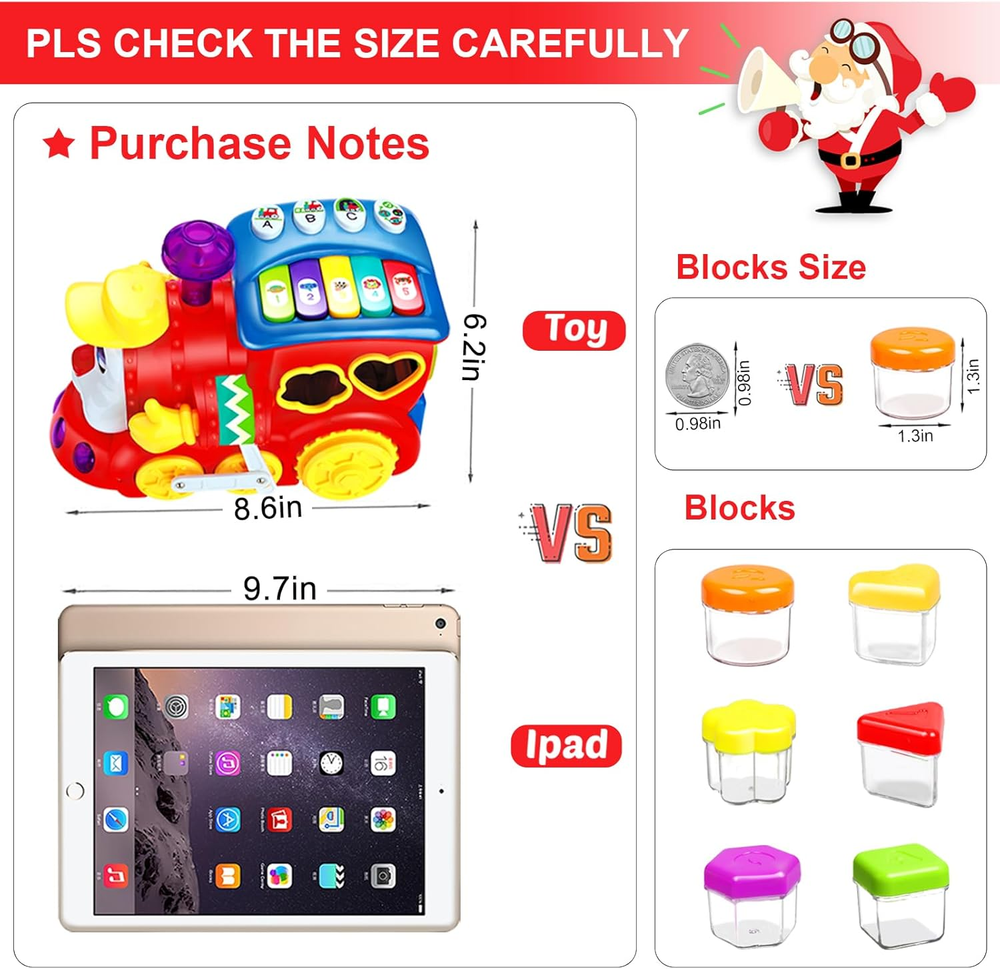【Learning Crawl&Lovely Music】Easy baby toys 12-18 months kids learn to grab and crawl.This music toy is so funny and plays music which 1 2 3 year old boy girls will absolutely loves! PLS CHECK THE SIZE BEFORE PURCHASE: Length:8.6 inch Width:4.7 inch Height:6.2 inch 【360-Directional Wheels】Cute small building block train,which can automatically change direction after collision in running process ,accompanied by wonderful music,great baby toys 12-18 months and baby toys for 1 2 3 year old boys girl kids toddler gifts! baby toys 6-12 months 【Perfect Size&Learning Blocks and Colors】Includes 6 different blocks big enough with fruit shapes,numbers and letters.You can teach your baby how to recognize shapes,colors and fruits.Great investment in educational baby toys 6-12 months and 1 2 3 year old boys girls gifts! 【Strong and Durable Material】This musical baby toy can withstand bump,scratch and fall,it's sturdy enough for babies to play,while they enjoy the colors,music and lights on this light up musical toy for infants.A fantastic toys for 1 2 3 year old boy girl gifts. baby toys 6-12 months 【Great Toddler Gift】Funny baby toys, provide a variety of entertainment for babies.The toddler toy is a great birthday gift for 1 2 3 year old boy girl. It is also great baby toys 6-12 months. Need 3 AA batteries(Not Included) Product Description Do~Do~ The train is coming!It's fancy with realistic train sound & cheerful melodies! let's Play With this Baby Toy Cartoon Train ! Toy brick train toy: Through the shape sorters inside the toy,12-18 month boys and girls can learn colors, 123 and ABC. Once the shape sorters is inserted into the train, you can open the trunk and remove it. Great gift full of surprises toys for 1 2 3 year old boys girls kids gifts. Thinking of a fun gift for babies to give your precious child? Need an age-appropriate toy for a toddler's birthday or for the holidays? Then, This baby toy train car toys for 1 2 3 4 year old boys girls kids will be best toys. It lights up, plays music, moves around, early educates, and makes for hours of fun. Deformation Blocks 6 different stereoscopic squares have6 different colors. 1 2 3 year old boys girls will learning while playing and also stimulate their curiosity. Christmas Birthday Thanks-giving New Year Skills Learning Preschool Daycare Home Shiny lights&Beautiful Music Our early education learning toys have beautiful lights and lovely music that 6 to 12 months boys girls kids will chase after this music toy and learn to crawl and love it very much! Endless Fun:Musical baby toys for 1 year old boy girl have two modes to play.Learning Mode: Learn numbers, learn colors,123 and ABC. Various music and animal sounds inside of the train; Music Mode: Learn the cognitive scale and enjoy the lovely melody. Early educational toys for 1 2 3 year old kids toddlers boys and girls, you deserve it. This baby toy designed to improve the multiple skills of 1 2 3 year old boys and girls,cultivate their educational thinking skills,shape recognition,creativity,and hand-eye coordination.Just Buy it! Superior Qualityfor Long Time Use Musical baby toys 6-12 12-18 months have very high ABS material so won't broken too easily, Perfect gifts toys for 1 2 3 year old boy girl kids babies Enough Storage Space Blocks of different shapes can be stored in this baby toys train car and can help your 6 to 12 months kids develop a good habit of storage. Bump & Go Feature The Bump & Go feature allows baby toys 12-18 months to change directions and keep going when it bumps into something.No afraid of obstacles. Many Music Let More Funny Attract the 1 2 3 year old baby’s attention through the cute and colorful train, the train’s buttons and piano keys can traine the baby flexibility of fingers too! Multifunction Preschool Learning Toy For 1 Year Old The kids crawl train car toy has many hand training parts: 12-18 months babies start to pronounce consciously, and he can distinguish various sounds, as well as family names with the help of our baby toy. A variety of small hand-training mini-games allows your baby's little hands to explore and improve dexterity. Greatly develop your baby's fine motor skills and eye-hand coordination. Perfect newborn baby toys for infant 6 7 8 9 10 11 12 18 months. Perfect Musical Educational Toys The early educational baby toys train light up music toys come with colorful design and funny sounds effect, the piano toys for 1 year old light up when sing, will attract the attention of your 1 2 3 year old kids and enlighten your toddlers to see, hear, touch, observe and explore, cultivate the babies’ color recognition, and sensory engagement. It is an awesome light up baby toy 6 to 12 months!also a fun baby toys 6-12 months gifts