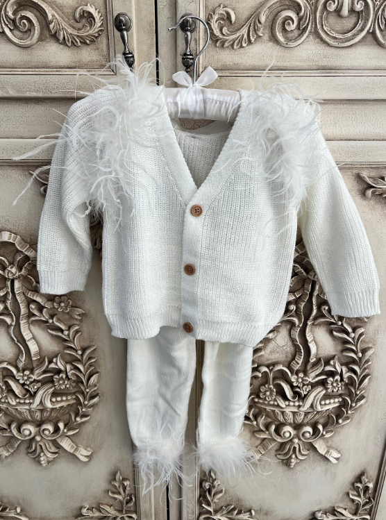 This baby girl off white knit two-piece set is a beautiful and cozy outfit perfect for the colder seasons of winter, fall, and spring. The set includes a long sleeve sweater with a button closure and matching pants, both made from a soft knit fabric. The fur add-on detail adds a touch of luxury to the outfit, making it suitable for both casual and formal occasions. Handmade with care, this layette set is designed for 12-18 months old baby girls and should be hand washed for maintenance.