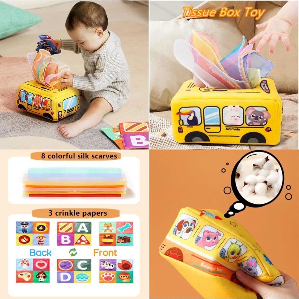 【5 in 1 Montessori Toys Set】-The baby toys set contains building blocks,Magic tissue box, stacking cups, pull string Infants toys, and cube toddler toys that will help baby develop their: Color and shape recognition and sorting skills, fine motor skills, hand-eye coordination, spatial awareness and reasoning, cognitive flexibility, language skills, creativity, problem solving, logical thinking, Great baby montessori toys 6-12 12-18 months. 【SAFETY FIRST】 - Our Montessori toys for babies 6-12 months are made with premium quality, 100% safe and high quality materials, BPA free, Phthalate Free. All of baby items have passed the most stringent CPC/ASTM, Educational toys for 1-3 year old boy and girl. 【Baby Tissue Box】-Babies love playing with tissue boxes and paper, so we’ve created a safe and fun replacement.Our early development toys (3 Pack crinkle paper + 8 Juggling Rainbow Dance Scarves) are ready for your baby, This sensory tissue box will entertain babies for hours with its vibrant colors, crinkly sounds, and pull-along fun. which will promote their skills of fine motor, distinguish colors, stimulate the development of their hearing and vision 【Pull String Infant Toys】-This multi-sensory silicones activity toy has a unique design, montessori silicone toy has 6 brightly colored ropes, which can develop their motor skills and sensory perception by pulling up and down silicone ropes, pressing and pushing buttons. This sensory silicone toy will keep the baby occupied and entertained for hours while they play and explore the cause and effect. a great Baby teeting toys, that can also be used as a stroller pendant. 【Explore Sensory Bin+Stacking Sensory Toys】 - Our stacking building blocks baby toys 3-6 months are good for learning colors, shapes, textures, counting, visual development etc. Also can be used as bath toys and matching game! The educational shape sorting toys frame made of high quality ABS plastic,has rounded corners are soft, baby tries to push the shapes through the elastic bands and perform the sensory shapes. As a baby toy to explore and try, it awakens the curiosity of the children.