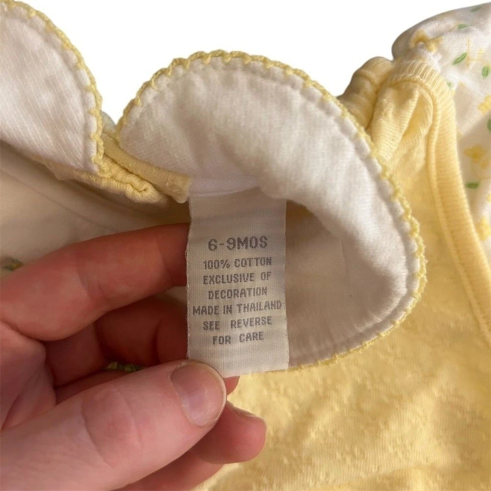 Closure: Snap Number of Pieces: 1 Piece Season: Spring, Summer Occasion: Casual Brand: Babyworks Accents: Embroidered, Bow Handmade: No Character: Bear Style: Romper Department: Girls Theme: Floral, Cartoon, TV & Movie Characters Set Includes: Bodysuit Garment Care: Machine Washable Personalize: No Pattern: Floral Size: 6-9 Months Material: 100% Cotton Sleeve Length: Short Sleeve Vintage: No Features: Lightweight, Breathable Type: One-Piece Country of Origin: Thailand Color: Yellow Fabric Type: Knit Neckline: Collared