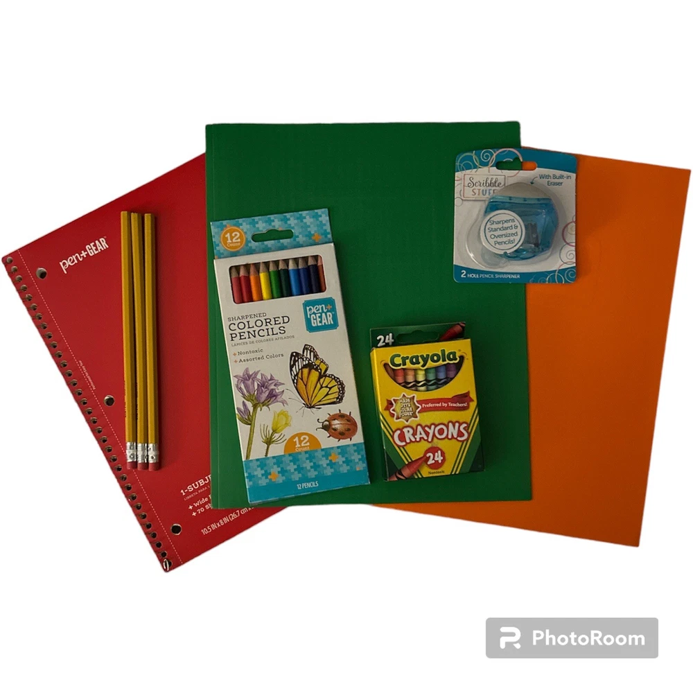1 Book Bag, 3 Pencils, 1 Pack of Colored Pencils, 1 Pack of Crayons, 2 Colored Folders, 1 2 Hole Pencil Sharpener, 1 Notebook