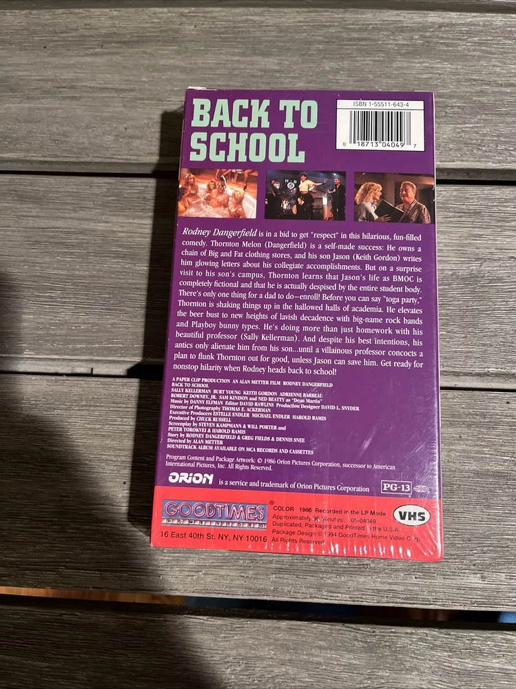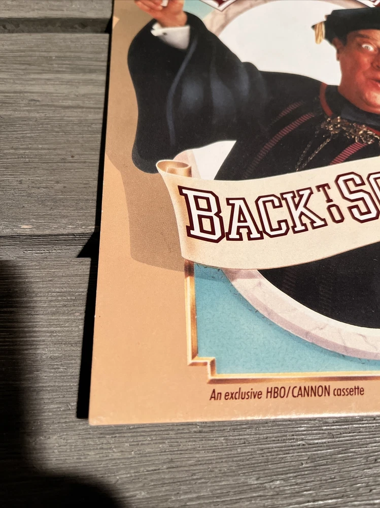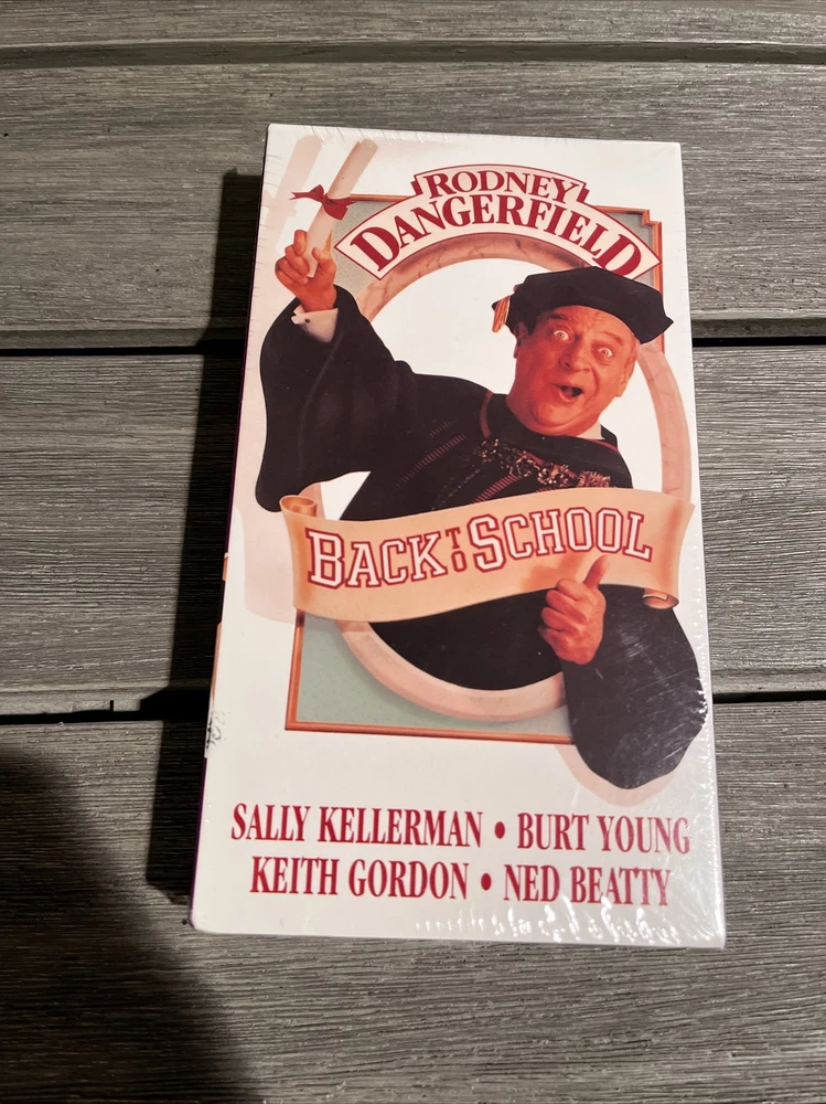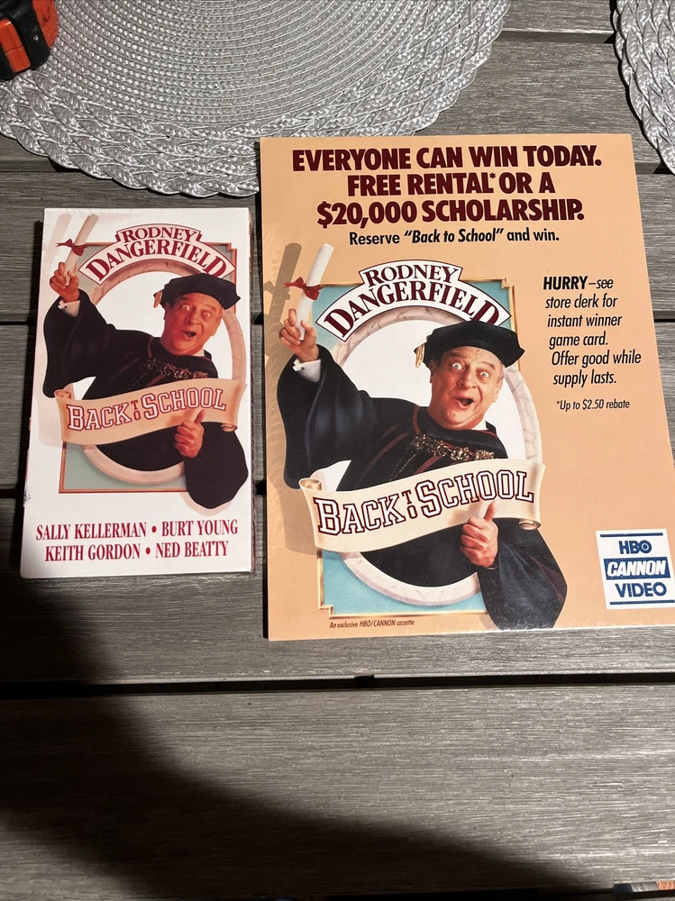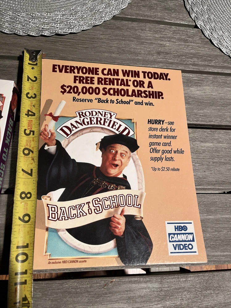 Back To School Movie Counter Standee & VHS Mint Rare Rodney Dangerfield Classic Standee is in mint condition, never used and a true collectors item. Amazing item for any game room. Brand new vhs tape still in original wrapping. No tears or rips.