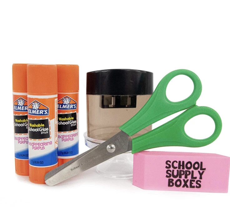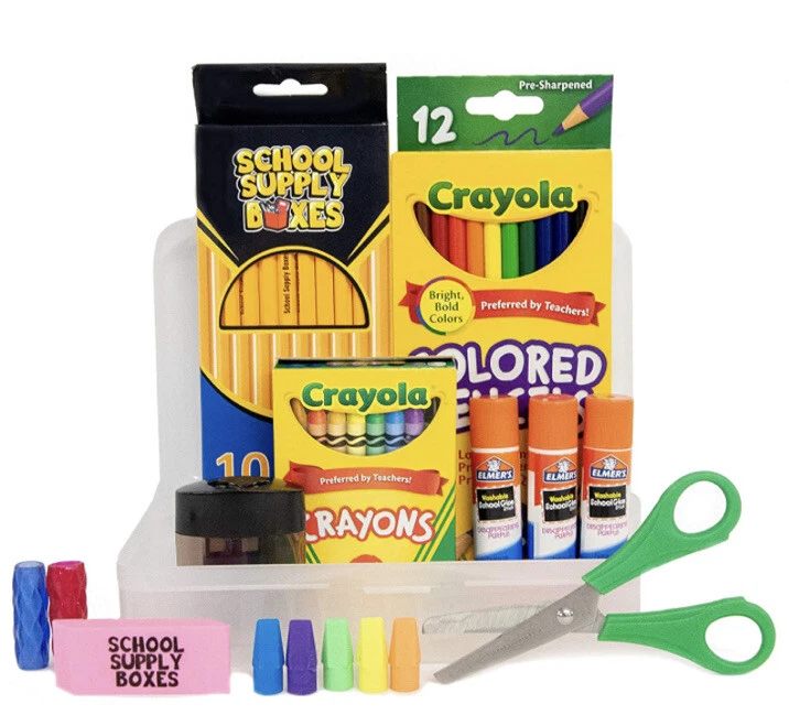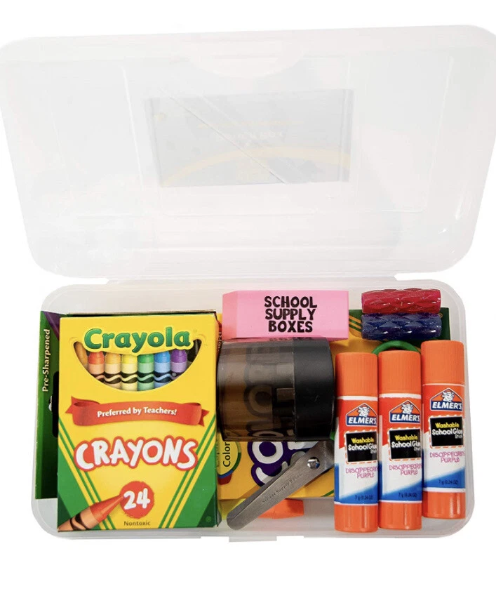 Take one hassle out of back to school shopping and buy a School Supply Box filled with everything your elementary student needs. This supply kit contains (1) plastic pencil box, (1) 10pk of Crayola Markers, (1) 24pk of Crayola Crayons, (1) 12pk of colored pencils, (3) Elmer's glue sticks, (10) #2 pencils, (5) pencil top erasers, (1) rubber eraser, (1) pencil sharpener, (1) pair of blunt tip scissors, (2) pencil grips, (1) standard 12 inch ruler, (1) wide-rule spiral notebook, (1) wide ruled composition book, and (2) 2-pocket folder with metal prongs. This massive school supply kit contains everything your child in kindergarten, first grade, second grade, third grade, fourth grade, or fifth grade could need for the first day of school. The art supplies in this school supply box are great for your young artist to use on art projects, map projects, coloring pages, coloring books, assignments, or for making holiday decorations. Poems, stories, essays, spelling tests, math tests, and taking notes won't be a problem on the first day of school with all the writing materials and tools available in this school supply box. School Supply Boxes don't have to just be for school kids. The supply kits also make a great gift for a teacher, substitute teacher, principal, vice principal, tutor, guidance counselor, or for a homeschooled child.