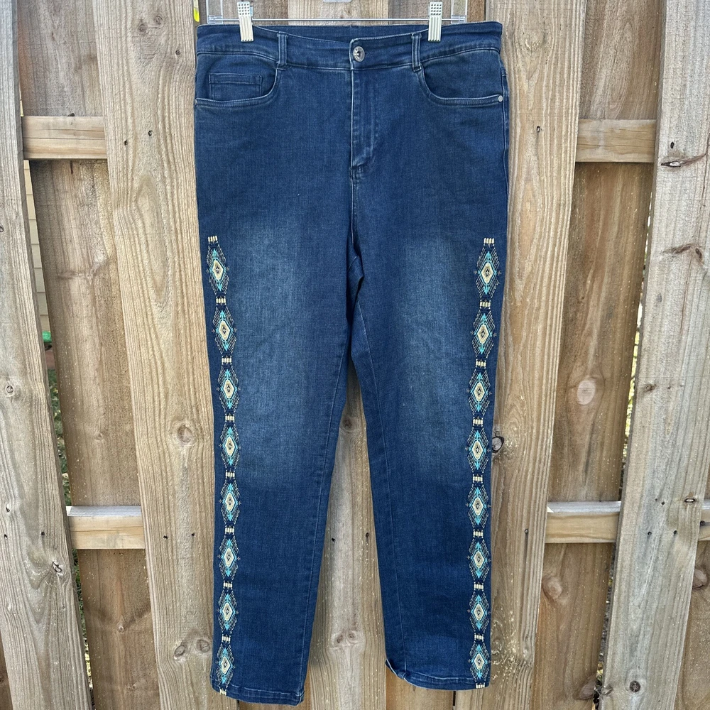 Get ready to ride the range in style with these Back In The Saddle women's jeans. The dark wash denim fabric is accented with a beautiful argyle/diamond pattern, embroidered details, and a high-rise fit. The jeans feature a 5-pocket design, with a button and zipper closure, and an elastic waistband for added comfort. The relaxed fit and stretchy material make these jeans perfect for any season, whether you're out for a casual ride or hitting the town. The inseam and waist size are pictured, and the jeans are available in a size 10. With their western theme and Back In The Saddle product line, these jeans are a must-have for any fashion-forward cowgirl.