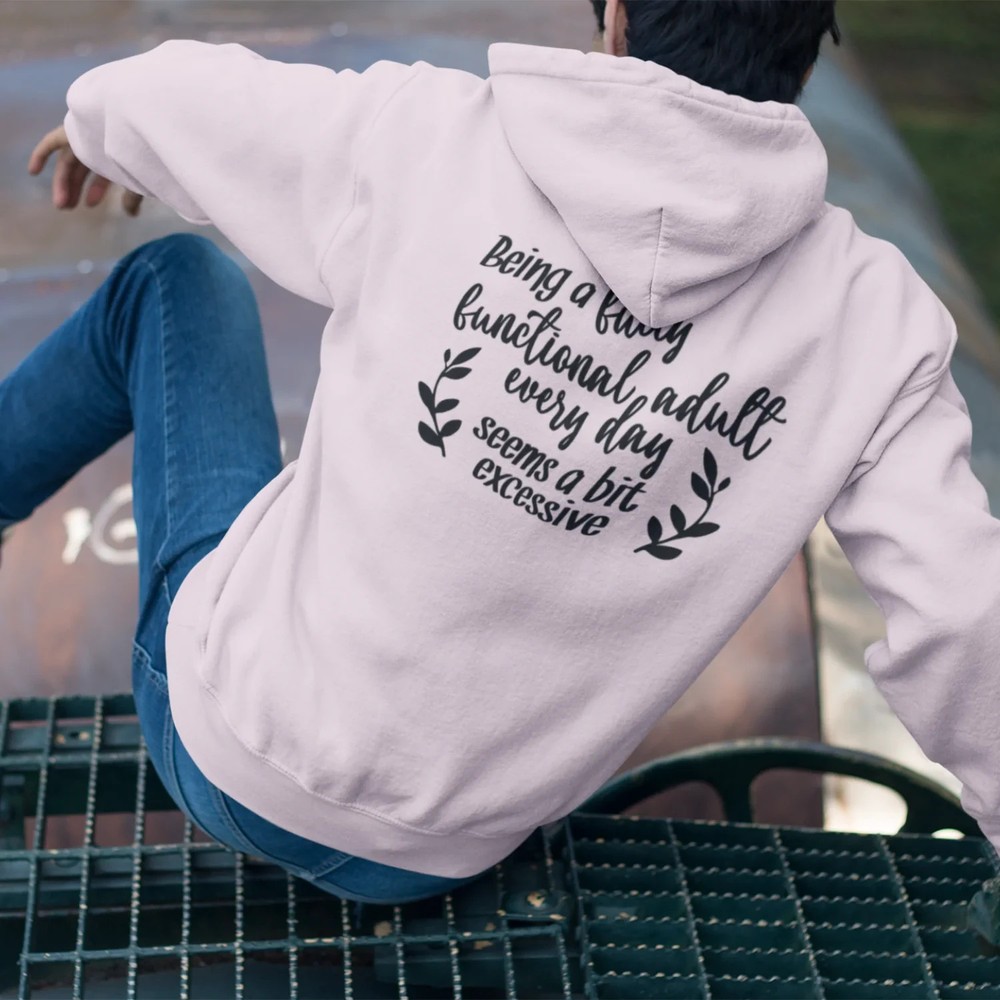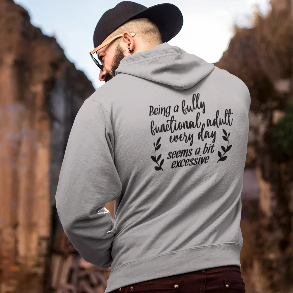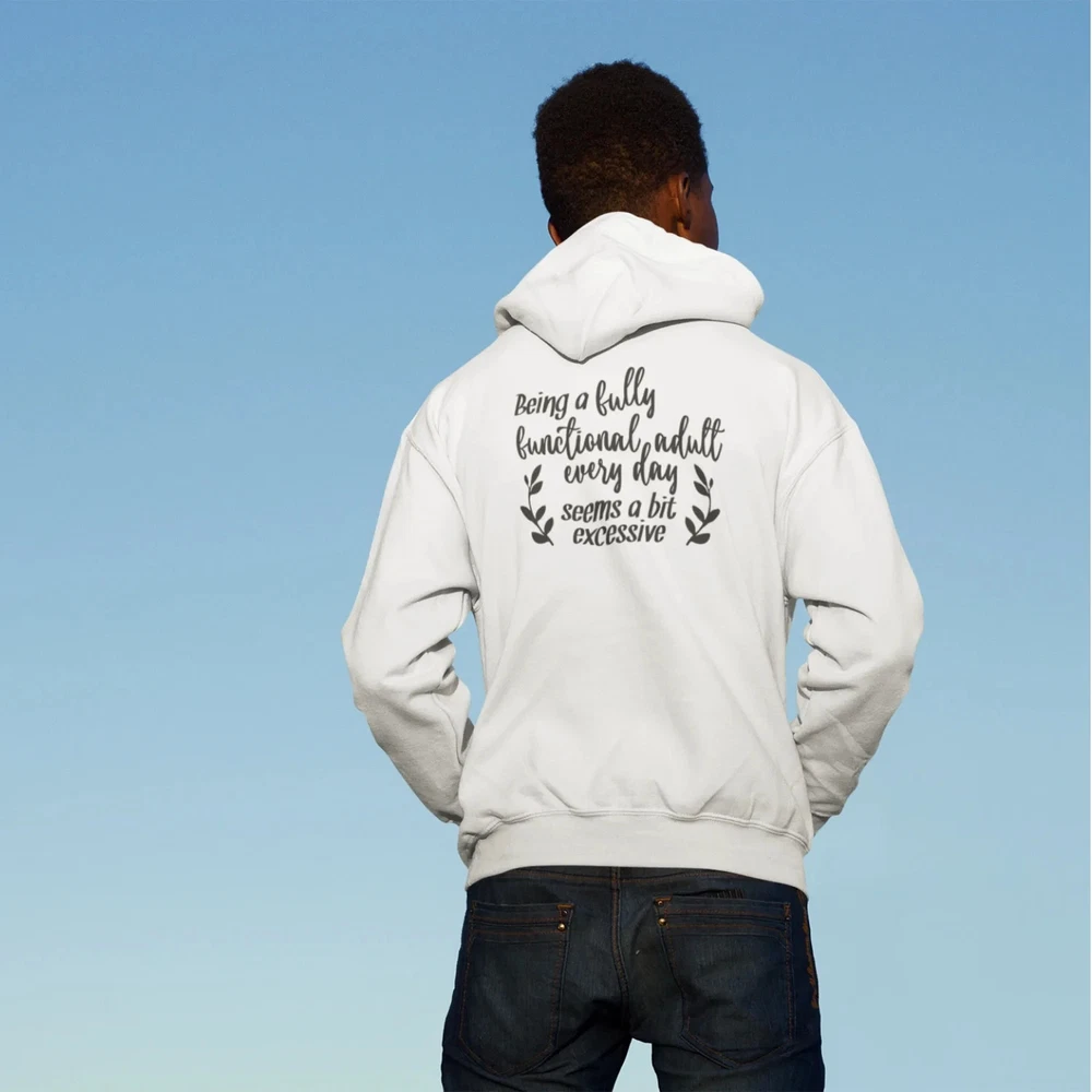This Back printed humorous text Hoodie is a must-have for any fashion-forward individual. Made from high-quality materials, this hoodie offers both comfort and style. The back features a humorous text design, perfect for showcasing your unique sense of humor. Stay cozy and fashionable with this must-have hoodie. Overview; This heavy blend hooded sweatshirt is relaxation itself. Made with a thick blend of cotton and polyester, it feels plush, soft and warm, a perfect choice for any cold day. In the front, the spacious kangaroo pocket adds daily practicality while the hood's drawstring is the same color as the base sweater for extra style points. Fabric: Made with a medium-heavy fabric (8.0 oz/yd² (271 g/m²)) that consists of 50% cotton and 50% polyester for that cozy feel and warmth you need in a hoodie. Fit; The classic fit along with the pouch pocket and the tear-away label make for a highly comfortable, scratch-free wearing experience. The color-matched draw cord and the double-lined hood add a stylish flair and durability that tie everything together. Fabric blends: Heather Sport colors - 60% polyester, 40% cotton.