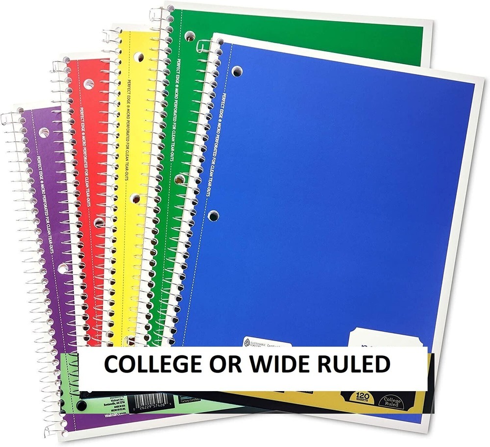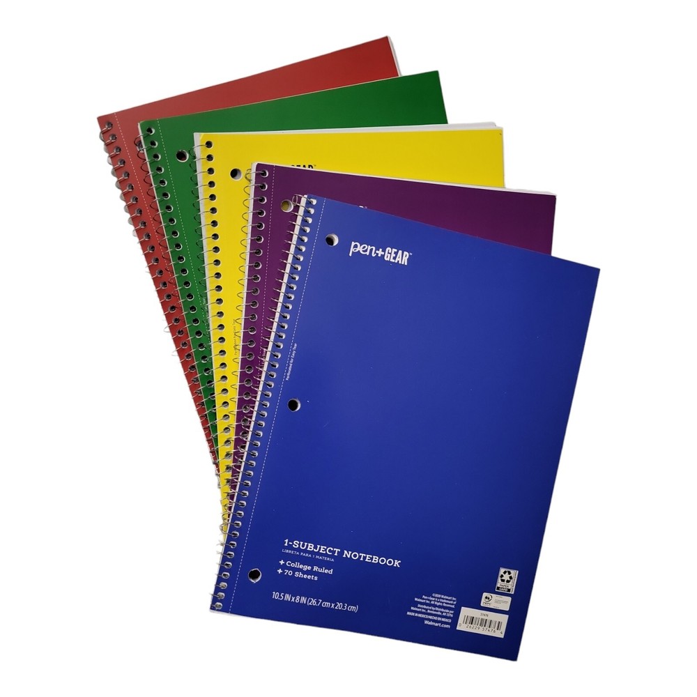 Back to School WIDE Ruled 1 Subject Spiral Notebook 70 Sheets 10.5 inch x 8 inch (Pack Of 5) The Pen+Gear Wide Rule 1-Subject Notebook is a must-have item at school, at work, or at home. This spiral-bound notebook is 10.5 inches by eight inches, making it just the right size for most backpacks, bookbags, and totes. The Pen+Gear 1-Subject Notebook has durable front and back covers that are flexible enough to lie flat when taking notes in class or making that to-do list. The covers help protect your homework or other missives from tears and wetness. With 70 college-ruled sheets of paper, you will be set for scholastic success. Choose from a variety of colors for every school subject and pair with other Pen+Gear accessories like our black ballpoint pens to make sure you're ready to ace your classes. The Pen+Gear College Rule 1-Subject Notebook is a great and versatile notetaking option. Spiral-bound notebook Wide ruled 70 pages Single subject Perforated sheets - easy tear Durable front and back covers Flexible enough to lie flat while writing 8" x 10.5" Available in a variety of solid colors Brand may vary Cover design may vary Track Page Views With Auctiva's Counter