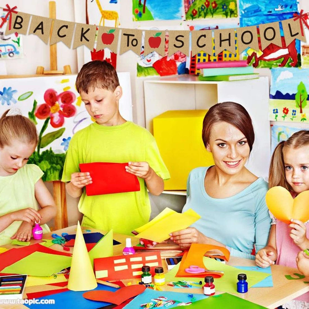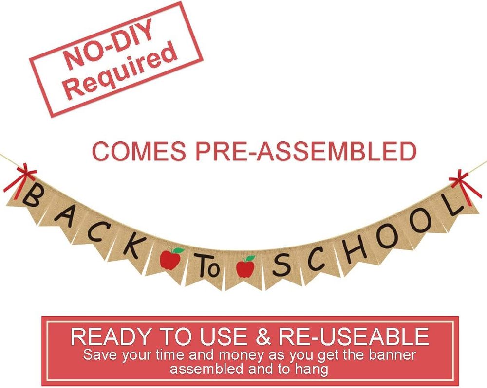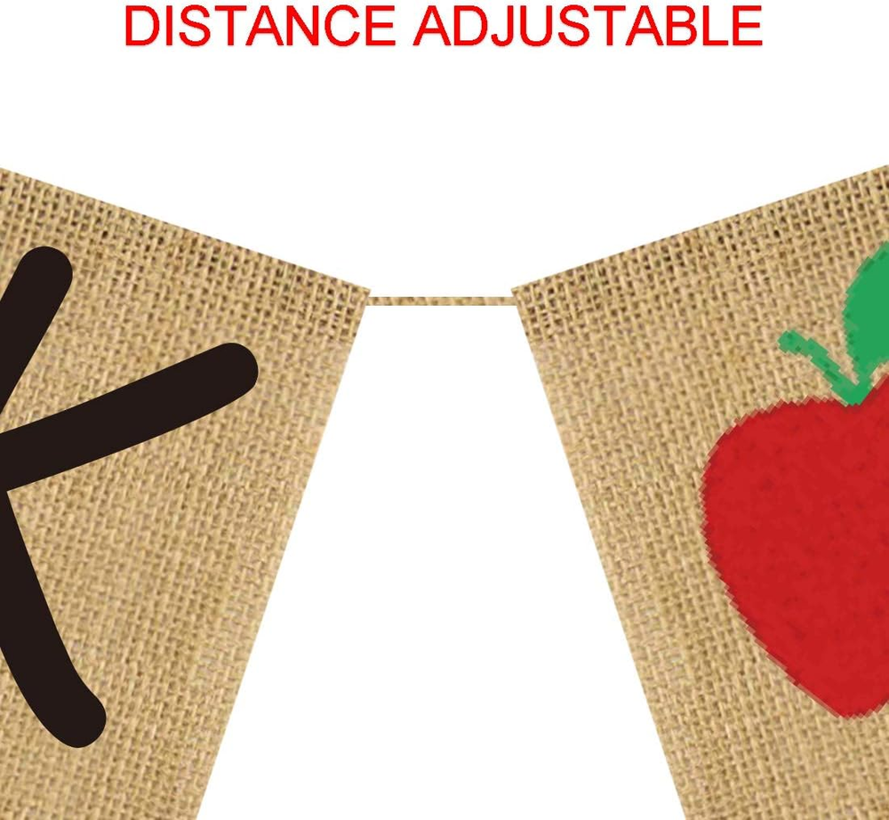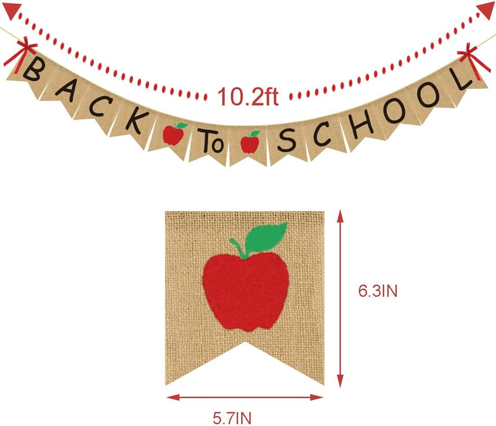 BACK TO SCHOOL BANNER--An Excellent banner which brings the real fun and unforgettable memory at your party. Back to School banner would be a lovely banner, which will add the special touch to your first day of school party or back to school party. UNIQUE DESIGN | DURABLE MATERIAL : Made of high quality jute burlap, lightweight durable and reusable, friendly to environment. The "TO" word is encased by an apple on either side and the ends of the banner are decorated with red bow ribbons.The combination of all popular elements is only to give you a unique and lovely banner, hope you love it and enjoy your funny party. PERFECT SIZE | FOLDABLE: Each banner flag measures approx 5.7"×6.3", the banner length is 10.2ft. You are very convenient to find an ideal place and easy to hang with plenty of extra string. After use, you can fold it up to easy to storage and storage for next time use. NO DIY REQUIRED: The banner is pre-strung and ready for hanging upon its arrival. It just takes your a few minutes take them out gently and slowly in case of entangling , then hang it up and enjoy your party. The flags can be adjusted according your preference as they are moveable. Application Place: You can hang it on the blackboard, or classroom wall, on the tree, ceiling, in a doorway, window, archway or any corner of your school yard, as a backdrop when you take photos. Product Description Features Material: Premium Natural Burlap. Color: Black Letters & Red Bowknot Ribbons Length:10.2ft Perfect Size: Each burlap flag measures 5.7”x6.3” Package Includes: 1 × generous Back to School banner Advantages Good quality Durable and reusable Foldable and easy to storage Perfect for: Classroom Banner Decorations, First Day of School, Teacher Banner, Back To School Decor, Teacher Office Decorations. Where You Hang You can hang it on the blackboard, or classroom wall, on the tree, ceiling, in a doorway, window, archway or any corner of your school yard, as a backdrop when you take photos. Great Back to School banner 1. This "Back to School" banner will make a perfect compliment for the students or teachers. 2. The Partyprops's banner is durable for many time use because of its premium and sturdy burlap material, easy to fold after use, save your space. 3. All the flags of the banner are pre-assembled, save your time and money, you can also adjust the space between the letters according your preference.