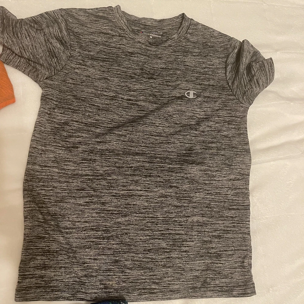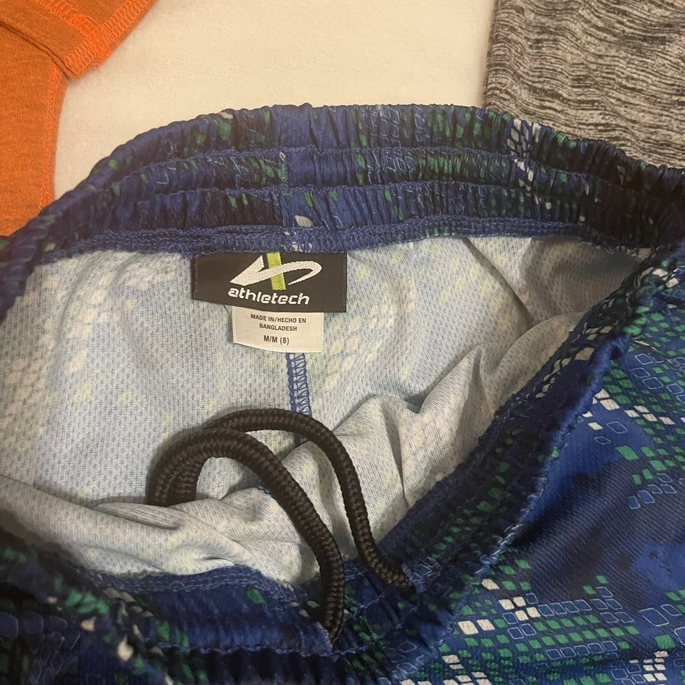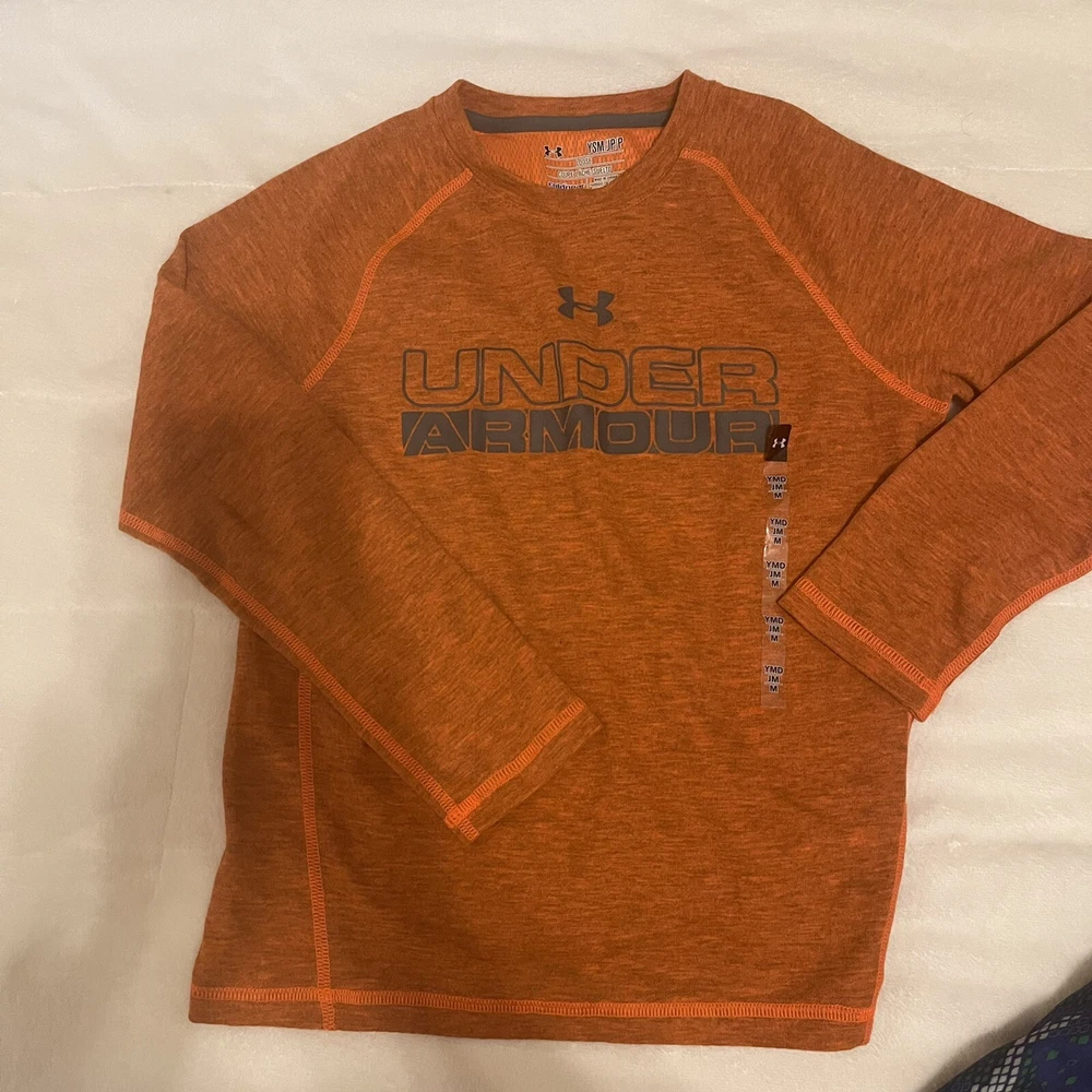 Back to School Boys Clothes bundle! two tops and one short. Get this bundle of 3 pieces, one brand new Under Armor Orange color , athletic top, one Champions grey top and one Athletech pit of short. All size medium. Both shorts pit to pit are 15.5”. Shoulder to hem 21” and 20”. Shorts waist is elastic, as is in the picture with out stretching it is 11”, stretches about two inches more. Waist to hem length 16”.