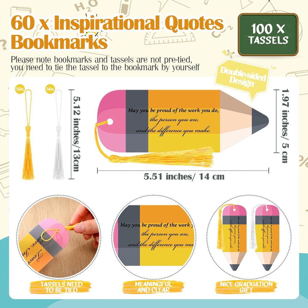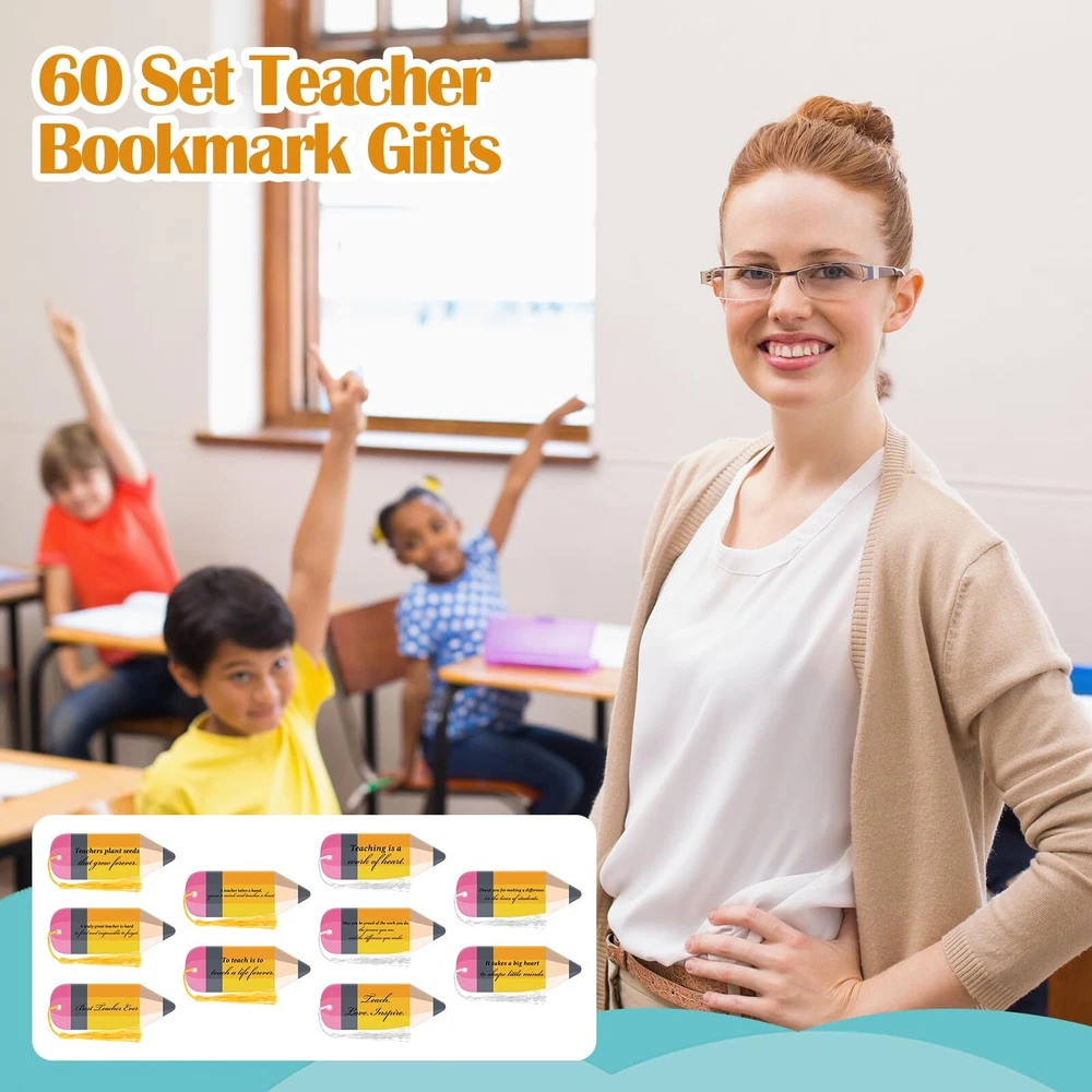 1. These adorable pencil-shaped bookmarks are a fantastic way to show teachers some love! The set includes 60 bookmarks and 100 tassels in two colors—perfect for gifting to multiple educators. They're durable, stylish, and feature uplifting quotes that make them both practical and meaningful. A thoughtful, budget-friendly choice for teacher appreciation, back-to-school, or any occasion!