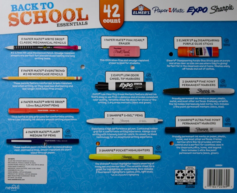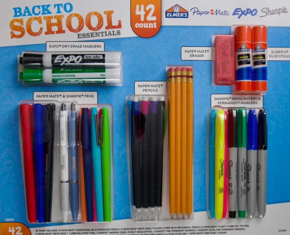 Back to School Essentials, 42 Count *Included in Set: 8 - Paper Mate Mechanical Pencils - #2 0.7mm lead 8 - Paper Mate Everstrong #2 Pencils 6 - Paper Mate 1.0mm Ballpoint Pens 6 - Paper Mate Flair Medium Felt Tip Pens 1 - Paper Mate Pink Pearl Eraser 2 - Expo Low Odor Chisel Tip Dry Erase Markers in Black & Green 2 - Sharpie 0.7mm S-Gel Pens 3 - Sharpie Chisel Tip Pocket Highlighters in Yellow, Pink, and Light Blue 2 - Sharpie Fine Point Permanent Markers in Black & Blue 2 - Sharpie Ultra Fine Point Permanent Markers in Black & Green 2 – Elmer’s Disappearing Purple Glue Sticks For more details, please see HD photos. Please check our eBay store for more products you LOVE! All items come from a clean, pet-free, and smoke-free environment.