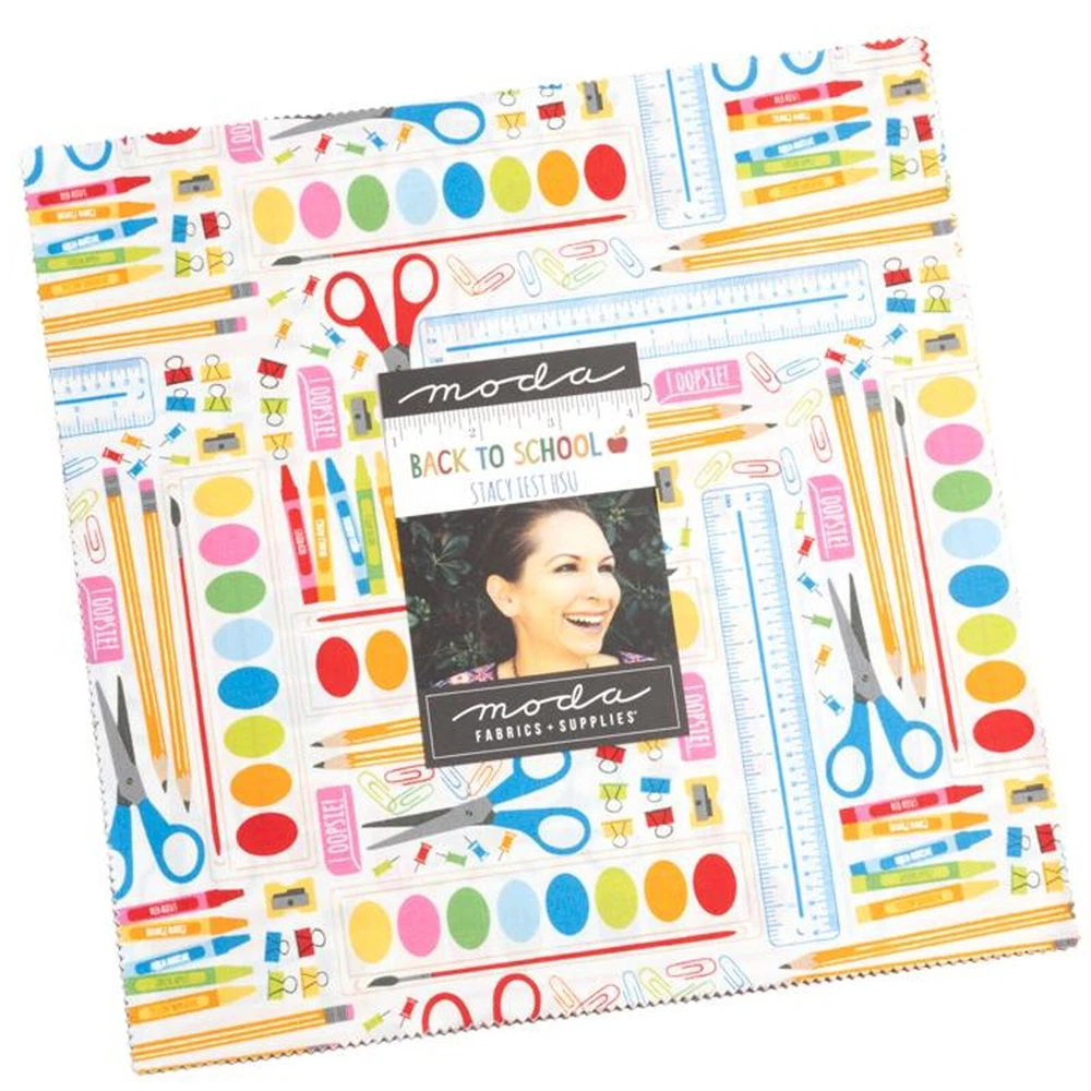 Moda Back to School Layer Cake by Stacy Iest Hsu for Moda Fabrics Manufacturer: Moda Fabric line / collection: Back to School Designer: Stacy Iest Hsu SKU: 20890LC Product type: Layer Cake Size of squares: 10" x 10" Total number of fabric squares: 42 There may be duplicates of some of the fabric squares. 100% cotton, quilt shop quality fabrics The first photo is the layer cake. The second photo shows swatches of the fabrics in this collection. This layer cake is cut and packaged by Moda (the manufacturer).