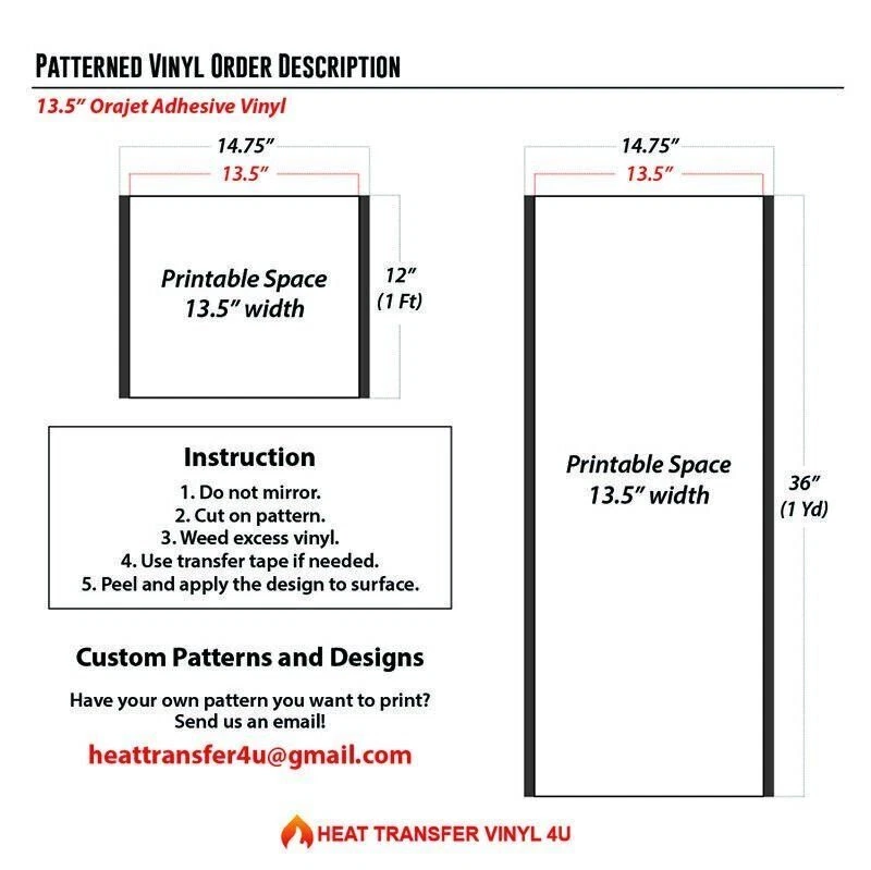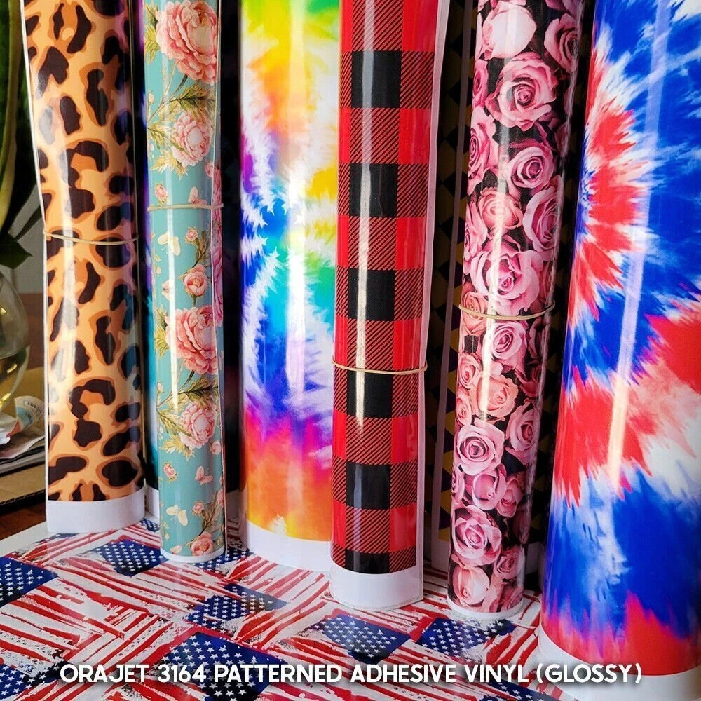 Patterned Adhesive Vinyl Printed on Orajet 3164 (No Transfer Tape Provided) *All patterns are printed as shown in the swatches. • HTV4U Patterned Adhesive Vinyl is the perfect media for your needs! • Great to use on glass, metal, plastic and much more! • Cut on Pattern Side and DO NOT MIRROR . After weeding excess vinyl, apply a transfer tape to transfer design off of the backing and place on your surface. • We have a tons of variety and colors for you to choose from! • Quantity discounts available! *This product is excluded from all promotional discounts and offers. ORDER DESCRIPTION CUTTER SETTINGS Cricut: Blade: Standard Setting: Iron On Silhouette Cameo: Blade: Standard, 3 Material: Heat Transfer, Smooth Speed: 8 Force: 6 Scan N Cut: Blade: Standard, 2 Cut Speed: 1 Cut Pressure: 1 Roland GS/GX-24: Blade: 45° Gram Force: 80-90 Offset: 250 Speed: 25-50 cm/s Graphtec: Blade: 45° Gram Force: 9 Tool: CB09U+0 Speed: 25 cm/s MH, SC2, LP3, & Titan 1: Blade: 45°/60° Gram Force: 80-85 Speed: 300mm/s *Blade Advancing Varies Titan 2 & 3 Blade: 45°/60° Gram Force: 60-65 Speed: 300mm/s *Blade Advancing Varies Settings may vary based on blade condition and age of machine. Always perform a test cut prior to cutting designs. RECOMMENDED ACCESSORIES & CARE Recommended Accessories: Tweezer Adhesive Application Tape