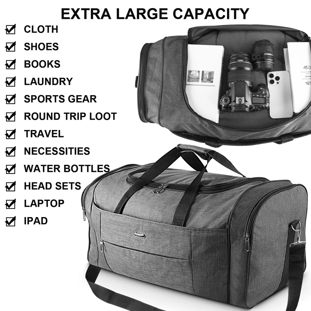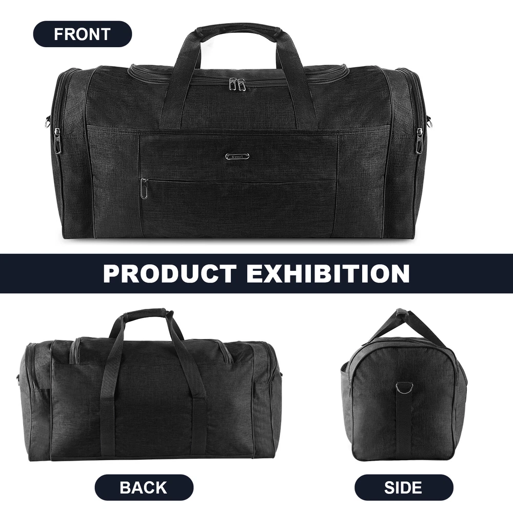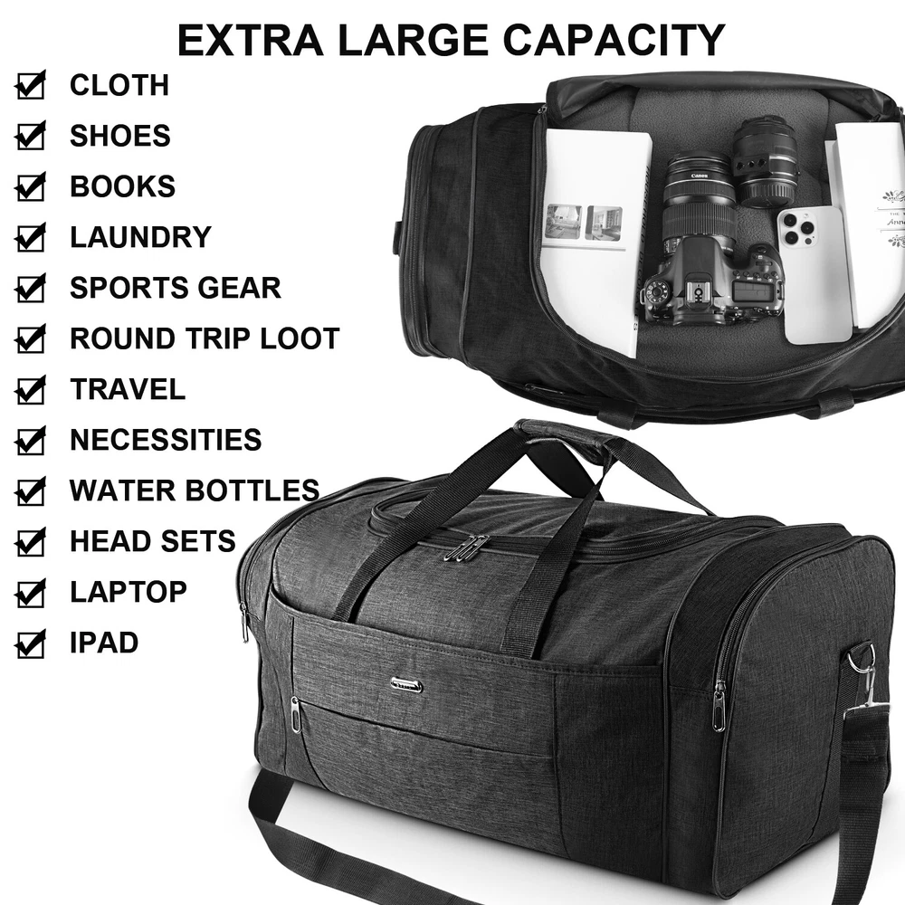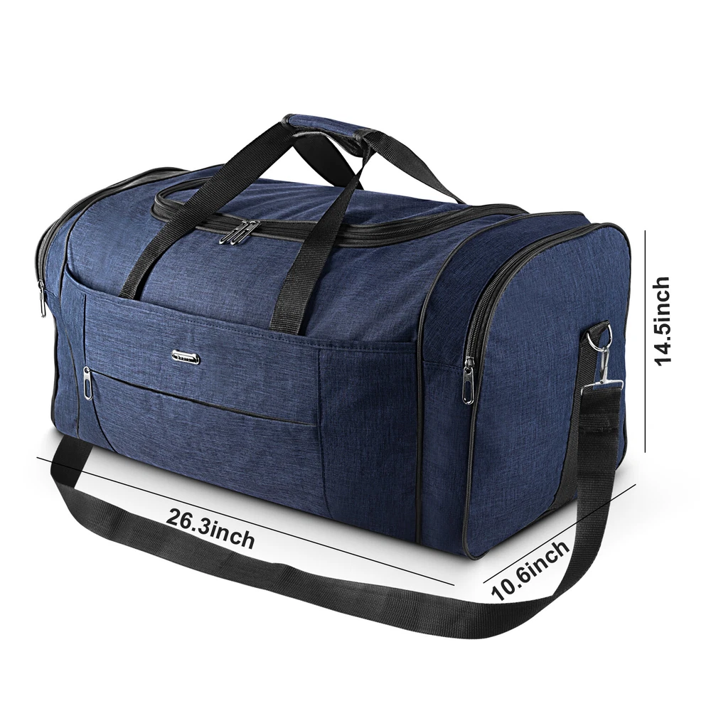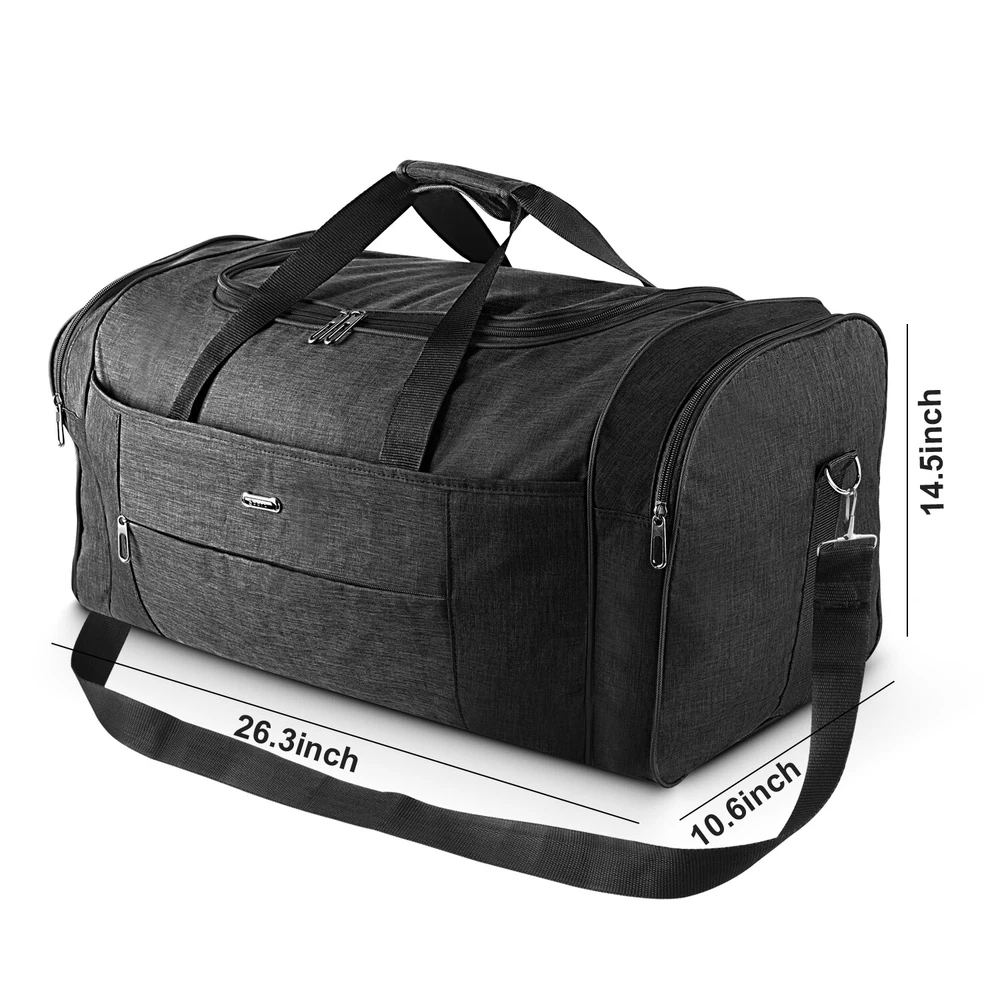 Description Multipurpose:This duffel bag is extra large and can be served as a sports, gym, luggage, weekender bag, oversize travel bag, military duffle bag, overnight bag, camping, airplane duffle or even household storage bag. It is suitable for women and men of all age. Detail Oriented Design:Men's weekender travel bag padded handles and an adjustable shoulder strap for carrying comfort and versatility. Lots of pockets and convenient Mesh string nets for handy storage. Foldable and Spacious:Huge luggage traveler bag can be fast folded into itself . It takes a little space while have a huge up-to 60 Liter capacity to be used as a backup overnight storage bag in case your suitcase swells up. Durable and Lightweight:Overnight travel duffel bag is 26.3" X 10.6" X 14.5"in size. Made out of high quality Oxford PU450 fabric.It is water wear, tear resistant and build to last. Package: 1*Overnight travel duffel bag