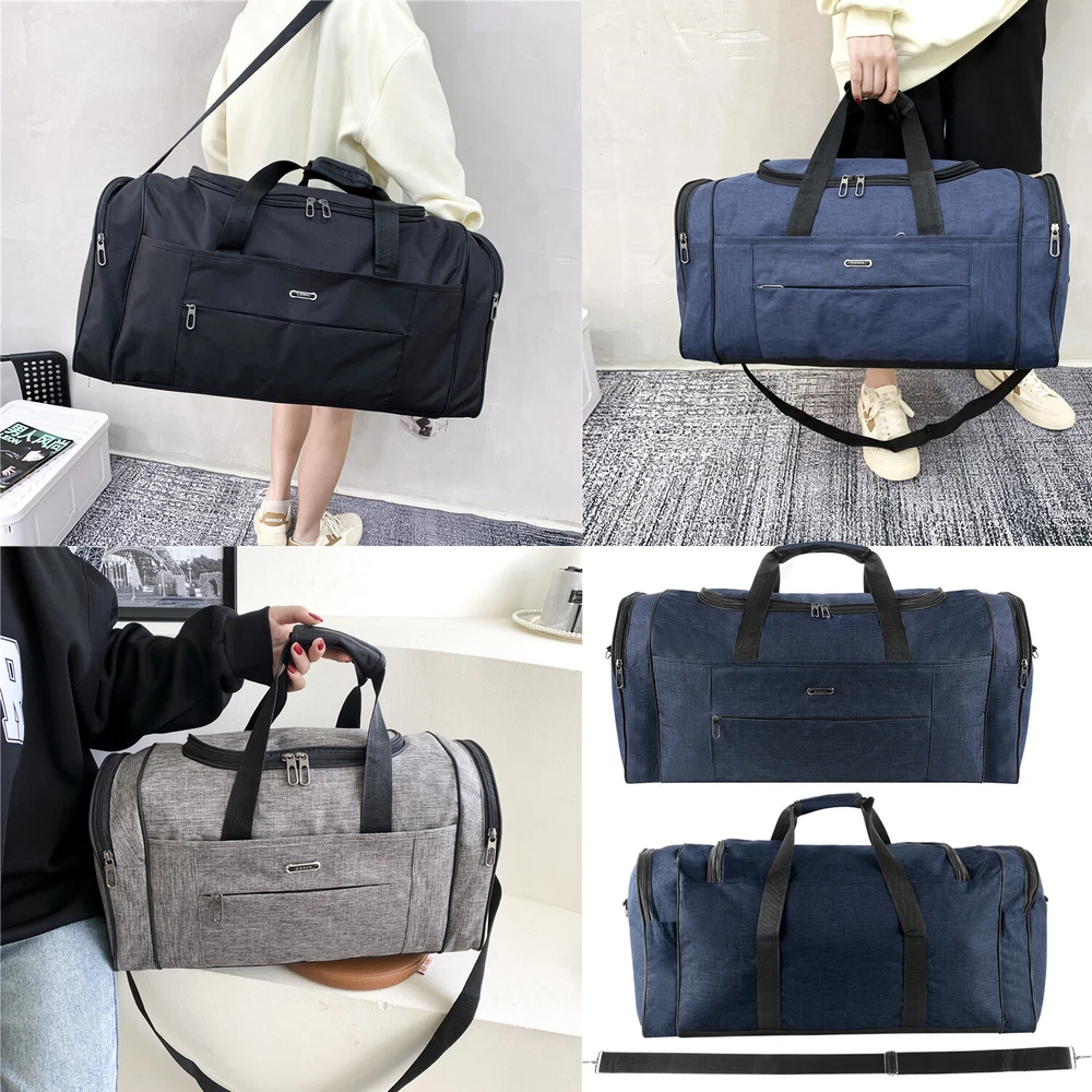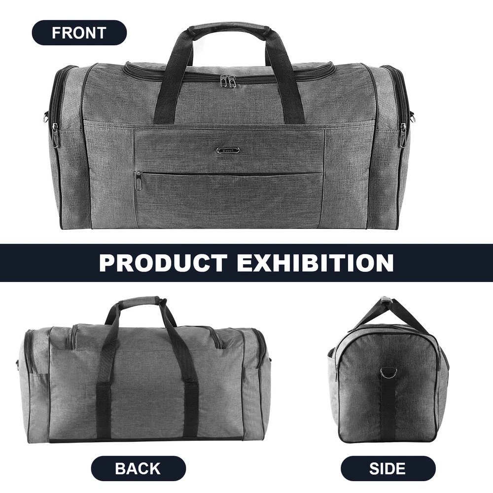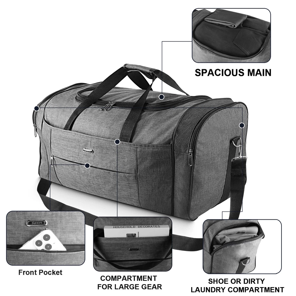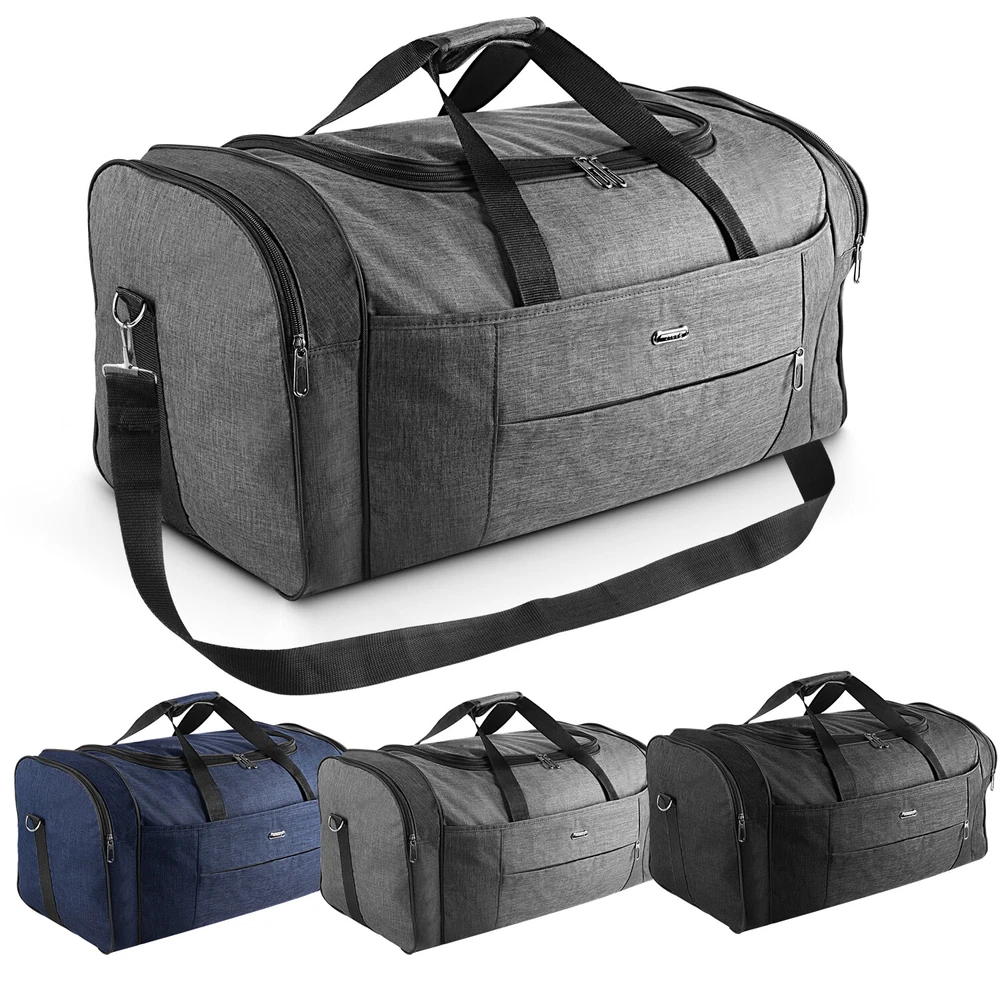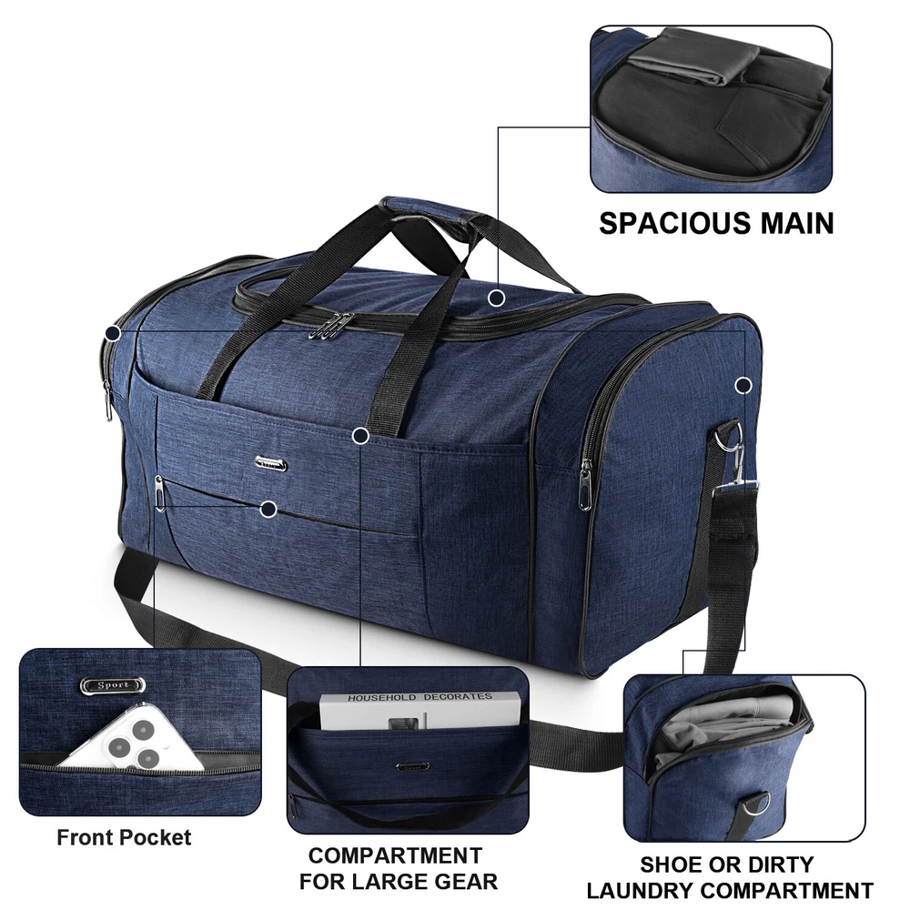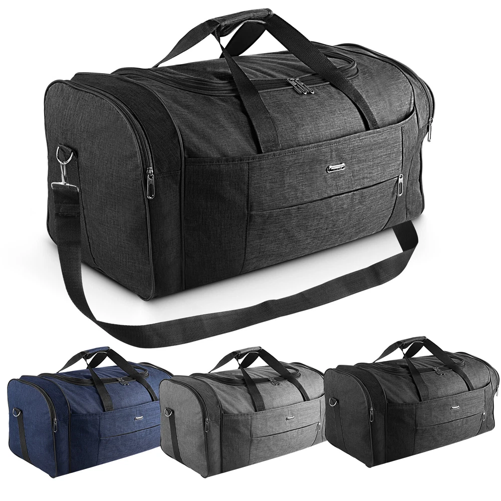 Description Multipurpose:This duffel bag is extra large and can be served as a sports, gym, luggage, weekender bag, oversize travel bag, military duffle bag, overnight bag, camping, airplane duffle or even household storage bag. It is suitable for women and men of all age. Detail Oriented Design:Men's weekender travel bag padded handles and an adjustable shoulder strap for carrying comfort and versatility. Lots of pockets and convenient Mesh string nets for handy storage. Foldable and Spacious:Huge luggage traveler bag can be fast folded into itself . It takes a little space while have a huge up-to 60 Liter capacity to be used as a backup overnight storage bag in case your suitcase swells up. Durable and Lightweight:Overnight travel duffel bag is 26.3" X 10.6" X 14.5"in size. Made out of high quality Oxford PU450 fabric.It is water wear, tear resistant and build to last. Package: 1*Overnight travel duffel bag