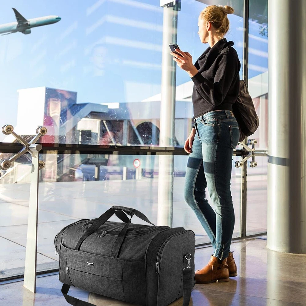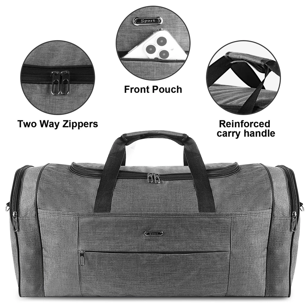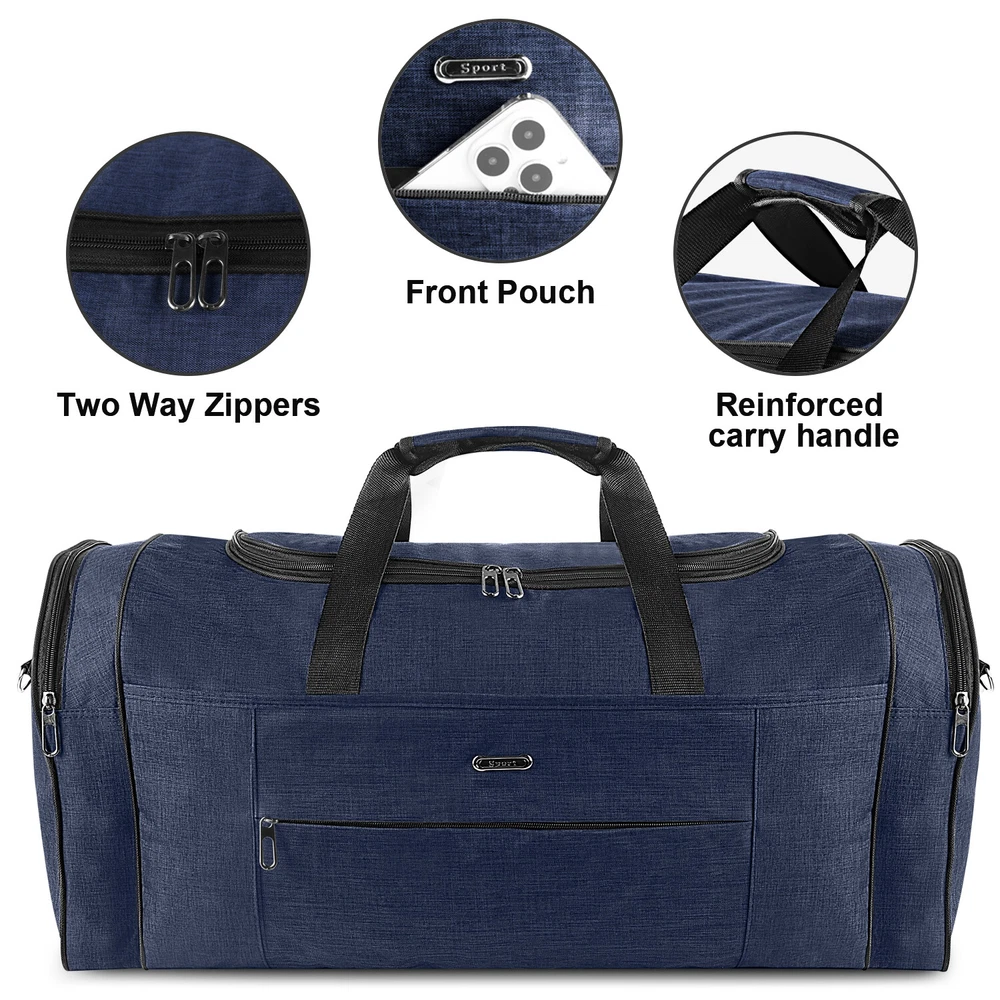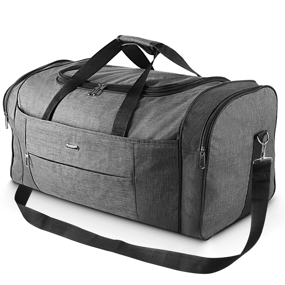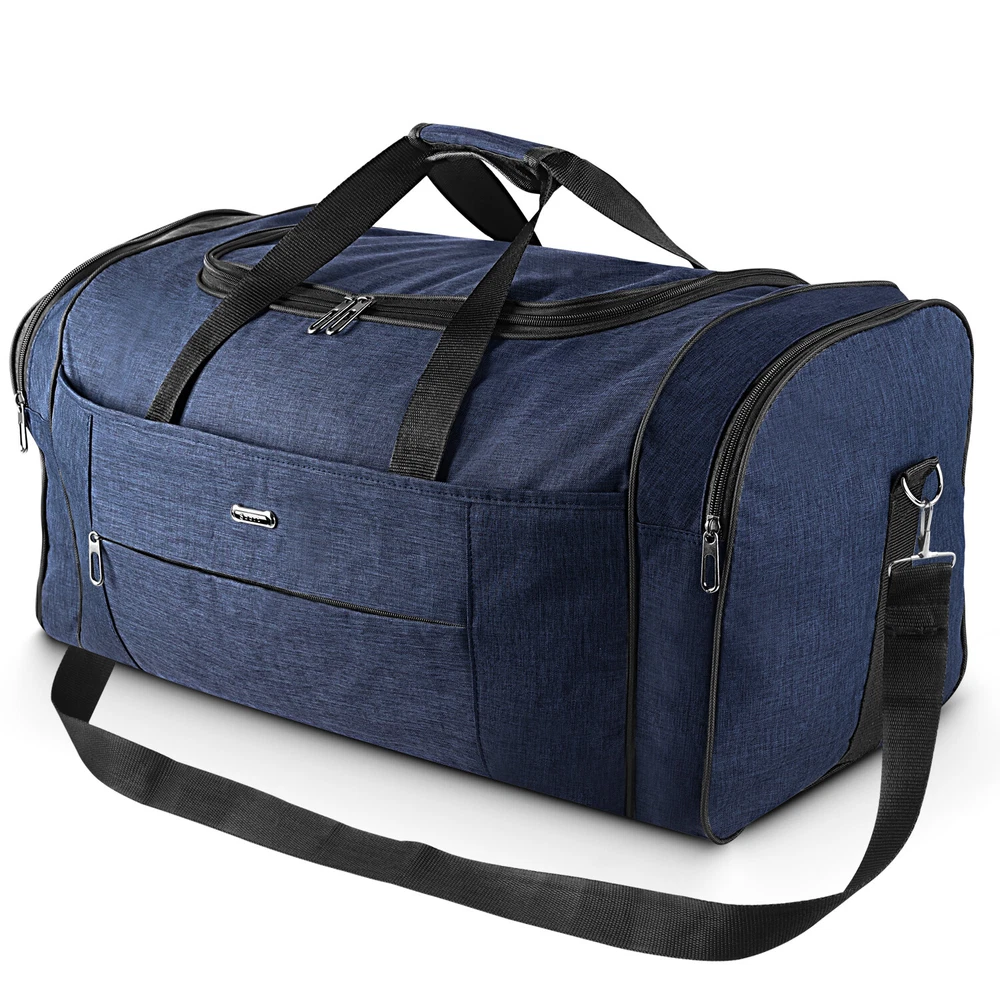 Description Multipurpose:This duffel bag is extra large and can be served as a sports, gym, luggage, weekender bag, oversize travel bag, military duffle bag, overnight bag, camping, airplane duffle or even household storage bag. It is suitable for women and men of all age. Detail Oriented Design:Men's weekender travel bag padded handles and an adjustable shoulder strap for carrying comfort and versatility. Lots of pockets and convenient Mesh string nets for handy storage. Foldable and Spacious:Huge luggage traveler bag can be fast folded into itself . It takes a little space while have a huge up-to 60 Liter capacity to be used as a backup overnight storage bag in case your suitcase swells up. Durable and Lightweight:Overnight travel duffel bag is 26.3" X 10.6" X 14.5"in size. Made out of high quality Oxford PU450 fabric.It is water wear, tear resistant and build to last. Package: 1*Overnight travel duffel bag