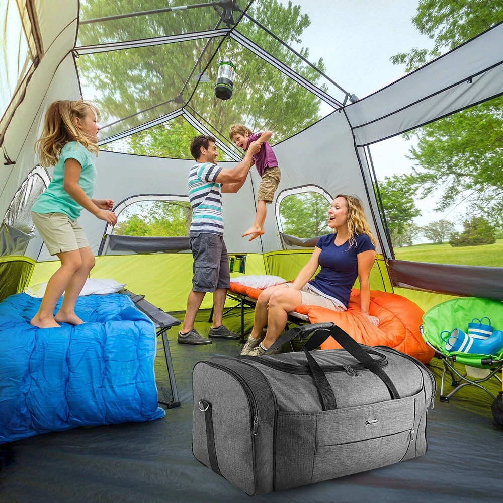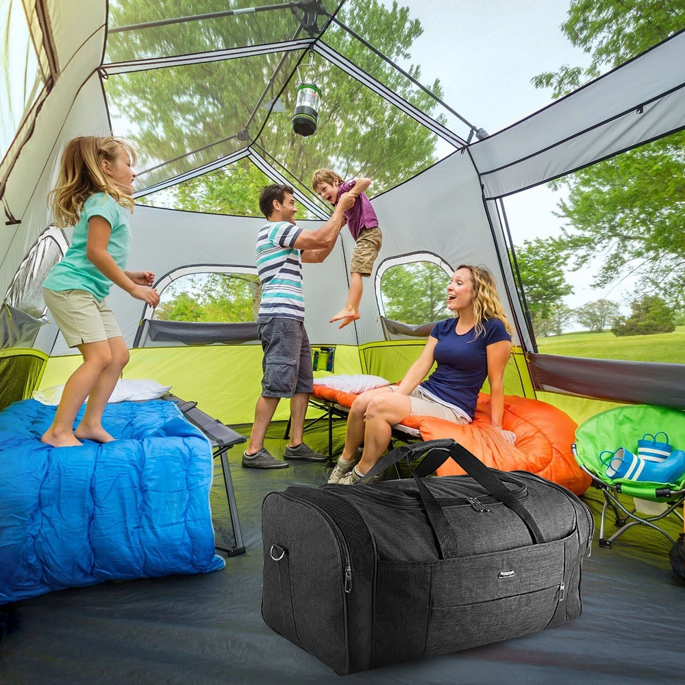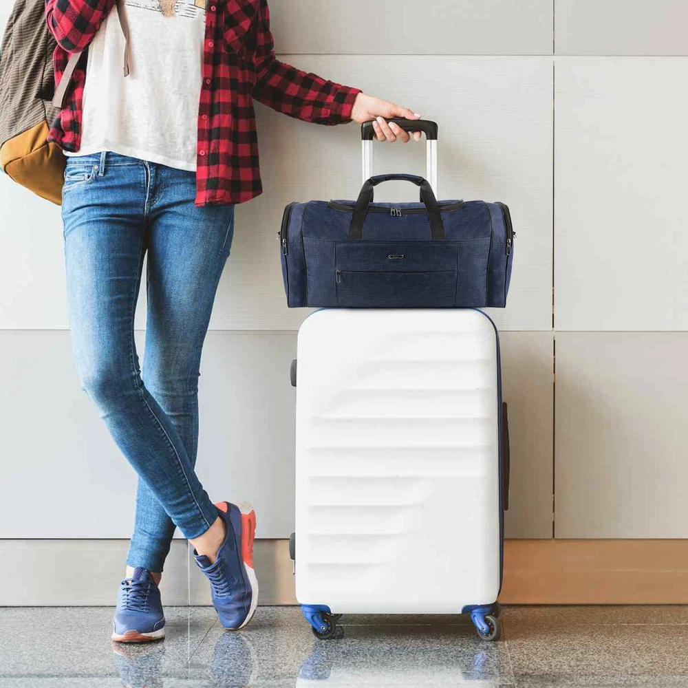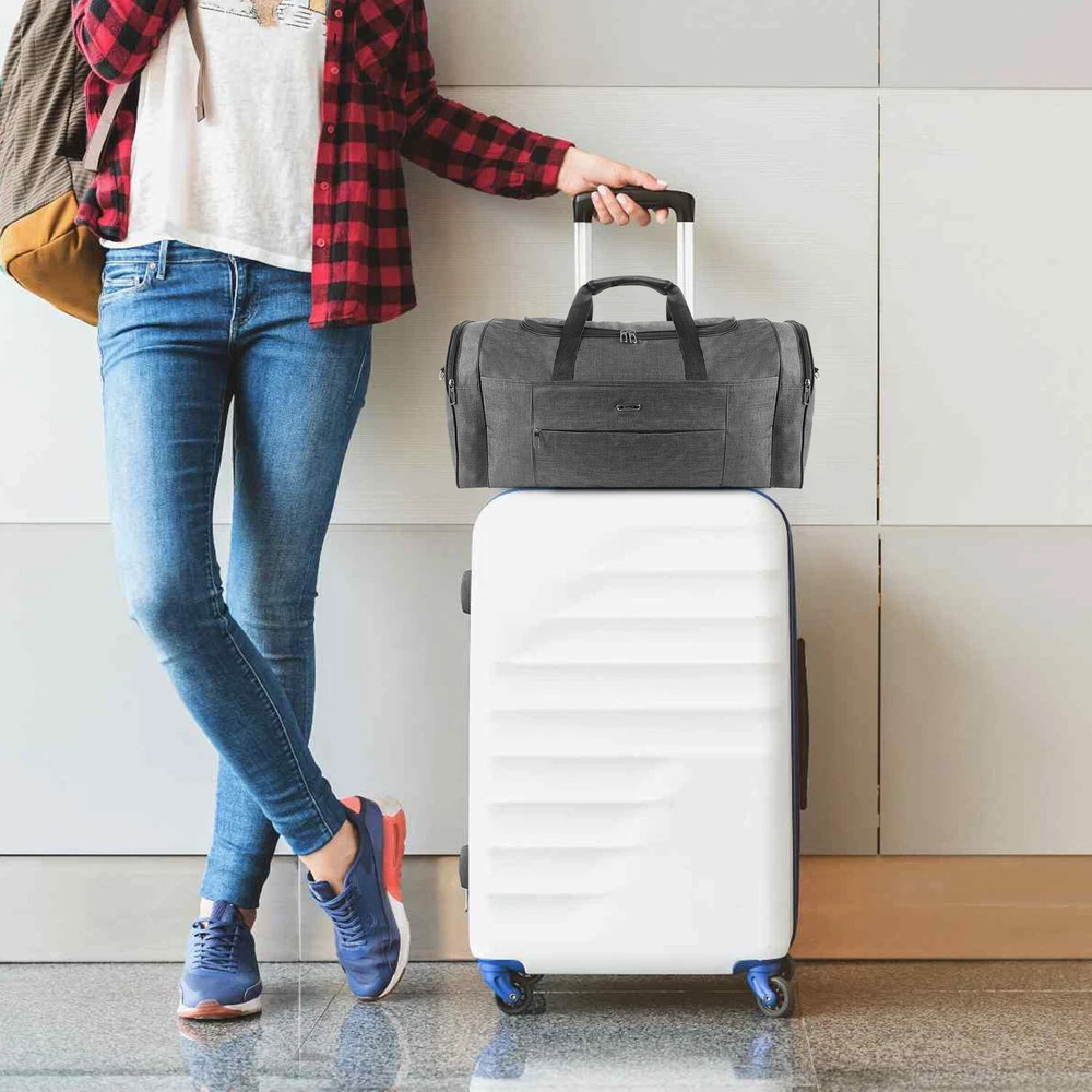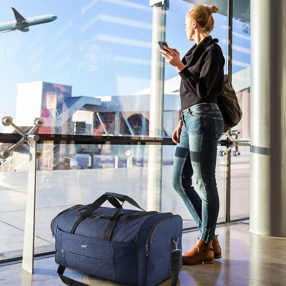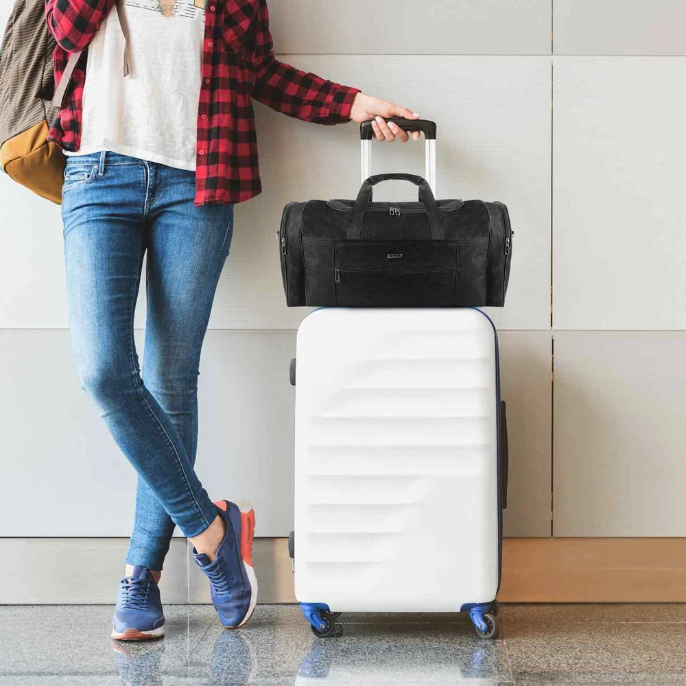 Description Multipurpose:This duffel bag is extra large and can be served as a sports, gym, luggage, weekender bag, oversize travel bag, military duffle bag, overnight bag, camping, airplane duffle or even household storage bag. It is suitable for women and men of all age. Detail Oriented Design:Men's weekender travel bag padded handles and an adjustable shoulder strap for carrying comfort and versatility. Lots of pockets and convenient Mesh string nets for handy storage. Foldable and Spacious:Huge luggage traveler bag can be fast folded into itself . It takes a little space while have a huge up-to 60 Liter capacity to be used as a backup overnight storage bag in case your suitcase swells up. Durable and Lightweight:Overnight travel duffel bag is 26.3" X 10.6" X 14.5"in size. Made out of high quality Oxford PU450 fabric.It is water wear, tear resistant and build to last. Package: 1*Overnight travel duffel bag