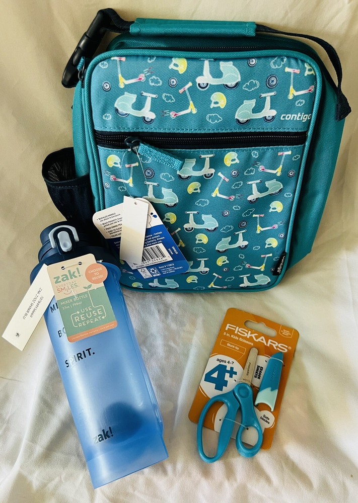 Contigo: Keep their lunch ready to eat with the Contigo® Kids Insulated Lunch Box, Blue Poppy Little Dino Herd Graphic. Whether they're the type that eats their meal all at once or takes it slow and saves for later, these insulated lunch boxes will keep their food at the perfect temperature until they're ready to chow down. Got a messy eater? No worries, this kids' lunch box is easy to clean—just wipe down the interior and spot clean the exterior. Plus, it's got an liner to help resist odor and keep stains away.* The best part? There are matching water bottles (sold separately) in equally fun and colorful patterns so you can be sure your child will hit the cafeteria in style. Zac Shake it up with a mixer bottle for your workout routine! The bottle has a wide mouth opening that is easy to fill, so you can easily pour in flavor mix-ins or protein powder. The included mixer ball helps stir everything up so it is evenly distributed, and the chug opening is perfect for quenching your thirst. With a button release and flip-up latch, the lid is easy to open with one hand but can be locked shut to prevent it from opening accidentally, so you can put it in your gym bag and travel worry-free. This Zak Designs mixer bottle has a large capacity of 27 fluid ounces and is made from durable, BPA-free plastic, which is easy to clean in the dishwasher. Do not microwave. Fiskars Every child is a creative genius, and Fiskars® Blunt-Tip Kids Scissors are thoughtfully designed for small hands and creative minds. These kids' scissors have safety-edge blades, a blunt tip for added safety, and a handle specially engineered for kids, all in bright colors they love. Teachers and parents love how easily the blades cut through all classroom materials, as well as the blades' innovative, safety edge with a safer blade angle. The larger finger loop and ergonomic thumb loop provide a natural, more comfortable fit for kids' fingers. An optimized opening angle helps kids open the blades without losing their grip for improved control. Additionally, the scissor handle is built to be in line with the blades to allow for better precision while cutting paper and other art materials in the air. These scissors are ideal for children four and up because every creative genius deserves the right scissors at the right age to express themselves.