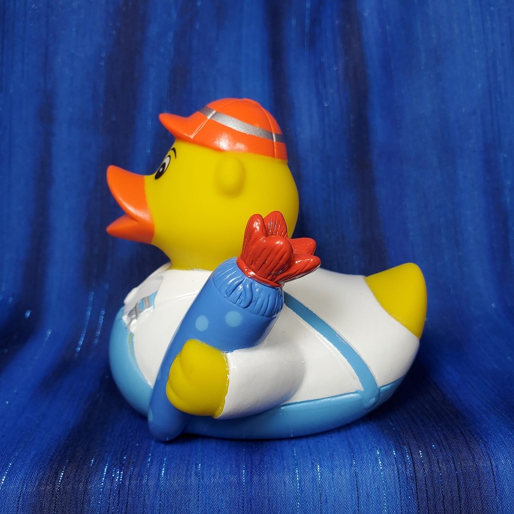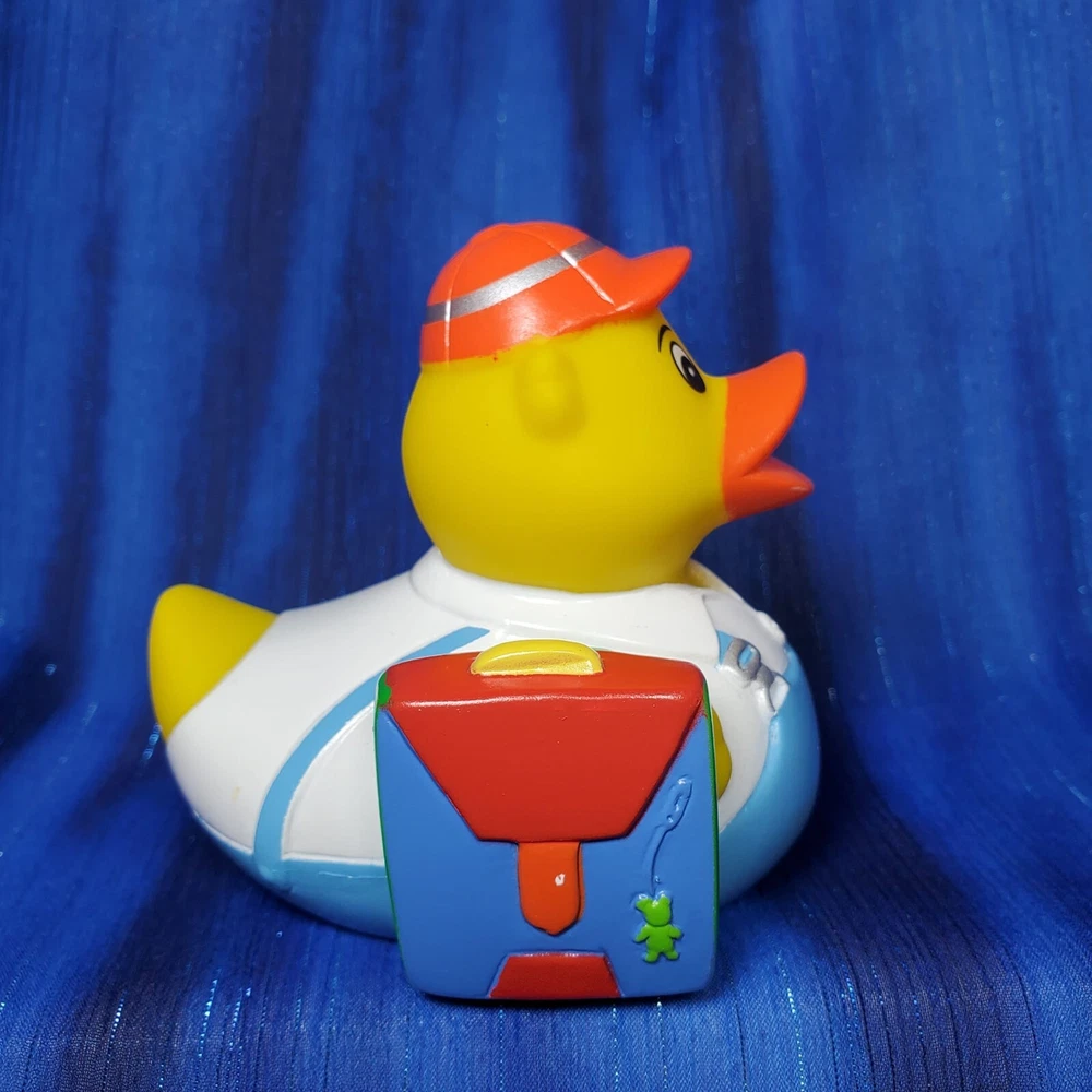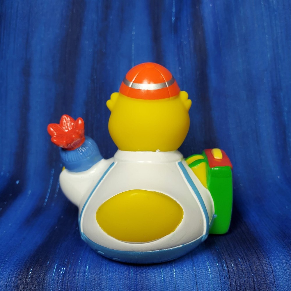 A bookbag full of school supplies and a gift for his teacher and he's all ready for the first day of school. Dimensions: Bill to Tail: 3.2" W: 3.25" H: 3" Squeaks: No Sealed: No Swims upright: No Material: Vinyl. Lead free and phthalate free. Age recommendation: 3-99 One (1) Back to School Boy Rubber Duck from Schnabels per unit.