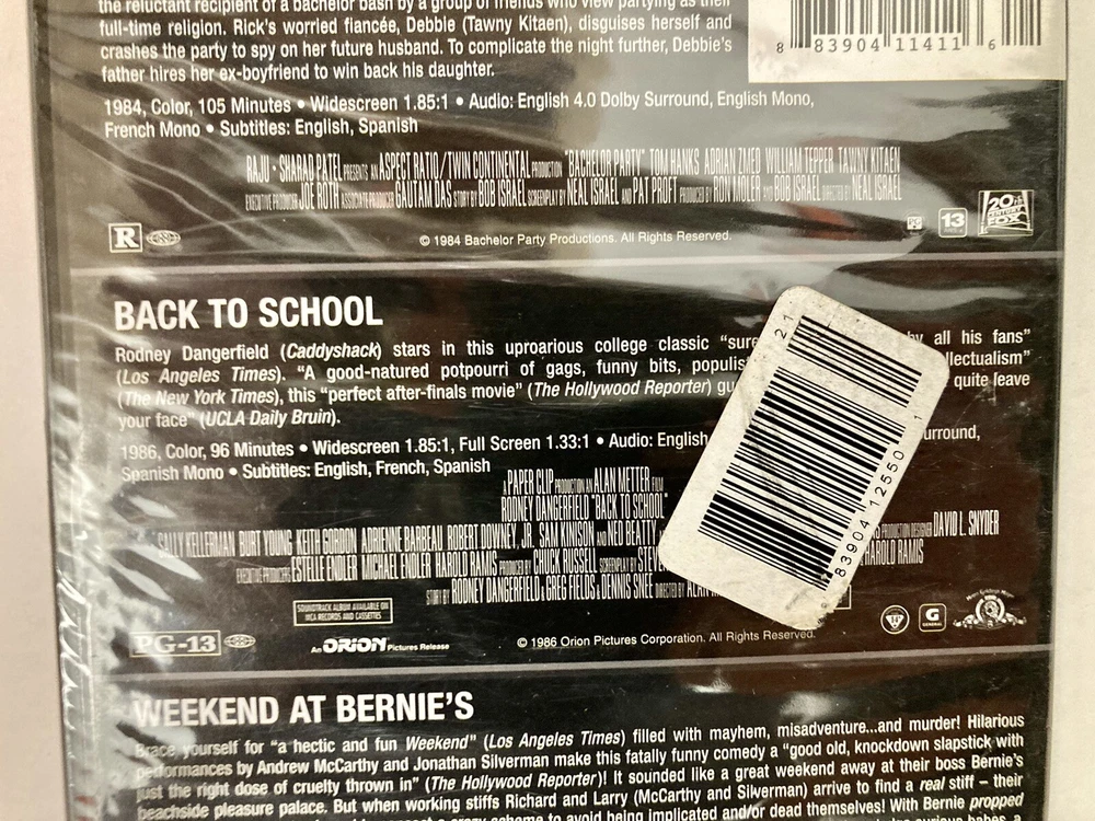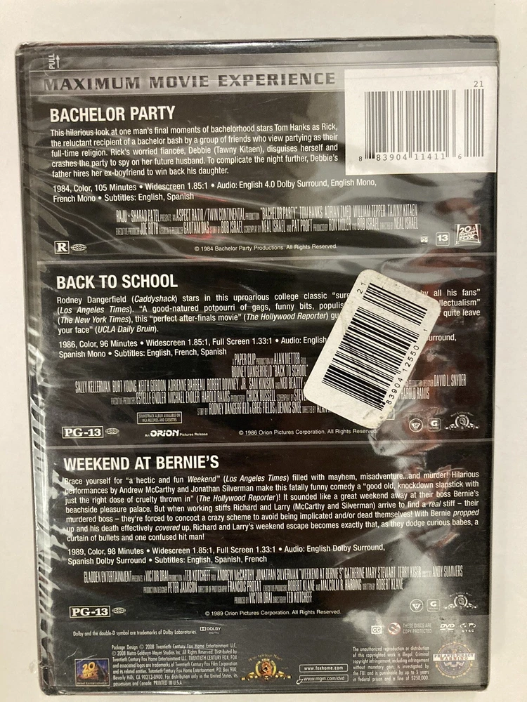 BACHELOR PARTY / BACK TO SCHOOL /WEEKEND AT BERNIES TRIPLE FEATURE DVD (3 DVD'S) ITEM IN PICTURES WILL BE EXACT ITEM YOU RECEIVE. BUY WITH CONFIDENCE. ANY QUESTIONS, PLEASE REACH OUT AHEAD. THANK YOU FOR THE BUSINESS!!