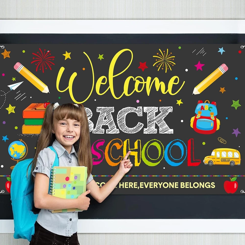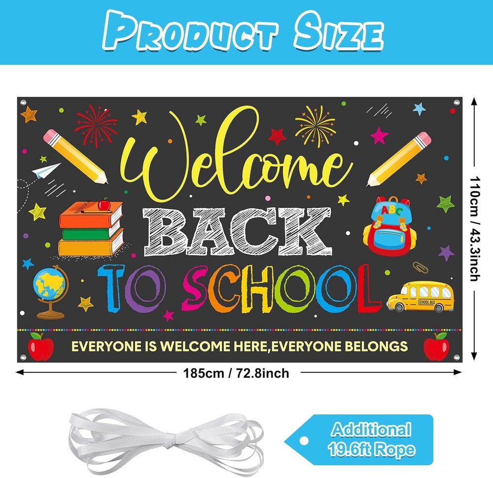 Free eBay listing template designed by dewiso.com Welcome Back to School Backdrops, Welcome Back Bulletin Board Back to School Banner Sign Hanging Polyester Photography Background for First Day of School Classroom and Office Decorations,73x44 Inch FREE AND FAST SHIPPING! About this item Package Include: comes with a welcome back to school backdrop banner and a rope, the backdrop measures about 185 x 110 cm/ 73 x 44 inches, the rope measures 19.6 ft/ 6M long, which can be easily hung on the wall, door or anywhere you want,very suitable first day of kindergarten preschool classroom and office decorations. Easy to Hang: this back to school photo booth background with grommet hole on the 4 corner and the rope string can easy to hang through the copper grommet, for you to hang it up conveniently, you can easily make interesting welcome back backgrounds to take photos. Reliable Material: the welcome back to school bulletin board is made of polyester oxford fiber, which is soft, light in weight, easy to wash and clean, is not easy to break and fade,easy to carry. the color is vibrant color and print very clear. Stylish Design: this welcome back to school decoration backdrop designed with school bus, pencil,school bag, globe and other related element in fun design, printed with “everyone is welcome here,everyone belongs” letters,adds a lively atmosphere for students and teachers to create meaningful and unforgettable memories. Wide Application: this welcome back to school backdrop banner sign is suitable for first day of preschool primary school classroom and office decorations. You can hung in on fences, trees, walls, blackboards, shelves, as a background for photo booths or tablecloths, and this welcome backdrop will make your party interesting. Product We offer a 30-Day Return Policy on items which you are not completely satisfied with. You have the option for a full-refund or an exchange of the item. No returns are available on items shipped outside of the US . Shipping We offer Free Shipping to the US and ship within 2 business days of payment, usually sooner. We use UPS express shipping. That's why your products are usually delivered within 3 days . Contact We try our very best to make sure every customer is completely satisfied. If there's a problem , message us! We're happy to help. 24/7 live chat available.