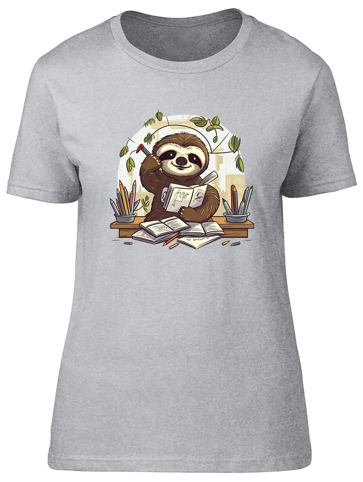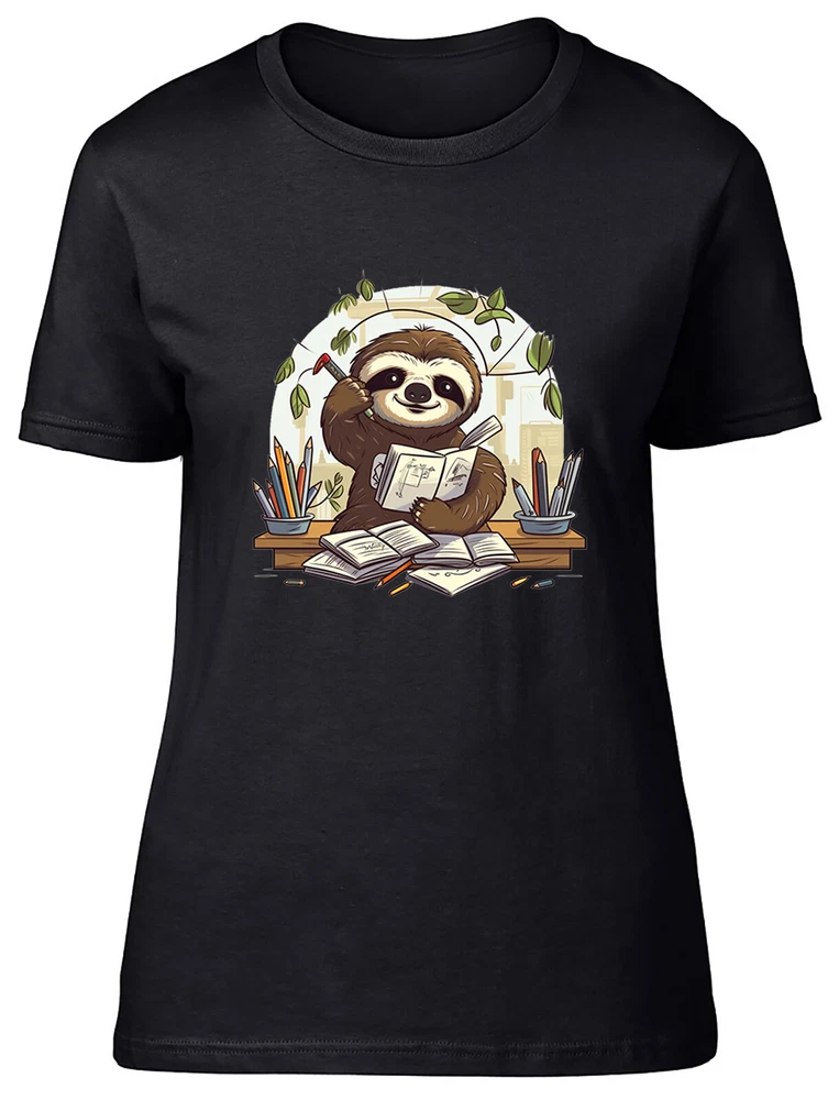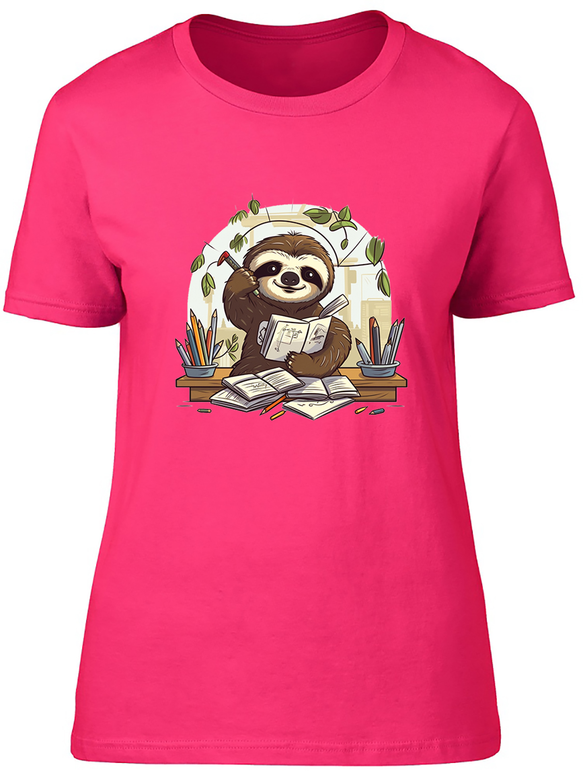 Back to School Womens T-Shirt Sloth Books Pens Stationary Ladies Gift Tee