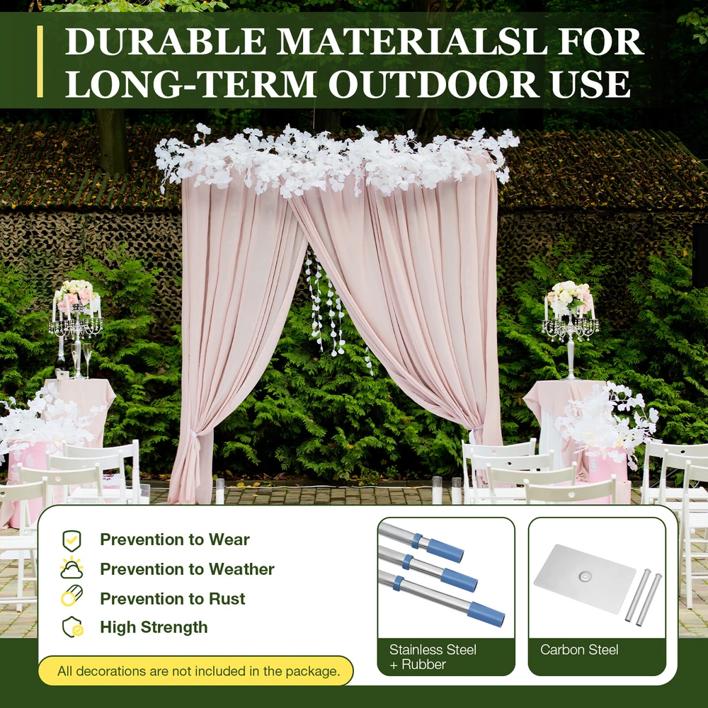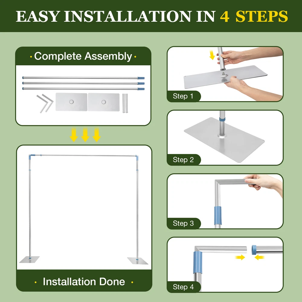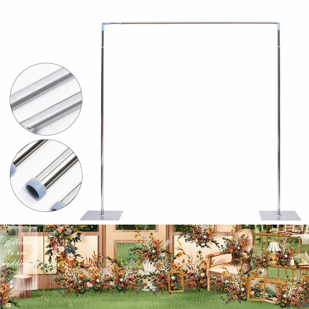 Backdrop Stand Pipe Kit,10'x10'/3*3M' Heavy Duty Background Support System SALE Description The wedding is one of the most important occasions in everyone's life. In such a grand scene, a more practical and exquisite decorative backdrop stand can match your wedding! Our large-sized backdrop stand can meet your needs. The higher and wider dimensions, combined with the expandable design, can be suitable for various occasions. You can decorate it with flowers, green plants, balloons, tulle, etc., making it a dreamy and romantic background, opening the door to a happy marriage for you! Key Features DIY Decoration: The minimalist framework design allows you to create a unique background according to your preferences with decorations such as flowers, greenery, balloons, tulle, or lamp strings, providing more space to showcase your imagination and creativity. Large Size: 9.8 * 9.8 feet in size can create a luxurious atmosphere for your party venue, providing you with a wide range of decorative effects and making it an ideal background for weddings, birthday parties, and other occasions. Telescopic Design: It adopts a telescopic rod design, allowing its height(4.9-9.84ft) and width(4.9-9.84ft) to be adjusted according to your needs, which is suitable for more occasions. High-quality Material: It uses stainless steel and carbon steel, combined with baking and polishing processes, with high strength and hardness, and can perform well for a long time even in outdoor environments. Strong Stability: Two 15.7*9 inches bases increase the contact area with the ground, making it easy to place heavy objects such as sandbags(not included). Combined with thick materials (1mm) and thickened support pipes(1.1in), they achieve a maximum load-bearing capacity of about 22 lbs. You can confidently decorate it with many flowers and balloons. Multi-functional: In addition to using it as an accessory, you can also use it in the flower garden or backyard to help vine plants grow and create a more beautiful garden or vibrant vegetable garden. Easy to Install & Store: The simple structure allows you to complete the installation in a short time without the need for other professional tools or components. When you finish using it, you can break it down and put it in your storage bag for easy reuse. Exciting Memories: This rectangular stand brings more fashion and elegance to your happy moments and holiday occasions, and showcases your unique style. Now use it to create some unforgettable moments! Protective Packaging: This product comes in a custom foam and bubble wraps that resist common compression and falls to prevent product damage in transit as much as possible. Details Rubber Connection: The rubber sleeve used to connect stainless steel pipes and connecting rods can increase the friction between the two, ensuring a secure connection. Smooth Surface: The polished stainless steel pipe surface is smooth and free of burrs, giving you a safer use. Application It is ideal for decorating your parties, receptions, bridal showers, weddings, proposals, engagement parties, anniversaries, Christmas, birthdays, Thanksgiving, Halloween, New Year, baby showers, graduation parties, etc. with decorations such as flowers, greenery, balloons, tulle, balloons (not included). It can also be placed in your garden, nursery, or backyard to help grow vine plants. Specifications Color: Silver Material: Stainless Steel, Carbon Steel, Rubber Style: Modern Shape: Rectangular Mounting Type: Free Standing Surface Treatment: Polishing, High-temperature Baking Paint Assembly Required: Yes Load Capacity: About 10kg/22lbs Each Pole Length: 1.58-3m/5.18-9.84ft Each L-shaped Fitting Size: 17*17cm/6.7*6.7in Each Straight Connecting Fitting Length: 25cm/10in Wall Thickness: 1mm Pipe Diameter: 28mm/1.1in Each Base Size: 40*23cm/15.7*9in Overall Size (L*H): 1.5*1.5-3*3m/4.9*4.9-9.84*9.84ft Gross Weight: 9.5kg/21lbs Net Weight: 8.5kg/19lbs Package Size: 165*26*11cm/65*10.23*4.3in Package Included 3*Poles 2*Bases 2*L-shaped Fittings 2*Straight Connecting Rods 1*English Installation Instructions Notes 1. Please carefully read the manual and strictly follow the precautions to have a better experience. 2. Please note that this product does not include flowers or other decorations displayed in the pictures. 3. Please note that for better stability, it is usually not necessary to set it to the maximum length and height. 4. Please install it on flat ground and place sandbags (not included) on each base in windy outdoor weather to further enhance its stability. 5. Please allow the slight color difference caused by the shooting light and 1-3cm error due to manual measurement, and make sure you do not mind before you order. Payment Delivery details Terms of sales About us Contact us Payment We accept ebay payment 。 Fees such as import duties, taxes are not included in the item price or shipping costs. These charges are the buyer's responsibility. Delivery details Shipping: 2-9 working days to: USA Terms of sales We maintain high standards of excellence and strive for hundred percent customer satisfaction. Feedback is very important to us. We hope that you contact us immediately before you give neutral or negative feedback, so that we can address your concerns. It is impossible to address issues if we do not know about them! About us Your satis faction is our ultimate goal. We work hard to earn your trust and future business. Our certified technicians have tested each item before shipping. The unit comes with 1 year limited warranty on all manufacturing defects. a) If you receive a defective item, you may return it or ask for a discount. Please contact us within 14 days after you receive the package. b) What you returned must be intact and in its original packaging as re? u. Customer is responsible for shipping costs of the returned item. c) We will cover the cost of shipping back t with the shipping rate indicated in the registration page. We will send you a new u