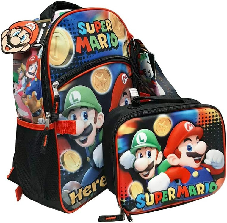 Super Mario Bros backpack set includes a 16" Super Mario Brothers backpack with reinforced webbing on the back, two mesh side pockets & front pencil case zip pocket, and a soft Mario lunchbox. This 16" elementary school backpack has a roomy main compartment for folders, & notebooks. The front zip pocket keeps school supplies organized. Includes an insulated Mario lunch bag – the included lunchbox can be attached to the front of the backpack with side velcro tabs for hands free travel to and from school. The straps adjust as kids grow, this cute backpack set is great for kids who love the Mario Bros video game. Make going back to school more fun with the familiar comfort of their favorite characters! For kids ages 5+.