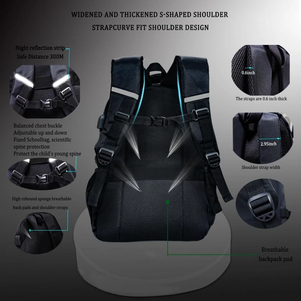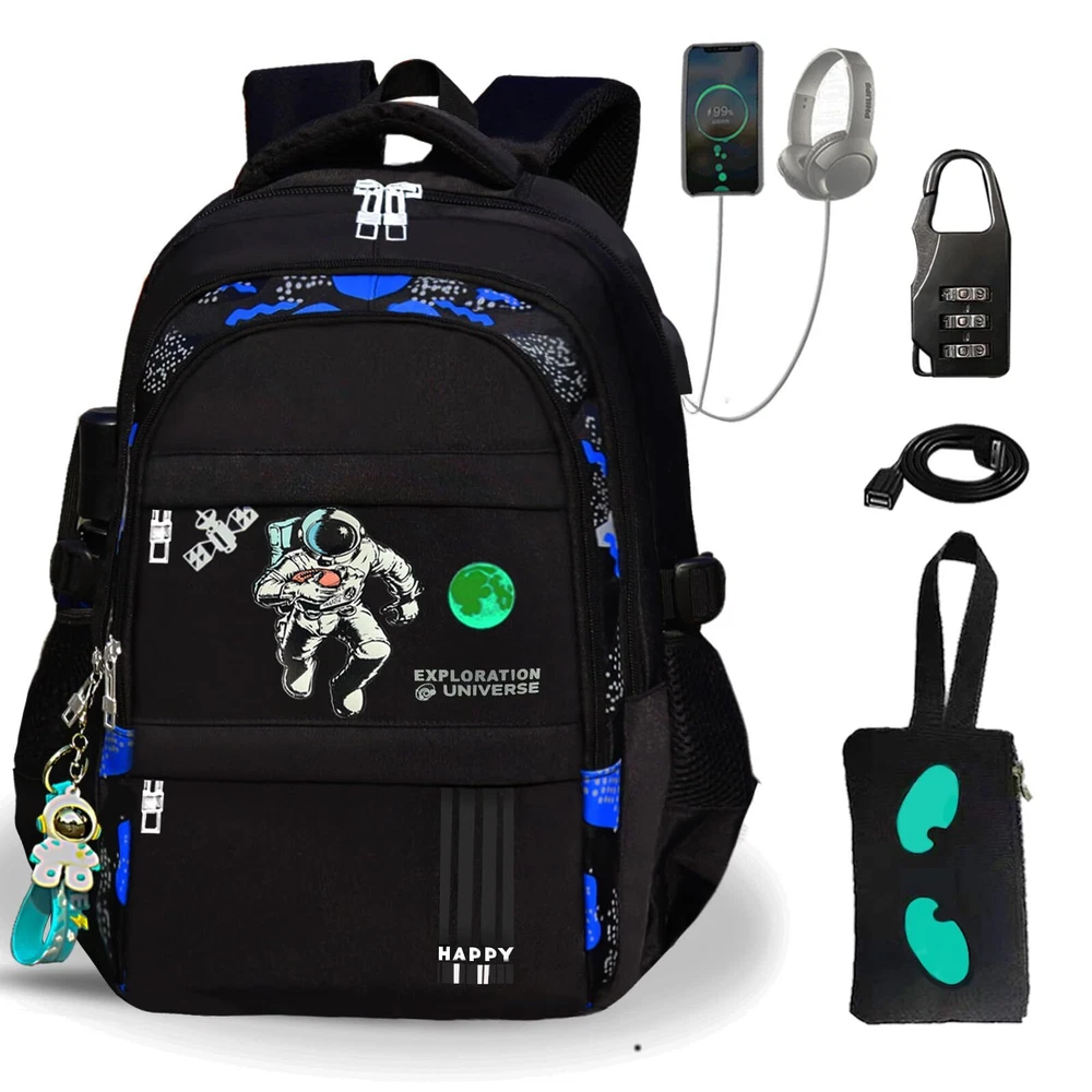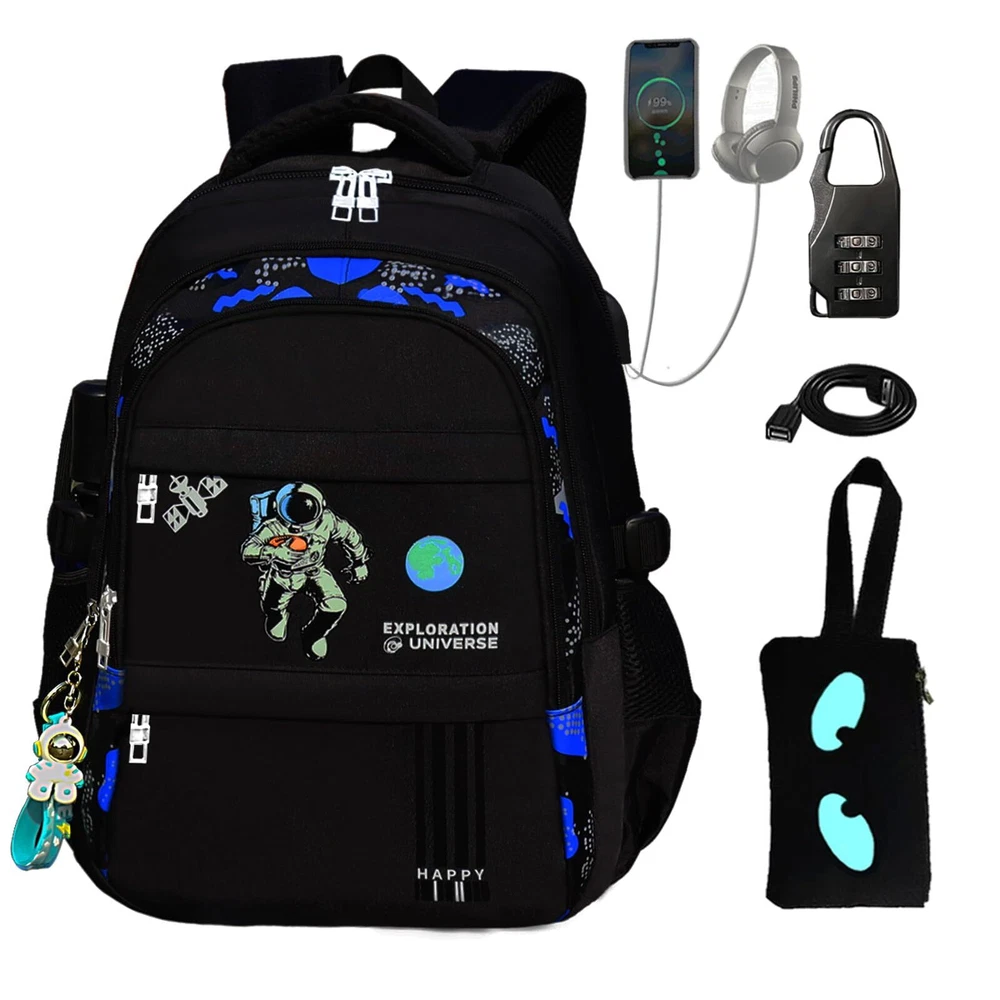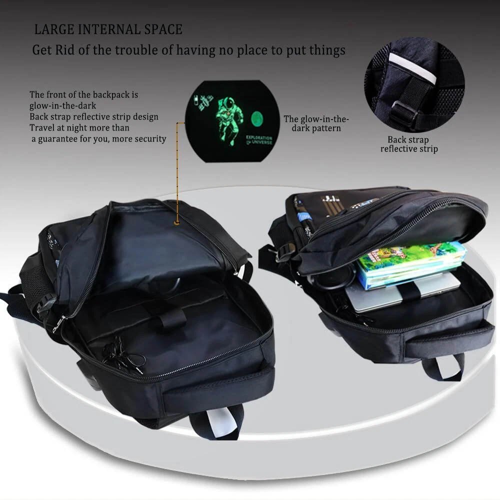 Description Space Backpack.Anime Cartoon Luminous Backpack with USB Charging Port, Headphone port.Water Resistant.Large Capacity Laptop Back Pack,Glow-In-The-Dark Backpack.With Anti-Theft Lock.Astronaut Pendant Astronaut Pendant 1.LUMINOUS BACKPACK:Boys backpacks for elementary school with High quality oxford fabric water repellent fabric; does not fade, odorless, environmentally friendly and healthy. this can protect your inner things from drizzling.,backpacks teens The best part of this anime backpack is after absorbing light in the day about 10-20 minutes, you can see the fluorescent effect in the dark and it can keep about 4-6 hours.boy backpack it is safer to walk at night 2.ERGONOMIC DESIGN: school backpack boys Meet the ergonomic design widened s-shaped cellular mesh adjustable shoulder strap you can adjust its length to suit your height and body construction. ease the pressure on the shoulder, thickened back pad high breathable mesh design, backpack school effective protection of the spine, not stuffy, back more comfortable 3.LARGE CAPACITY ;this back-to-school set there are 3 large capacity main bags and 2 front pocket and 1 ipad compartments ,anti theft backpack 1 the large main compartment fits a 15.6inch laptop ,2 front pocket which can hold pens, keys, small notebooks and other small items, 2 Side pockets, can hold any size of cup, space Backpack compartment that is great to put your folder ,Camouflage pattern is sutable for boys.fashion and personality make you stand out from the crowd 4.USB DESIGN: Astronaut backpack built-in USB port is convenient to charge your electronic devices with ease while on the go. There is not only a USB port, but also a headphone port. Put the charging pad in the bag to connect the data cable to charge your electronic device or mobile phone anytime and anywhere. Free Hands, listen to music anytime and anywhere, especially suitable for cycling, trains, hiking, camping, commuting by subway, It's also the perfect birthday present, Christmas present 6.SECURITY PROTECTION: Double-end zipper anti-theft lock combination no more worrying about someone opening your bag while you wait in line valuables were stolen OUR SERVICE GURANTEE FOR YOU:Everything I do is based on customer satisfaction. If you are not comletely satisfied with the purchased product or the product is damaged or broken in transit, please contact us in time. We will solve your problem as quickly as possible!