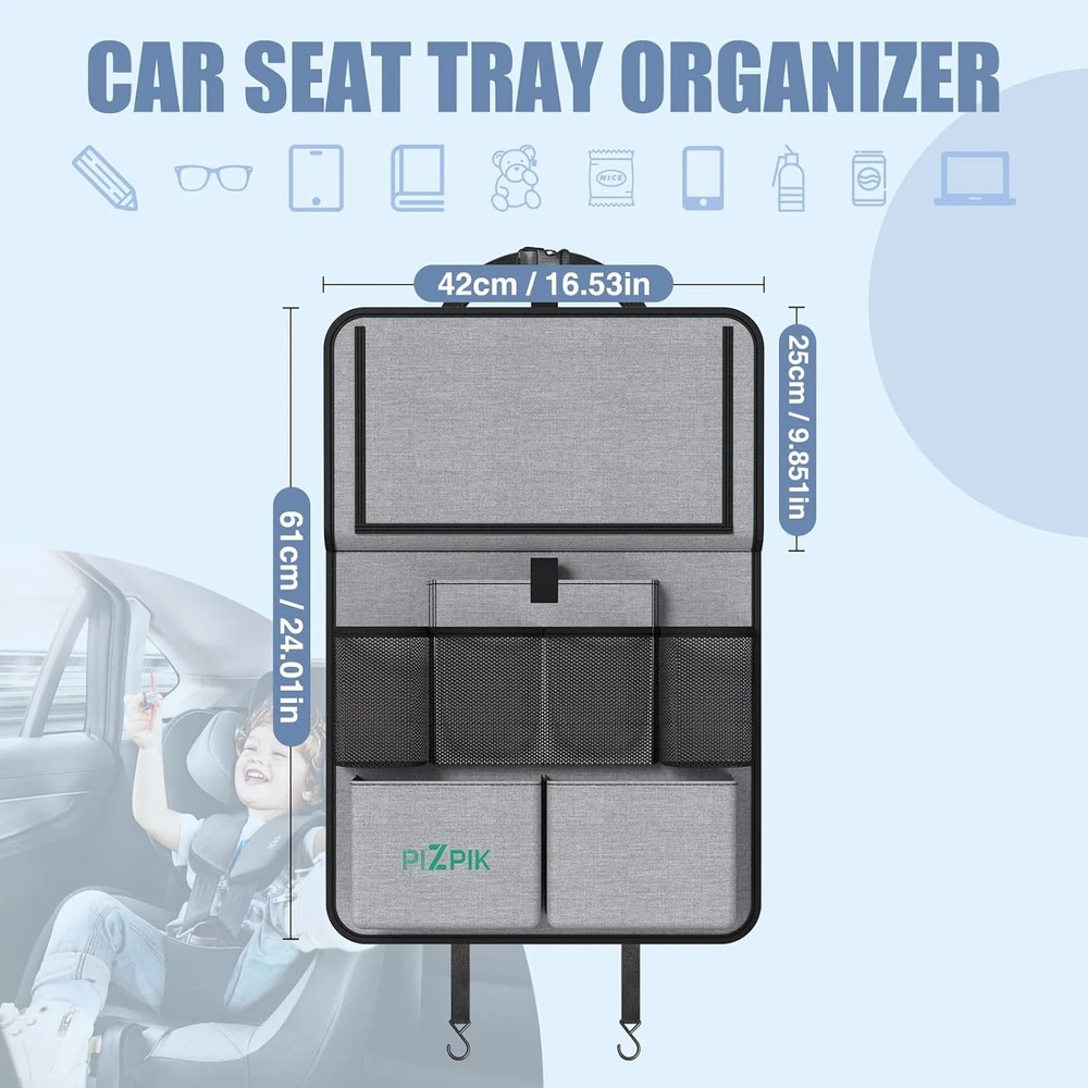 About this item 【COLLAPSIBLE TRAY ORGANIZER】The car back seat organizer with a collapsible table stand can keep cluttered spaces organized. A child's dining table, a desk for drawing, or a table for a laptop. Create an enjoyable dining and entertainment haven for kids while keeping the car tidy. When not in use, the table stand can be stowed away by velcro to save space. 3 MINUTES QUICK ASSEMBLY: Measures 10.24"D x 16.52"W x 23.62"H when unfolded. 【WIDER POCKETS】Our car seat organizer backseat features looser mesh fabric pockets that provide more storage space and easier access to items. The back seat organizer with tray is wider than other organizers on the market and can accommodate an iPad Pro, so your kids can enjoy watching TV on the road without getting bored. 【PLENTY OF STORAGE SPACE】The backseat organizer has 11 pockets of different Package Dimensionss and styles and comes with a foldable table stand, including a clear tablet pocket, a fabric pocket, a pen pocket, and a durable mesh pocket, wonderful for storing a variety of items such as toys, snacks, bottles, tablets, mobile phones, sunglasses, books, pens, and more. 【DURABLE 600D OXFORD】Say goodbye to cheap materials that tear easily. Our upgraded high-density oxford fabric car seat storage backseat is tear-resistant, with reinforced stitching to extend product life and reduce the frequency of product replacement. The car seat organizer material is waterproof and breathable without any odor, safe and harmless to children, and can be cleaned with just a quick wipe. 【WONDERFUL FOR TRAVEL】The back seat car organizer with tray is designed for car trunk organization. Whether you're a busy professional needing a mobile workspace, a parent looking for entertainment for the kids on a road trip, or someone wanting to keep tidy inside their car, our car snack organizer is the wonderful solution and a great present for friends and parents on holiday and for everyday organization. Package Dimensions: 10.24"D x 16.52"W x 23.62"H.