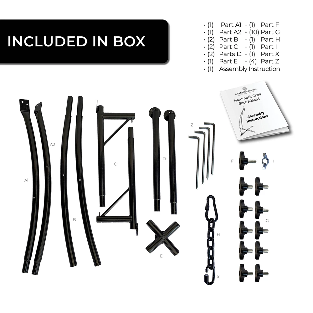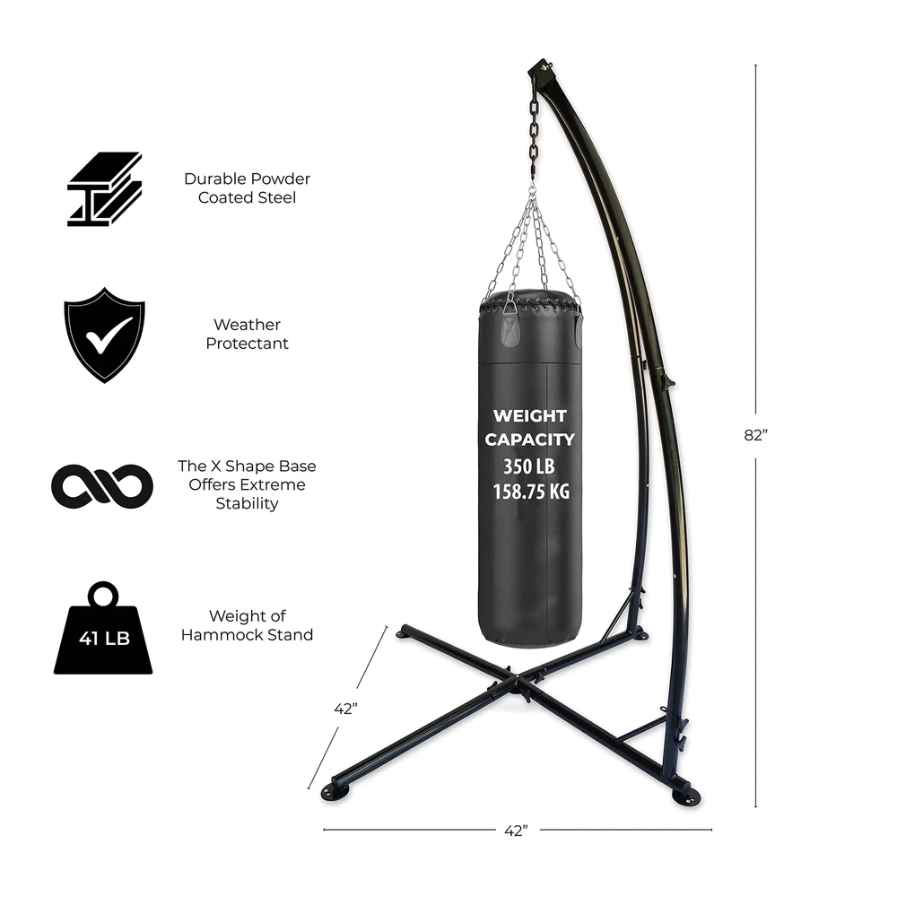 The Backyard Expressions X Base Hanging Chair Frame is a perfect match for Backyard Expressions Hammock Chairs or almost any other kind of suspended seating product. The X shaped base increases the stability of the stand and the 5/8 inch ground stakes easily and safely secure the stand in your yard. This stand now features no hardware assembly, meaning you can leave your tools in the shed. This product can be assembled in a matter of minutes without the use of any tools! Make your patio furniture exciting again with a Backyard Expressions Hanging Chair and Frame. DURABLE STEEL CONSTRUCTION - Rust-resistant coated steel is strong and long lasting both indoors and out. INNOVATIVE STURDY DESIGN - The "X" shaped base is a special design formulated through trial and error to find the sturdiest design to prevent tipping over. 350 LB WEIGHT CAPACITY - Our design offers a higher weight capacity than the industry standard VERSATILE FRAME - The Backyard Expressions hanging chair frame can be used for a variety of different hammock chairs, wicker hanging chairs and egg chairs. If it hangs this will work as the perfect stand for you! EASY ASSEMBLY: Assembly should take less than 10 minutes and take down is even easier. No tools are needed at all. DIMENSIONS: 42" W x 42" D x 82" H WEIGHT CAPACITY: 350 Lbs - The inner tag is labeled 250, but this is a misprint. Actual capacity is 350lbs.